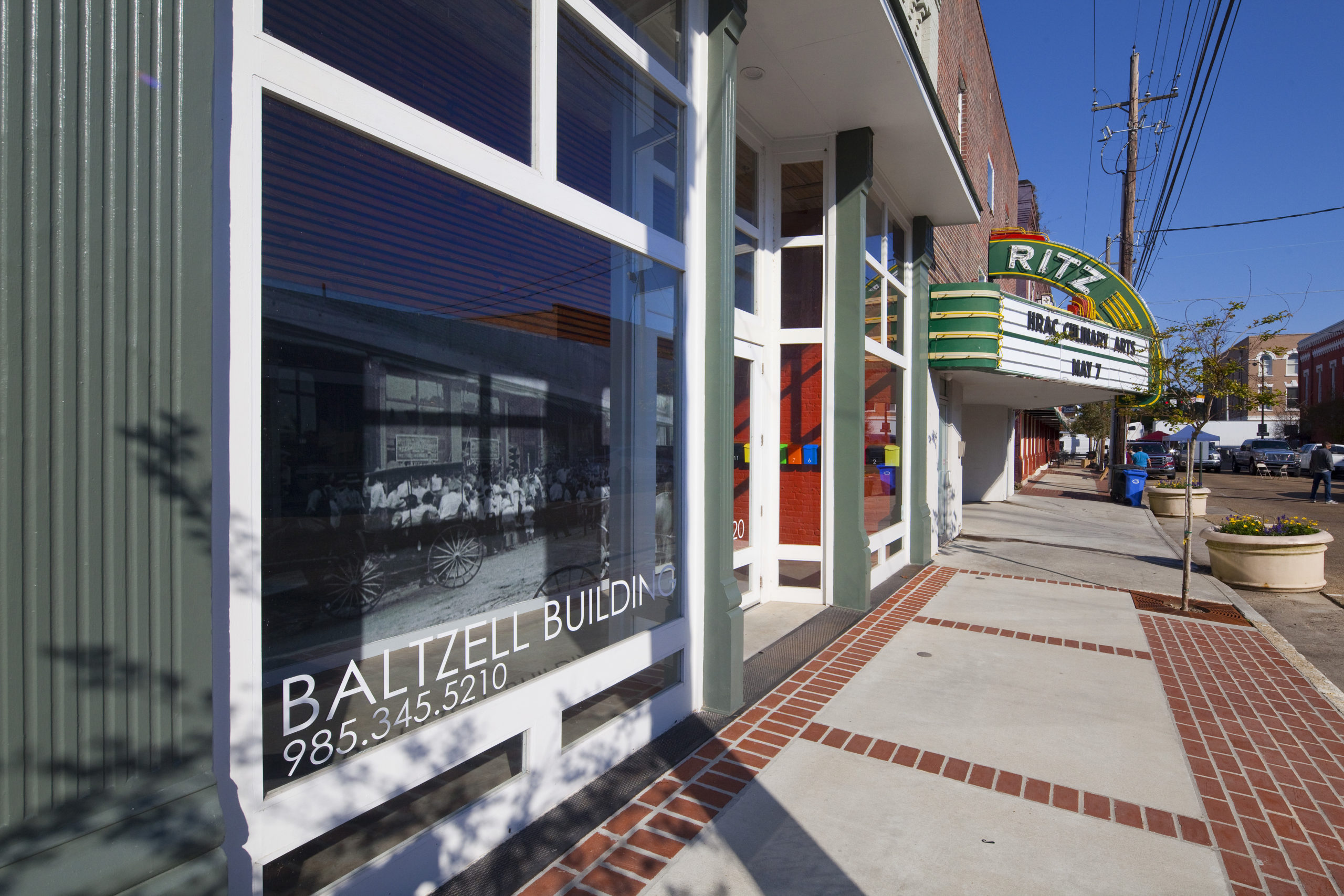 The Baltzell Building was first built in the late 1800s. It is located on what was referred to as the “Baltzell Block” in the historic downtown of Hammond, La. The Baltzell Building is one of the last historic buildings in the downtown area to be renovated. The building was first built as a two-story wood-frame structure, and it housed the Hammond Opera Company on the second floor. After a fire destroyed much of the building, the top story was removed, and the building was reconstructed as a one-story solid brick masonry structure with 15′ high ceilings. The fourth bay was later destroyed during another fire, except for the brick masonry, and it was never reconstructed. The building structure consists of a brick masonry wall that is continuous around all sides, with three brick masonry walls running east to west, dividing the structure into four bays. The east façade, running along Cypress Street, consists of four bays of wood storefront windows that continue up to 15′ with a brick masonry parapet wall above, featuring corbel detailing. The roof is a single slope that slopes toward the west, and the roof structure is made up of solid 2″ heart pine wood trusses.
