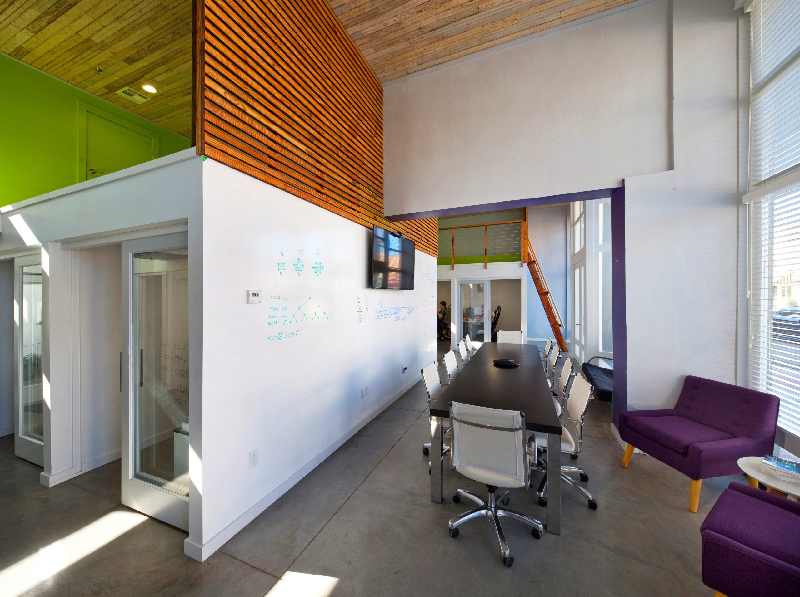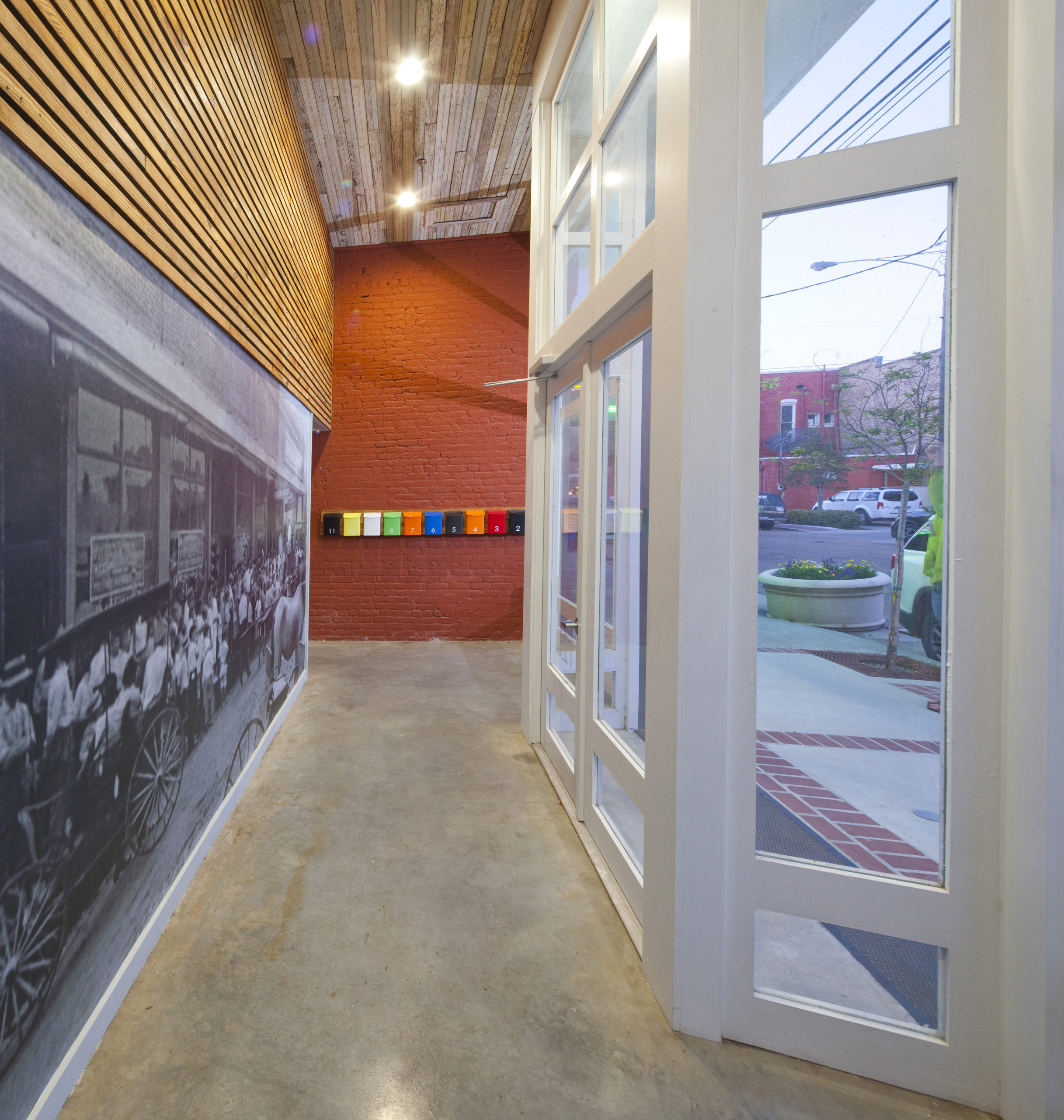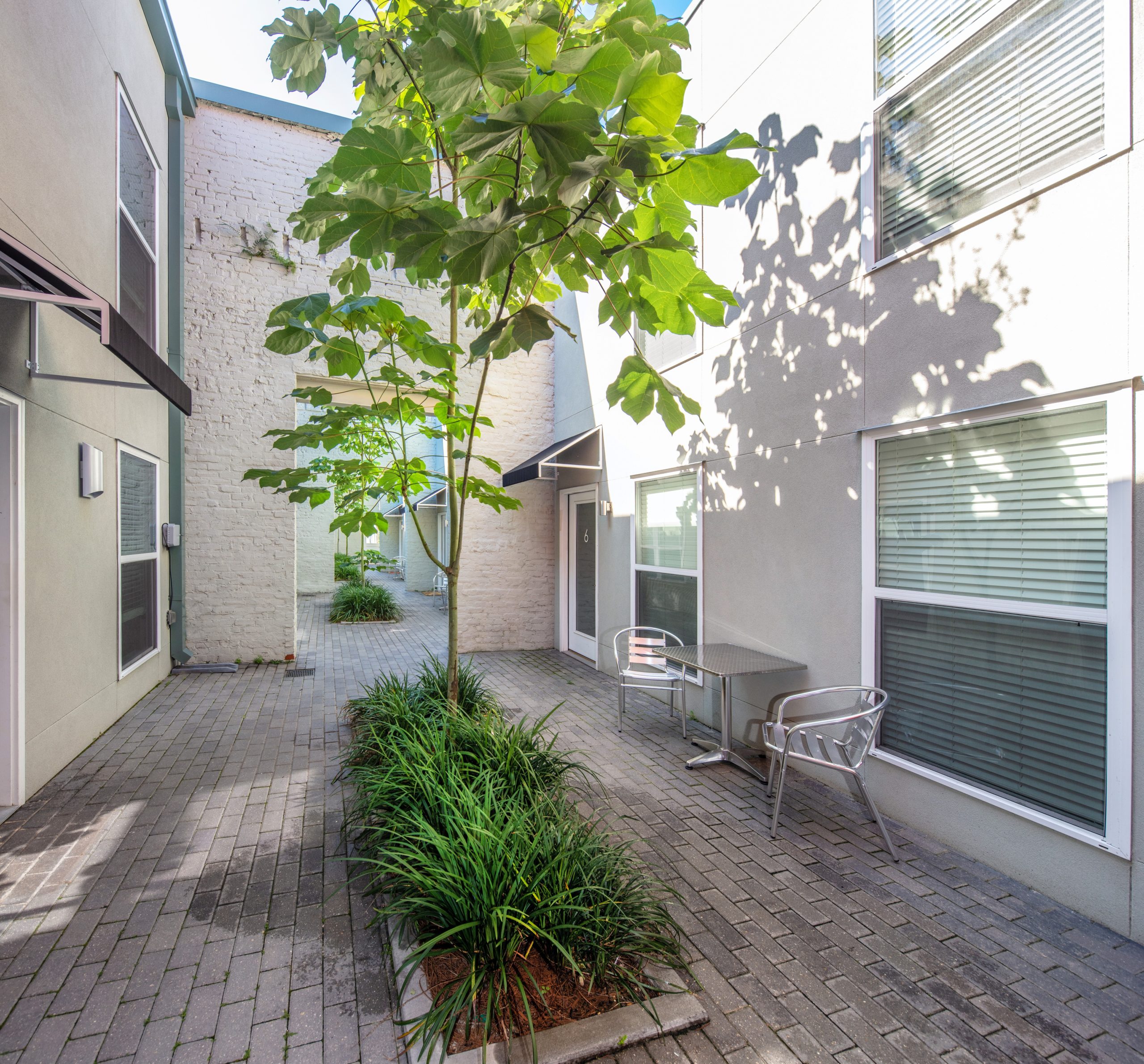 The Baltzell Building was converted into seven townhomes, two lofts, and one commercial space in the first two storefront bays. The site plan features a central courtyard running north to south that connects the front units along Cypress St. with the back units towards the west. The courtyard space is open to above, where the original roof structure was removed and salvaged to be reused as screening elements in the tenant spaces. The courtyard was made continuous through the building by creating three 8’x12′ openings in the brick masonry walls that divide the four bays. The back units are accessible through the courtyard, which can be accessed from a South entrance along Morris Avenue and from an entrance lobby and corridor located at the fourth bay along Cypress Street. There are four large planters within the courtyard to allow for trees and vegetation, which all of the units have views. All of the back courtyard units also have a 5′ wide patio along the west wall where a portion of the original roof structure was removed and salvaged.