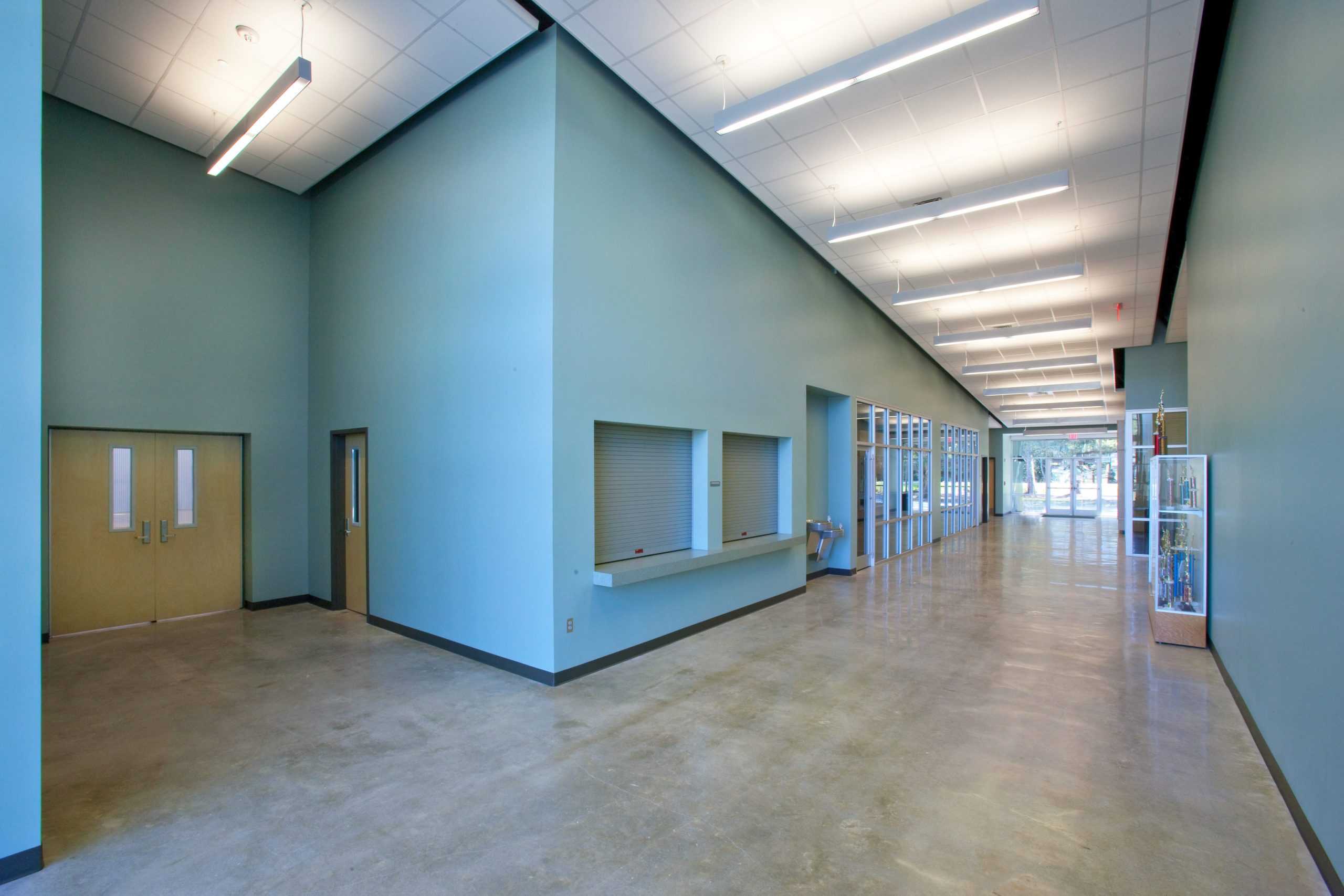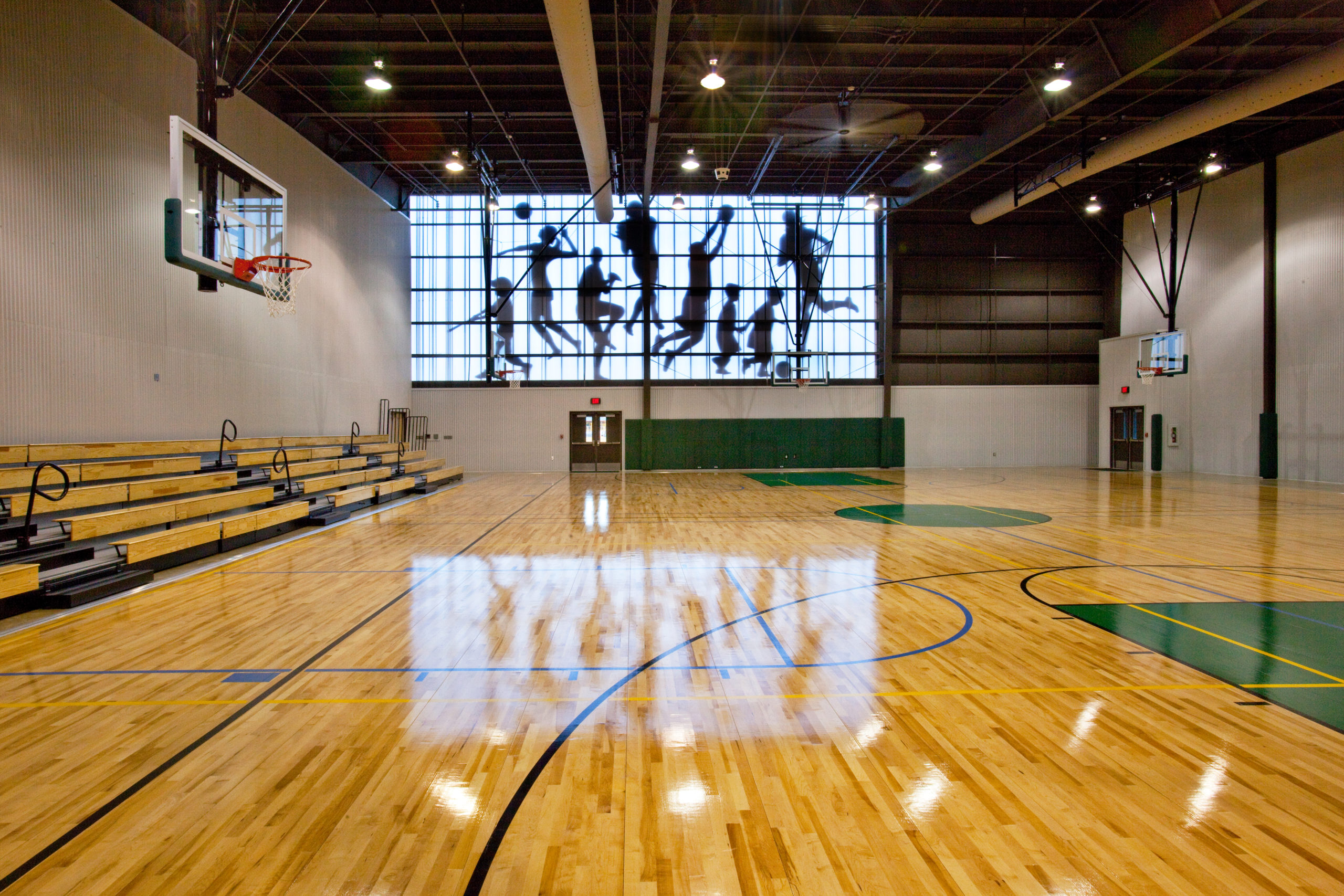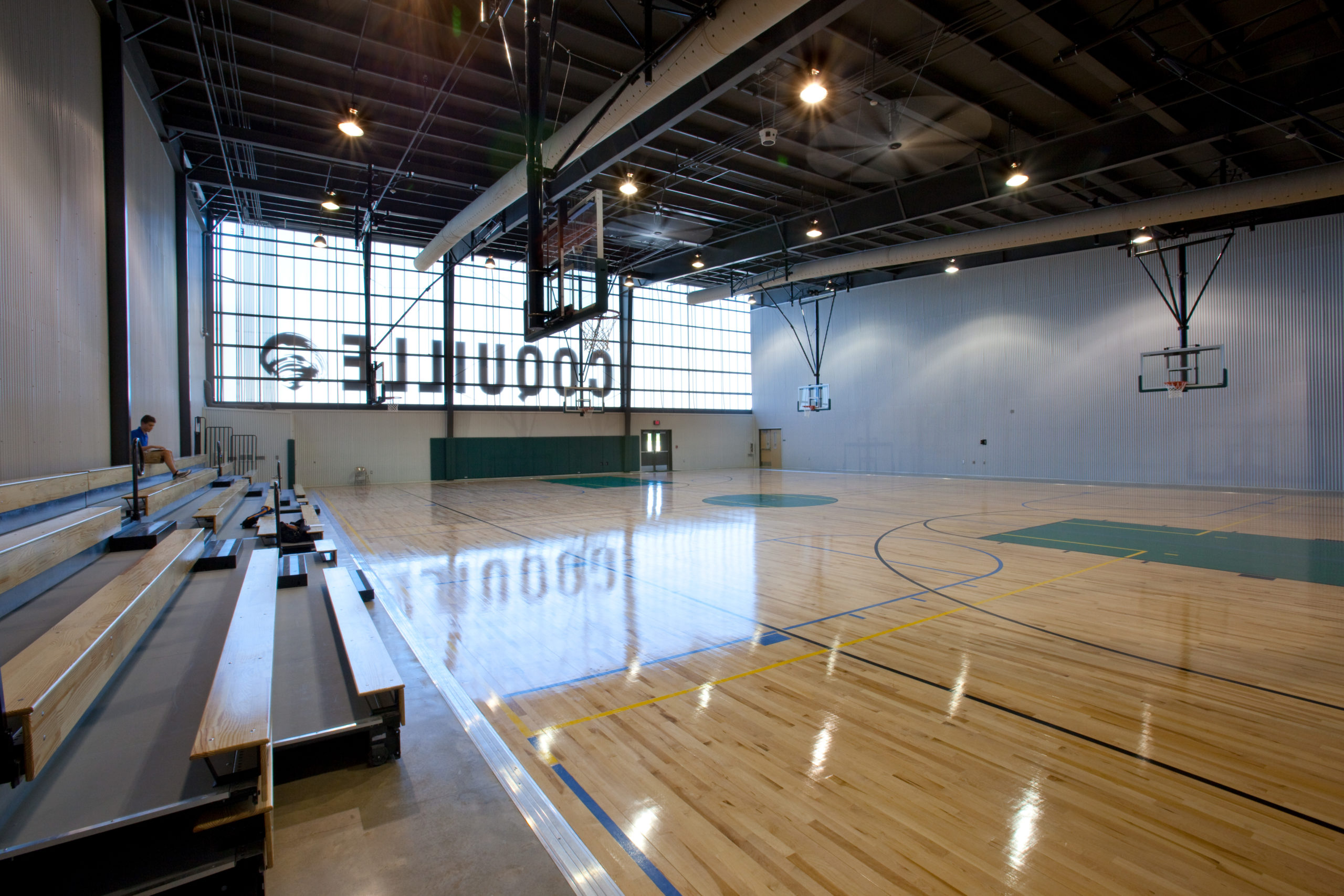The scope of work for Coquille Gymnasium included the 23,560 sq. ft. addition to the existing gym facility. An entrance lobby, conference room, offices, and concession stand were added along with support spaces such as storage, restrooms, HVAC, and mechanical. The new double gymnasium is constructed of a metal building structure and features 2 full-size basketball courts, 8 youth courts, and 4 volleyball courts. Telescopic bleachers, a recessed wood sports floor, and retractable basketball goals are included in the space. To increase the gym’s prominence and visibility, a large transparent north facing polycarbonate façade was employed with the park’s logo in super-graphics