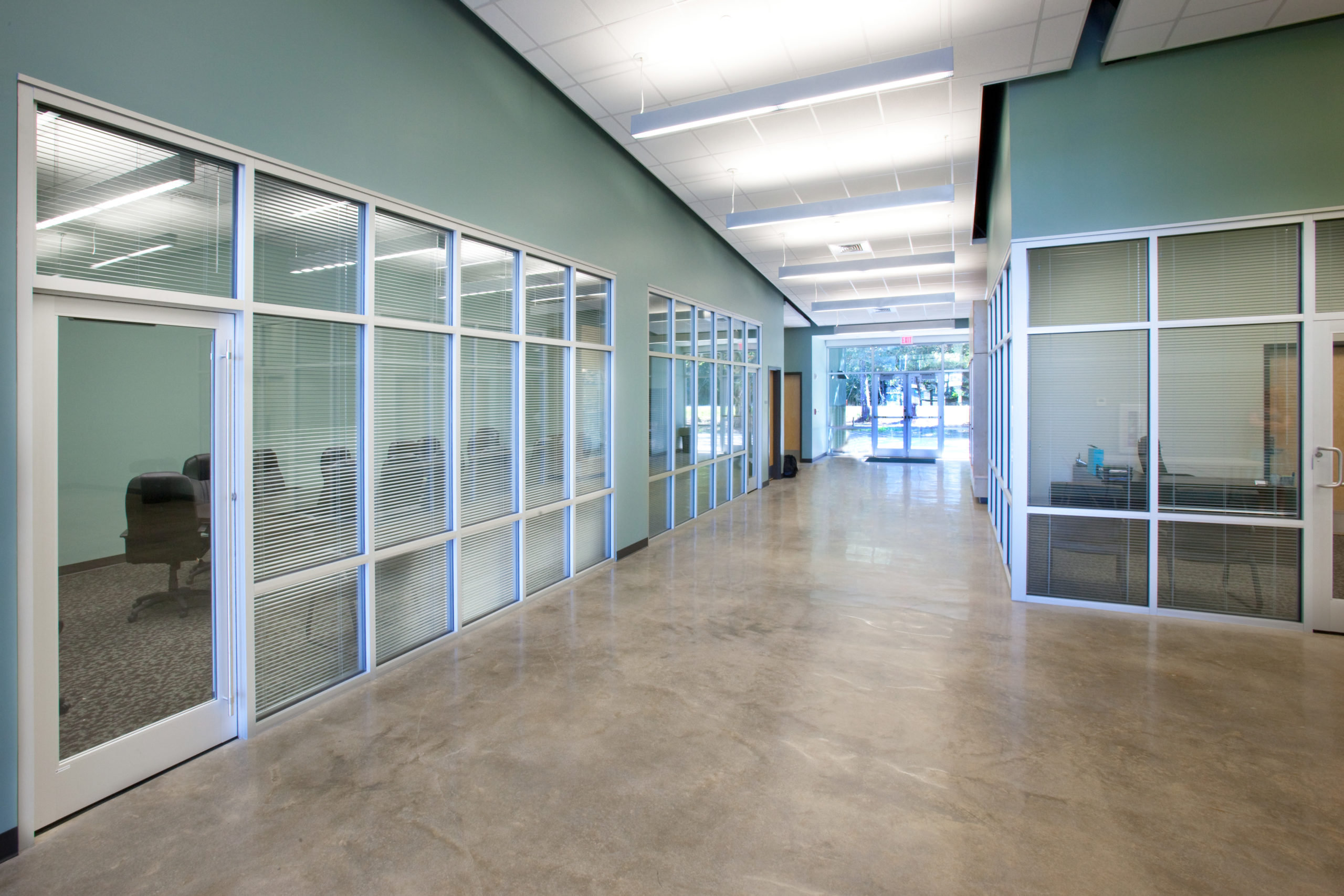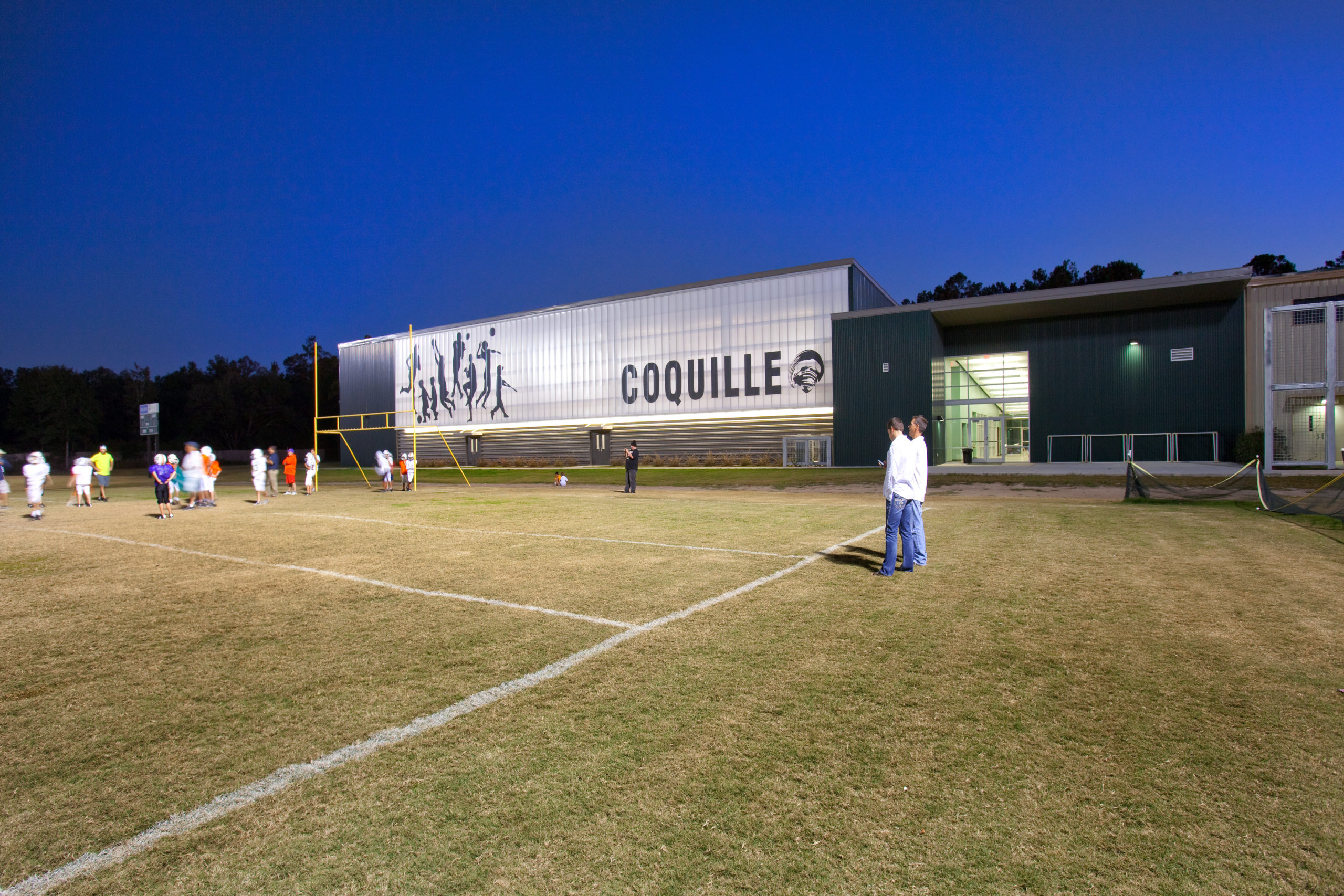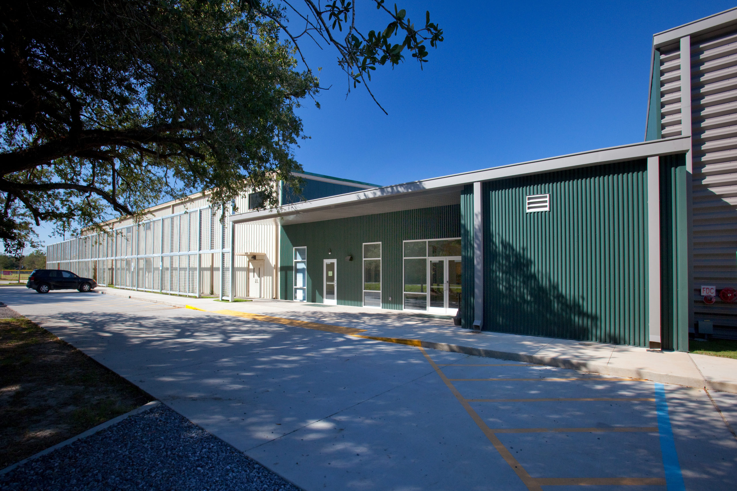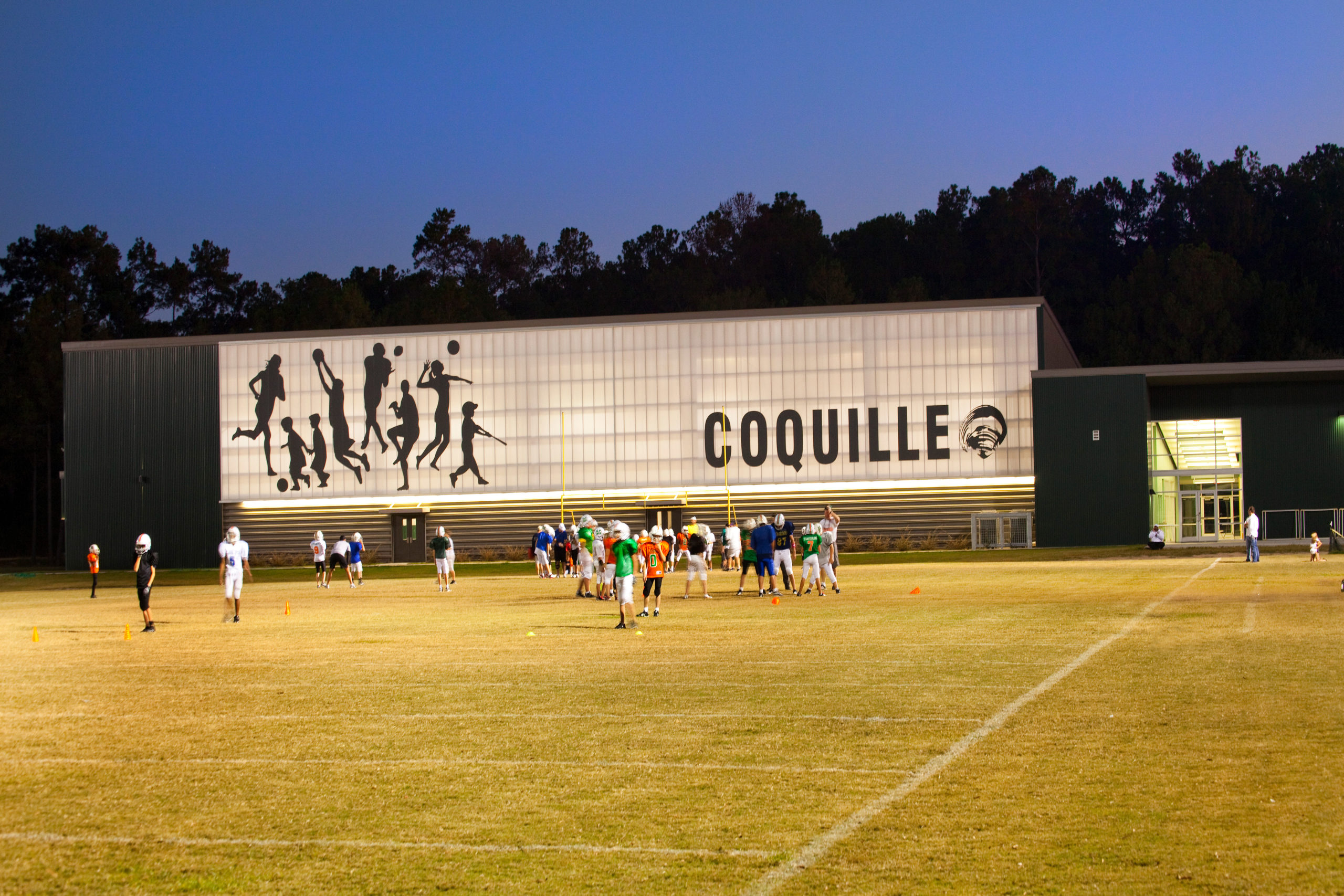 The scope of work for Coquille Gymnasium included the 23,560 sq. ft. addition to the existing gym facility. An entrance lobby, conference room, offices, and concession stand were added along with support spaces such as storage, restrooms, HVAC, and mechanical. The new double gymnasium is constructed of a metal building structure and features 2 full-size basketball courts, 8 youth courts, and 4 volleyball courts. Telescopic bleachers, a recessed wood sports floor, and retractable basketball goals are included in the space. To increase the gym’s prominence and visibility, a large transparent north facing polycarbonate façade was employed with the park’s logo in super-graphics