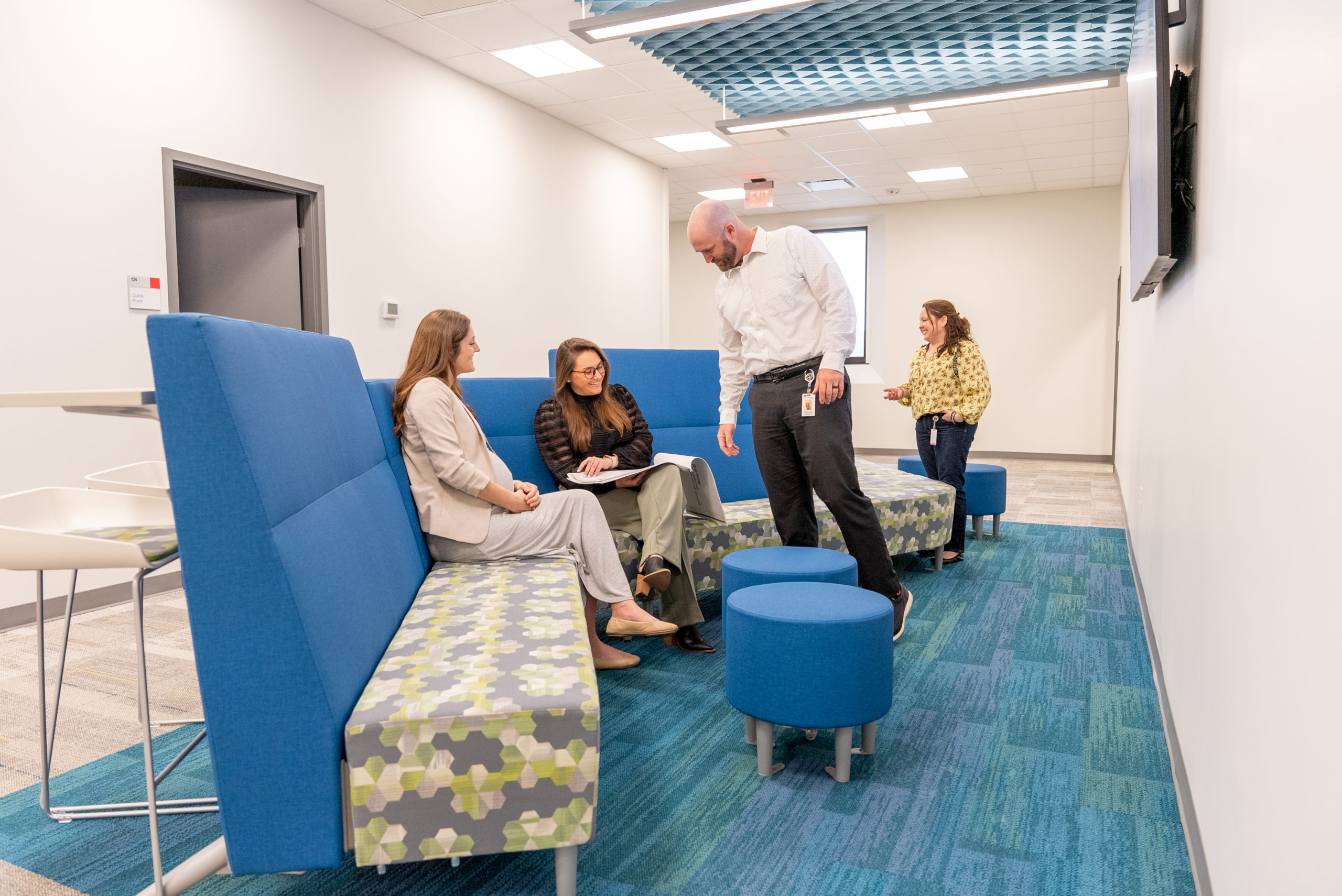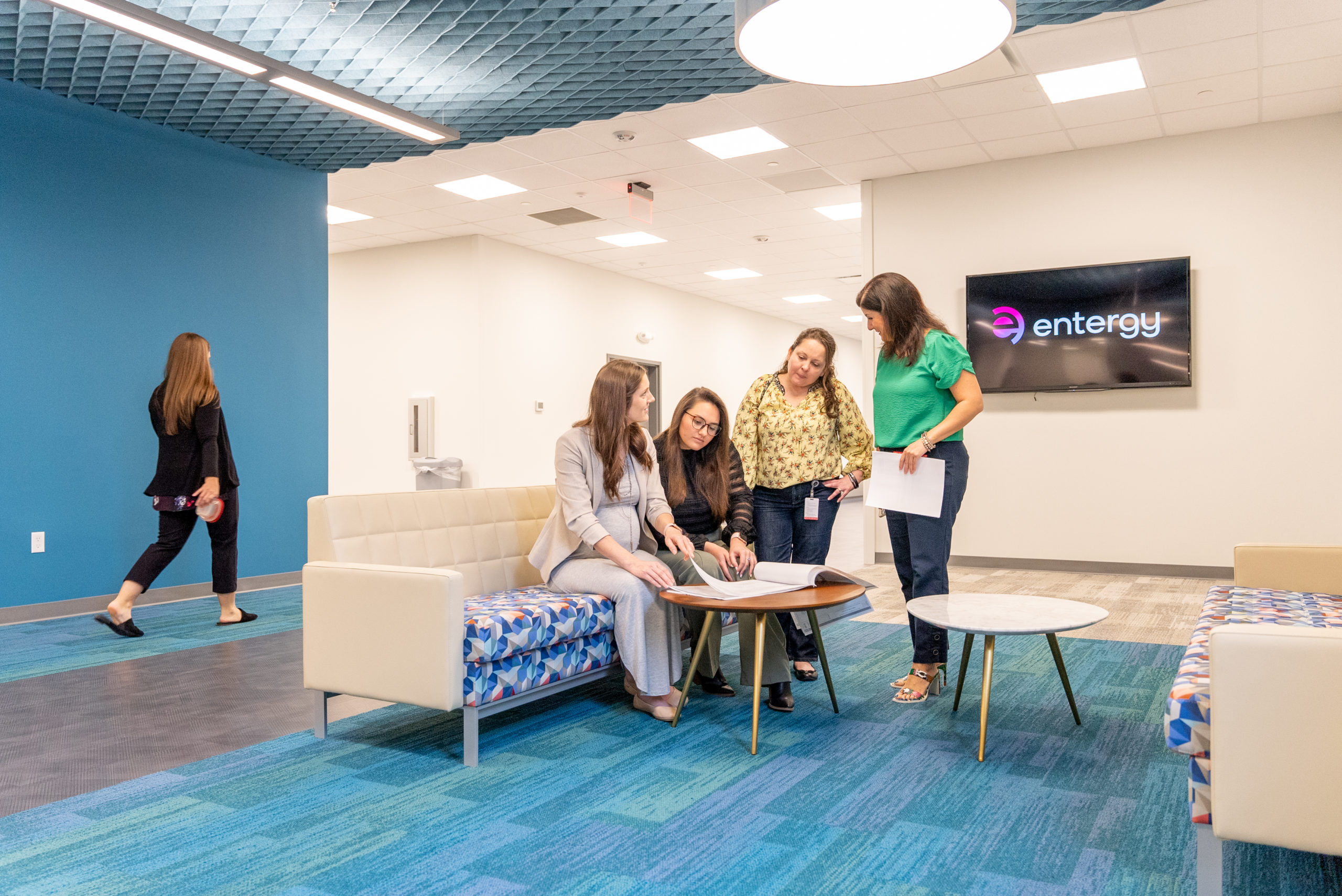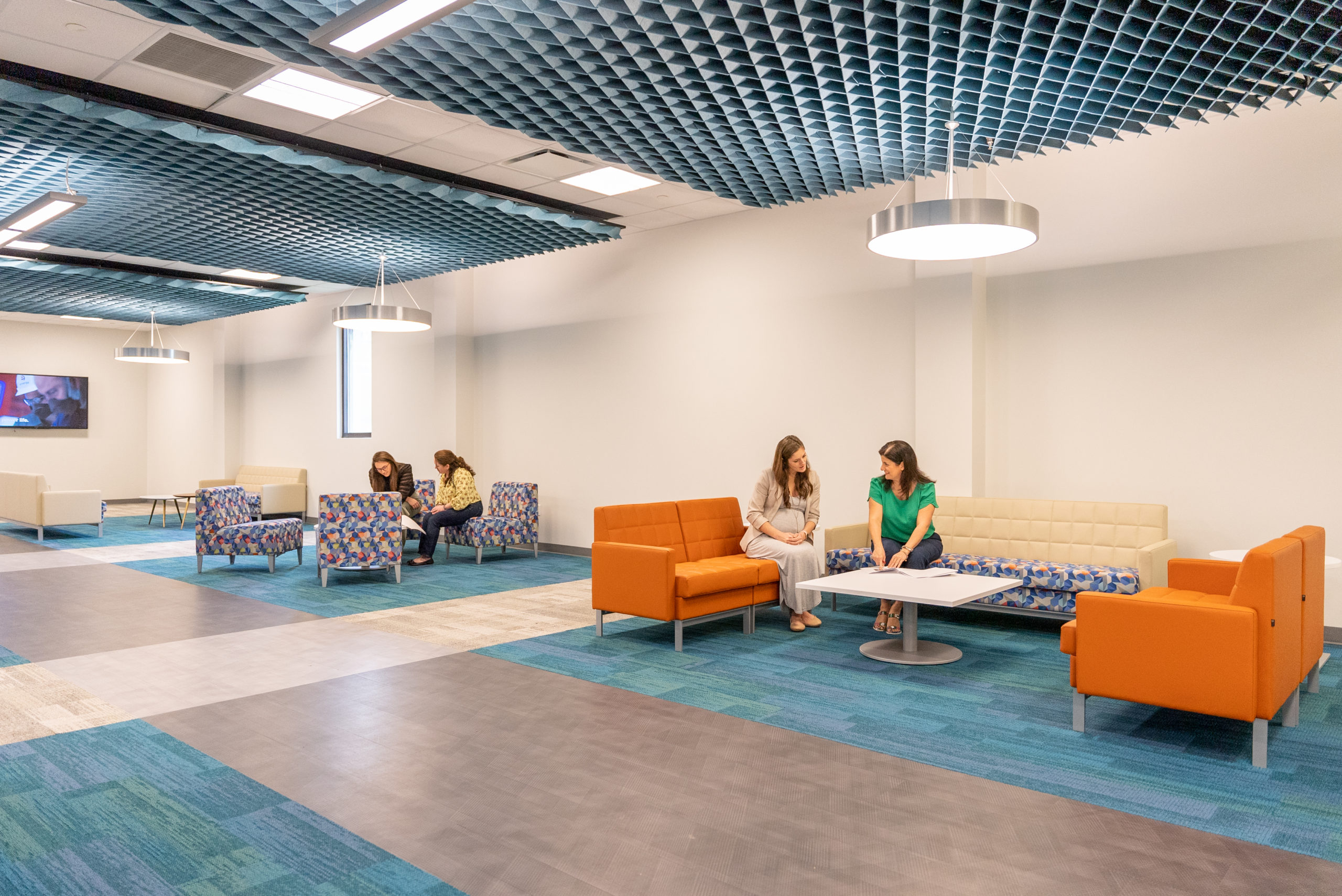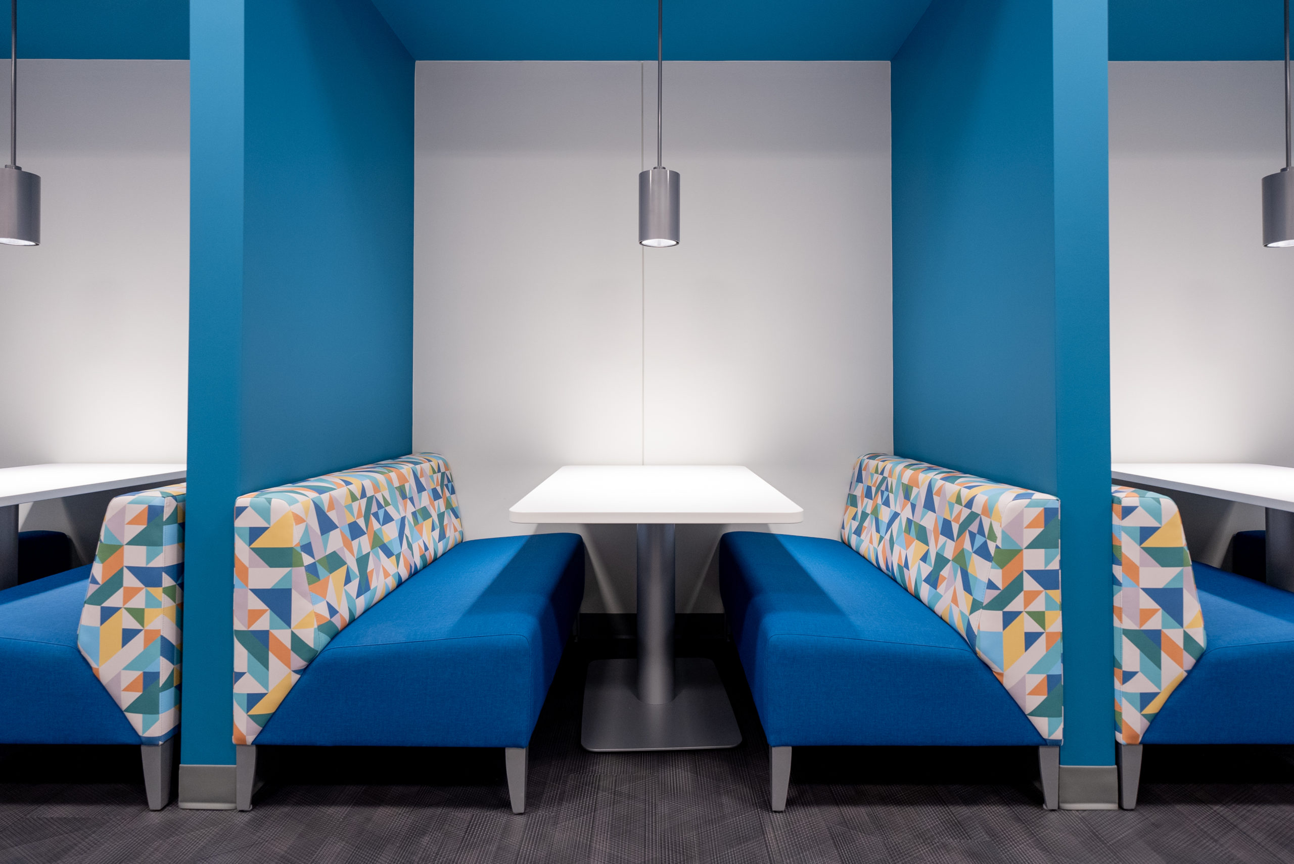 This interior renovation included a completely revised space plan to reflect the new hybrid working style, which involved reducing the number of desks and increasing the number of shared spaces. The design concept was based on creating intentional, collaborative spaces, including lounges around the perimeter with saturated pops of color, a flexible break room, phone rooms, huddle rooms, and meeting rooms of varying sizes. To provide an open feel, the office areas were fitted with lower panels that included glass screens and sound-masking to address acoustics.