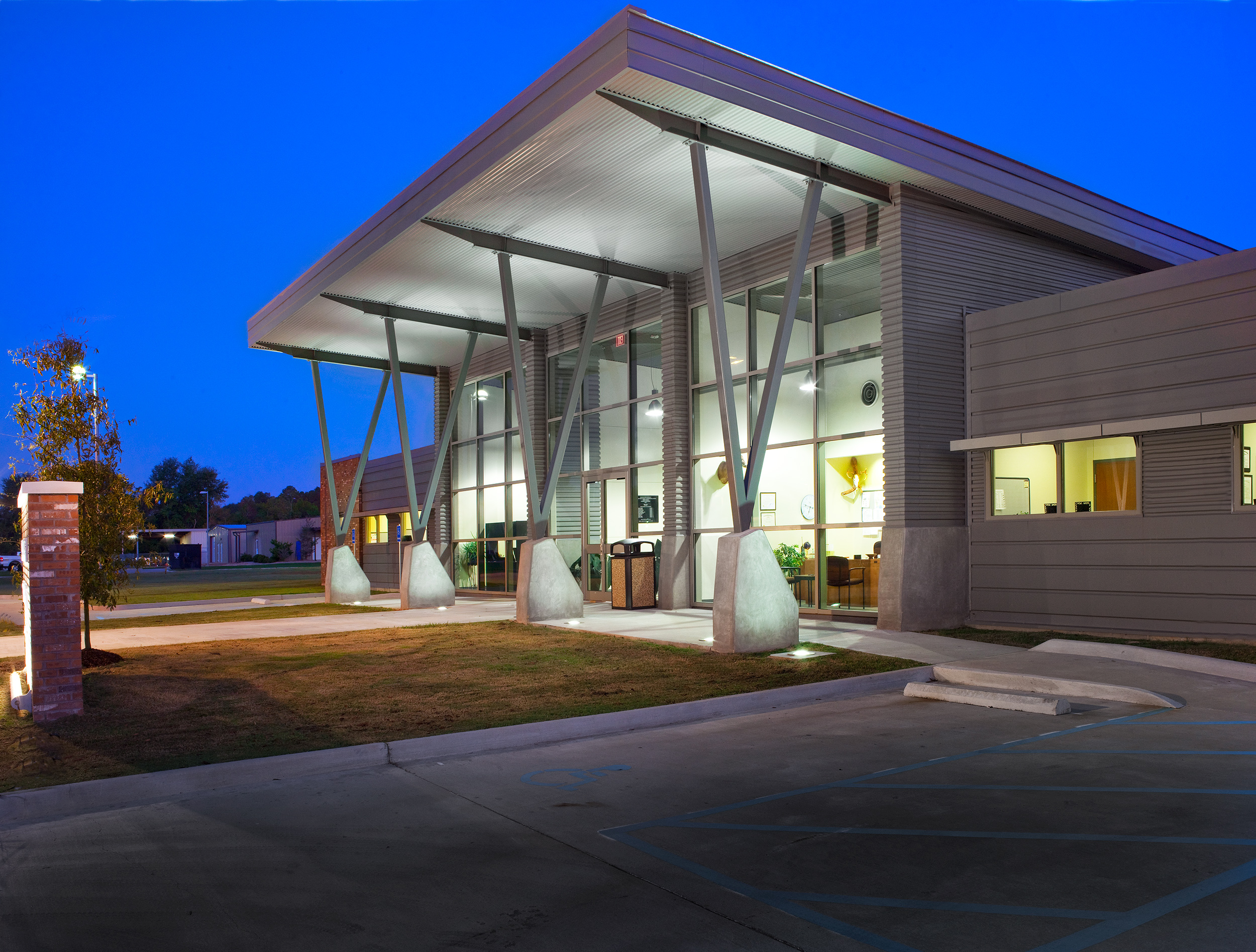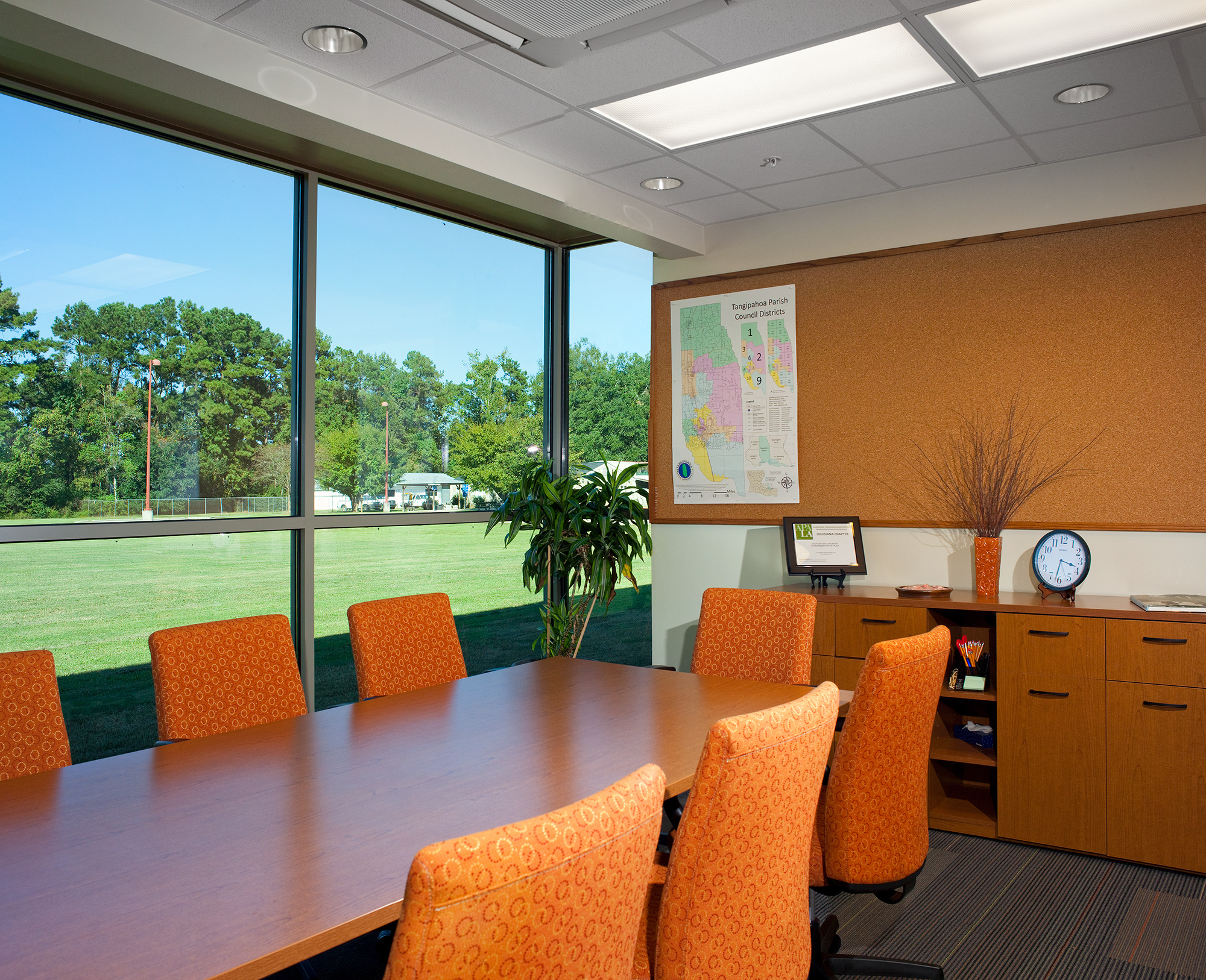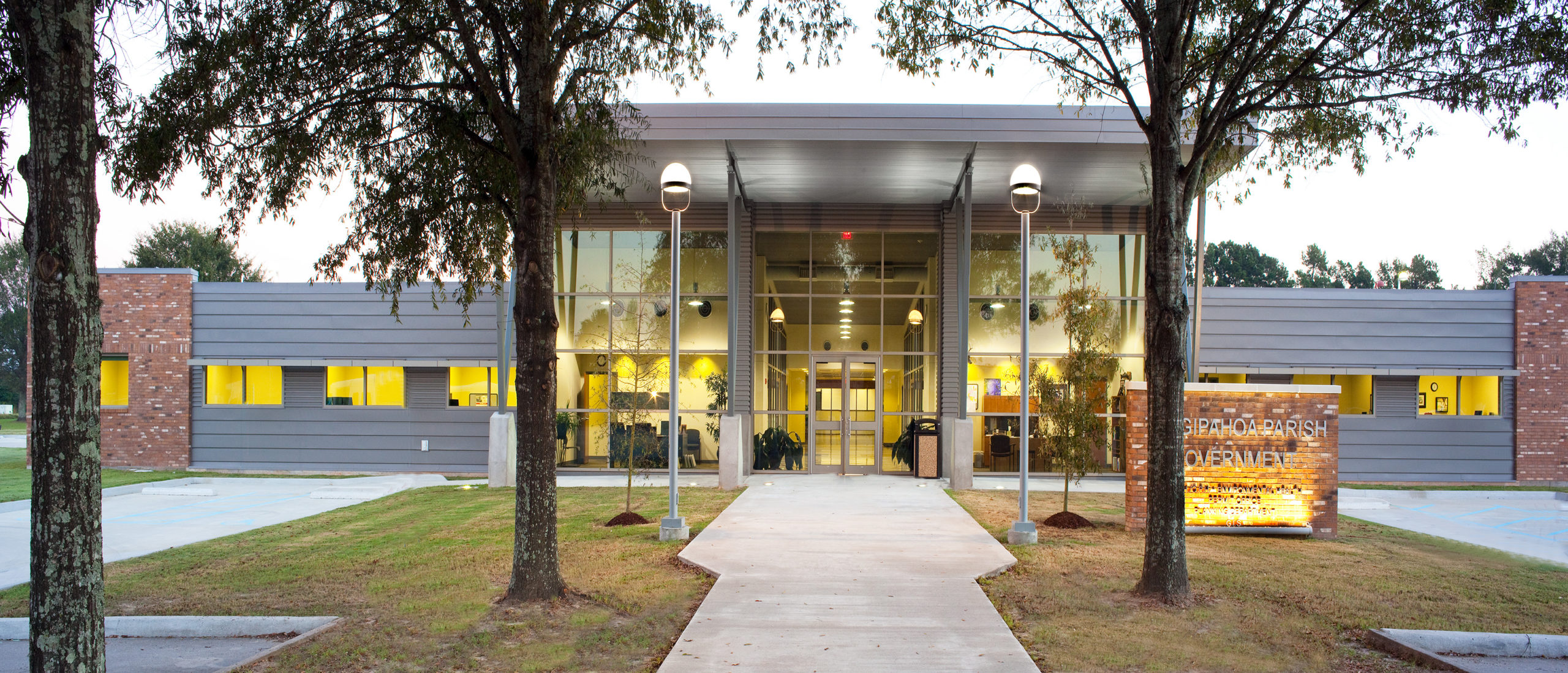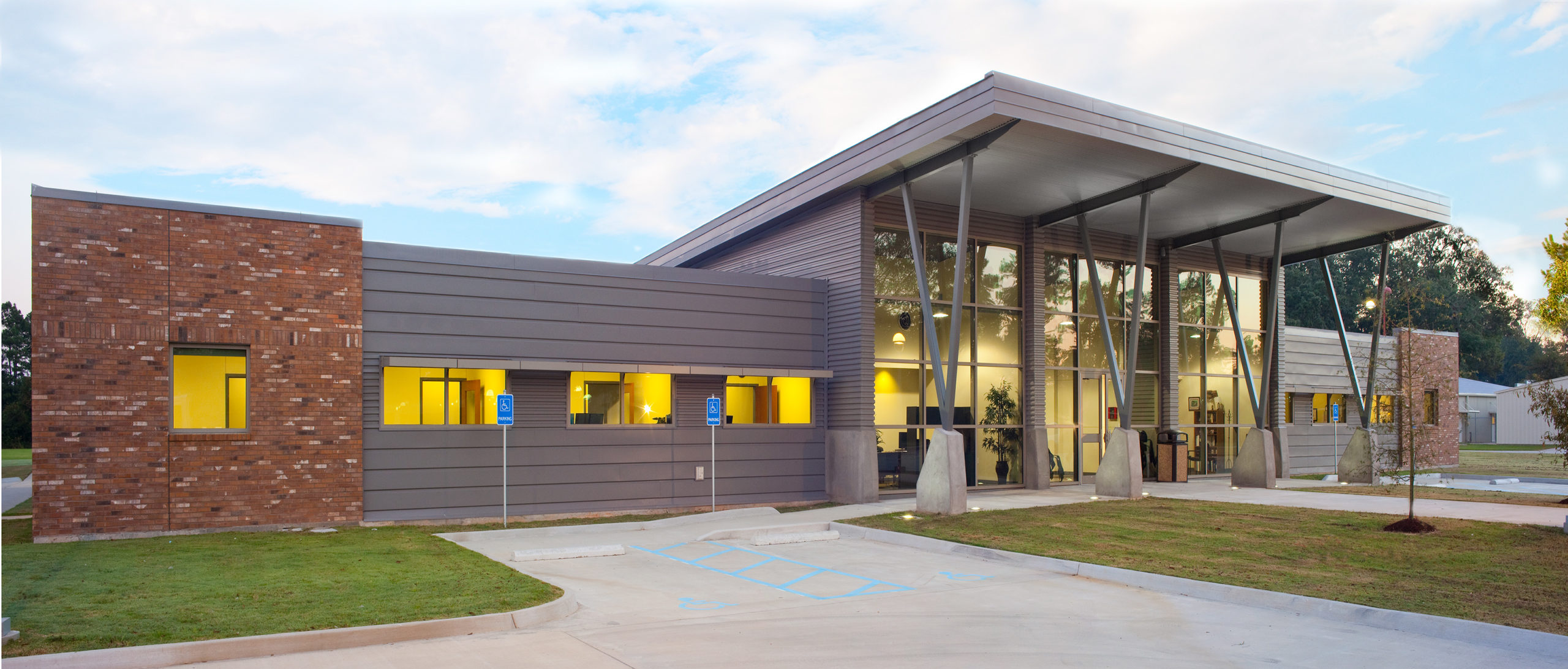 The 18,980 sq. ft. Environmental Services Building houses the Tangipahoa Parish Government’s headquarters for the departments of Building Permitting, Planning, and Environmental Health. The building is subdivided into three main areas which correspond to the three departments. The large volume entry space is flanked on two sides by Building Permitting and Environmental Health and leads visitors to the Planning Department and a large multi-purpose meeting space. The new building is on axis with the existing South Tangipahoa Parish Health Unit which was also designed by Holly and Smith Architects in 1997.