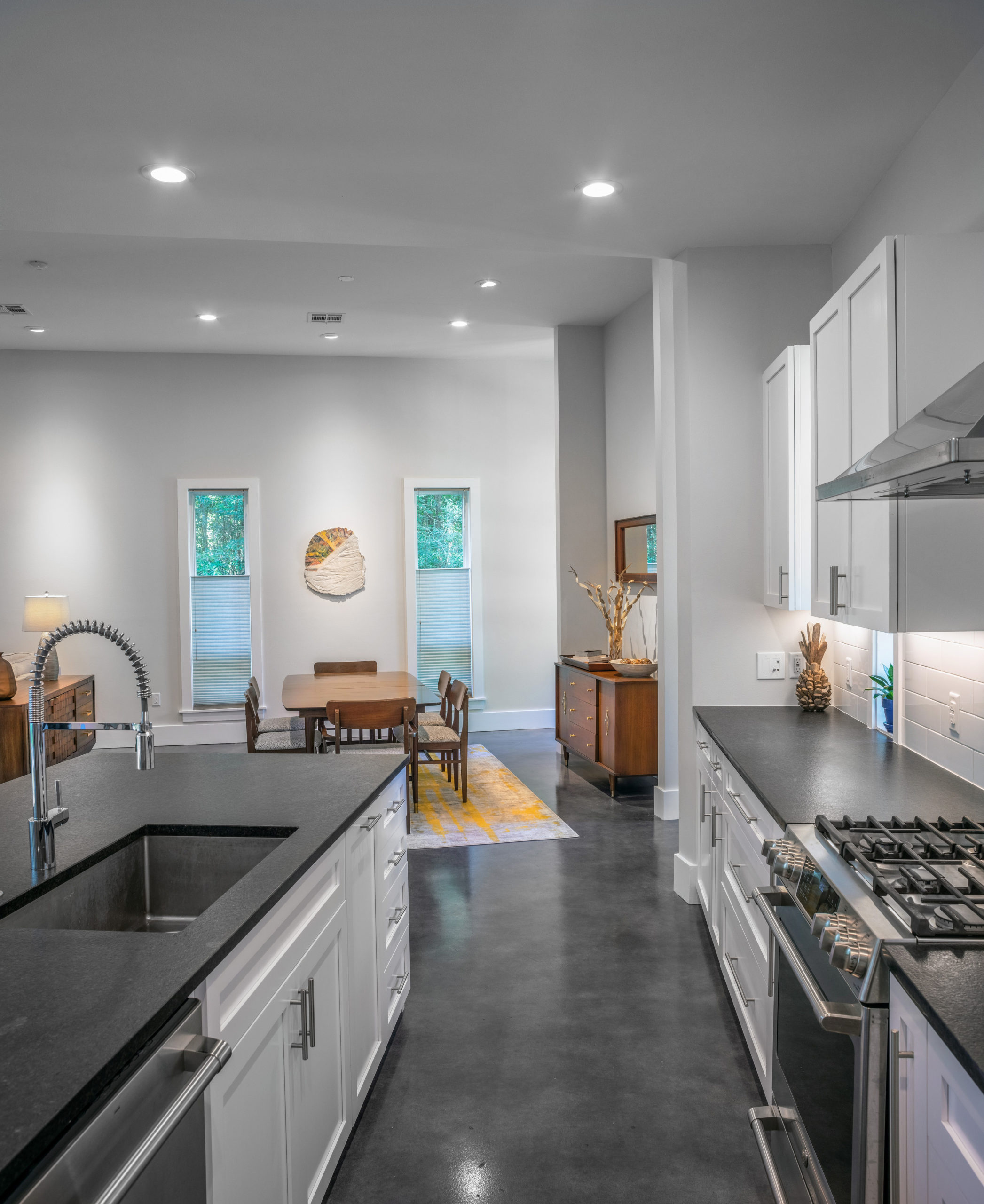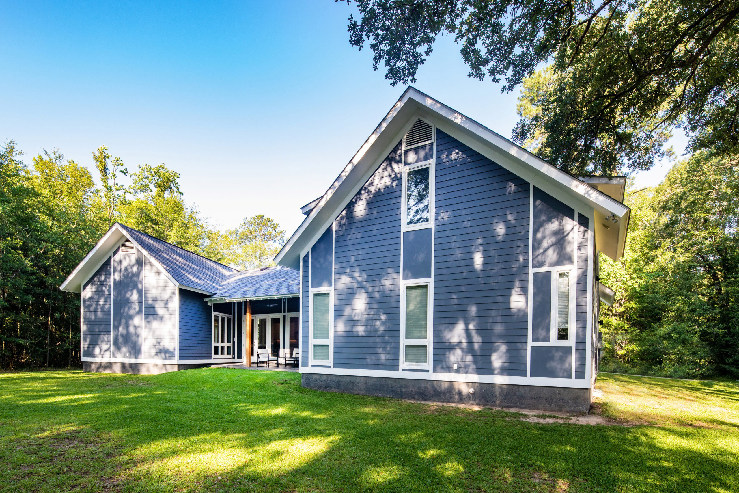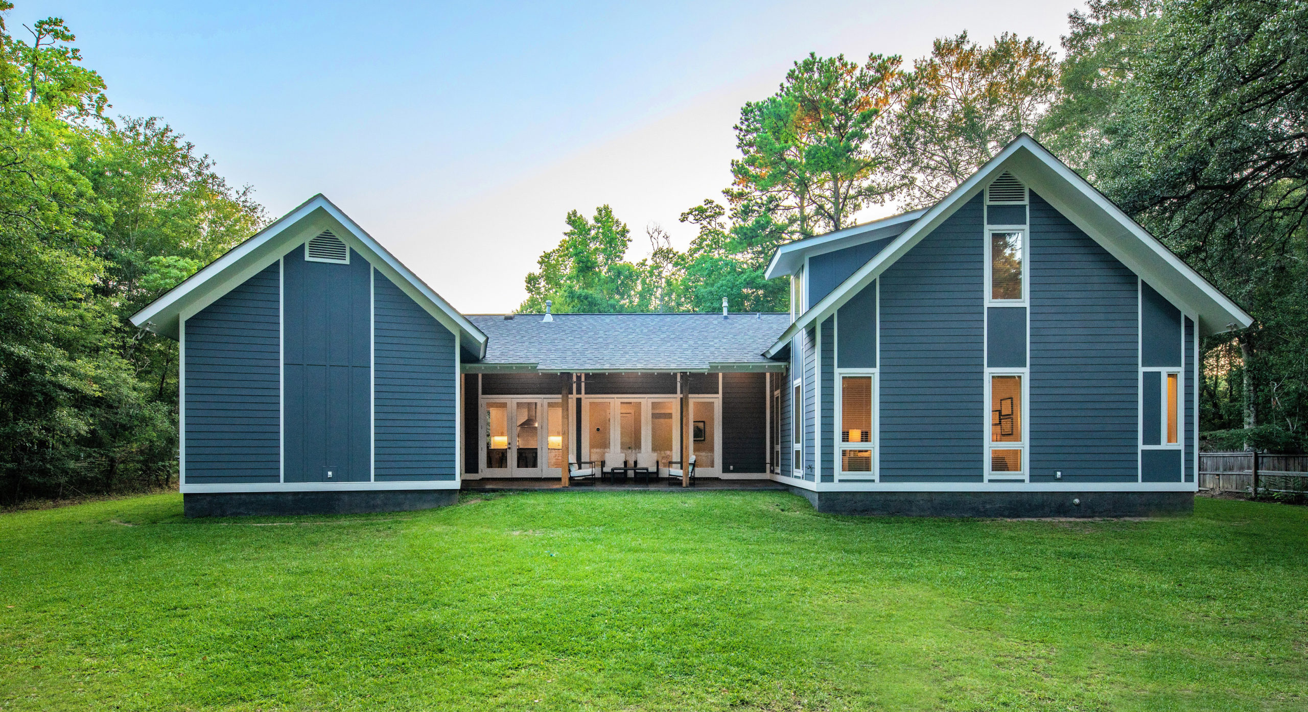 The Faulk Residence is situated on an approximately 1/3 acre wedge-shaped site in one of Hammond, Louisiana’s more contemporary neighborhoods. The design responds to the vernacular architecture of south Louisiana, integrating modern approaches with traditional forms. The residence is divided into two main pods incorporating the private and public areas, connected by a central spine that provides the home’s primary circulation and work areas. Because of its central role as the hub of family life, the kitchen was positioned along the home’s spine and opened to the dining and living areas that compose the public areas of the home. The kitchen is bordered by a wall of windows overlooking a linear porch that both shades this area of the house from direct sunlight and maximizes views to the rear yard.