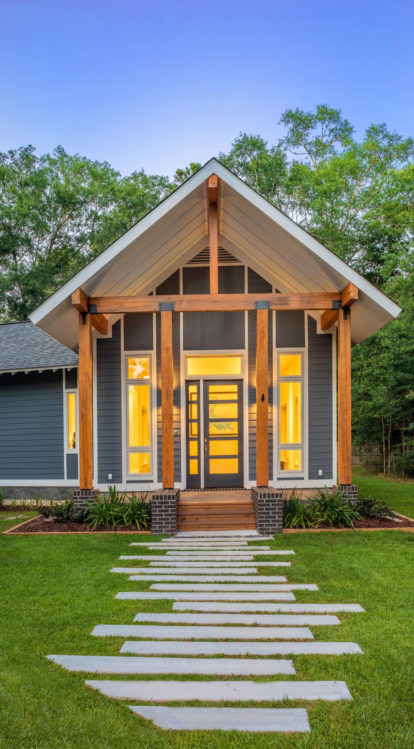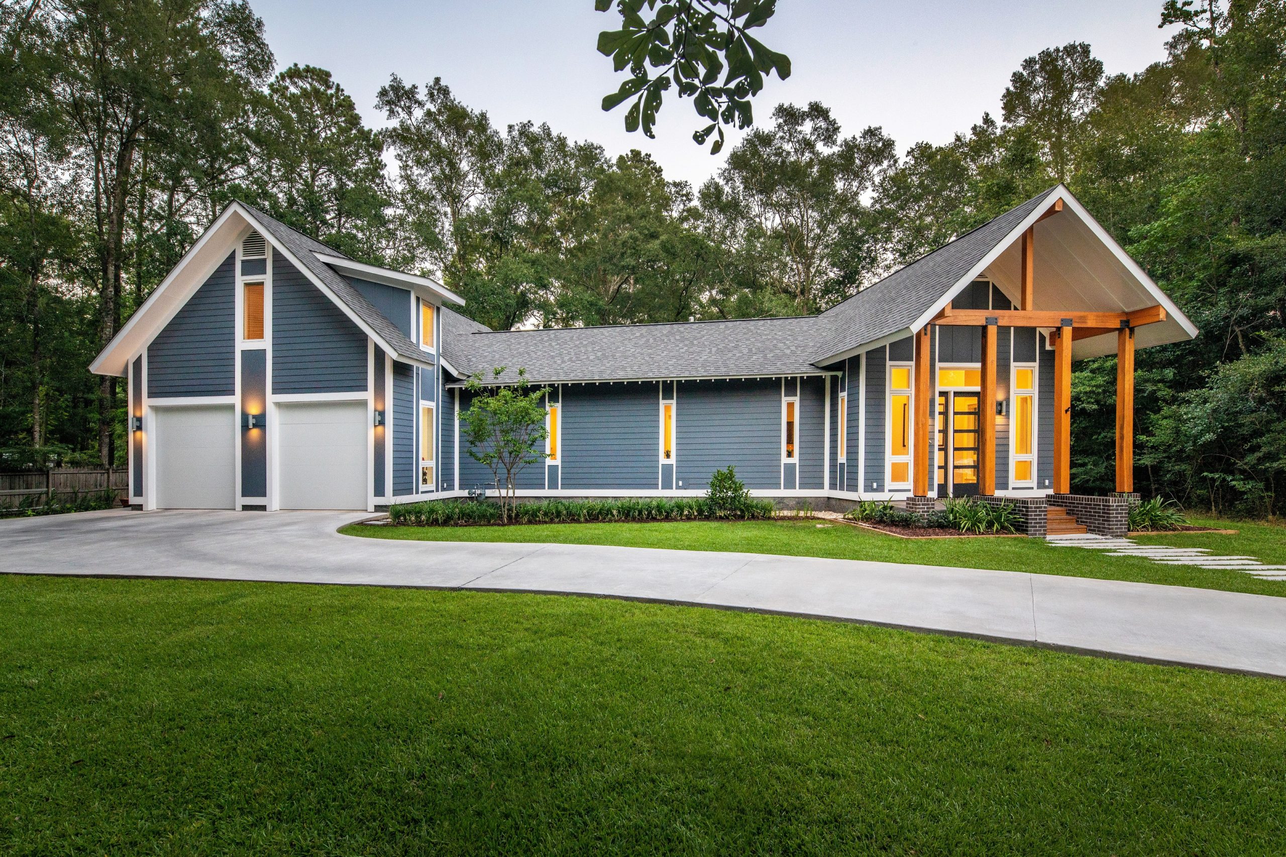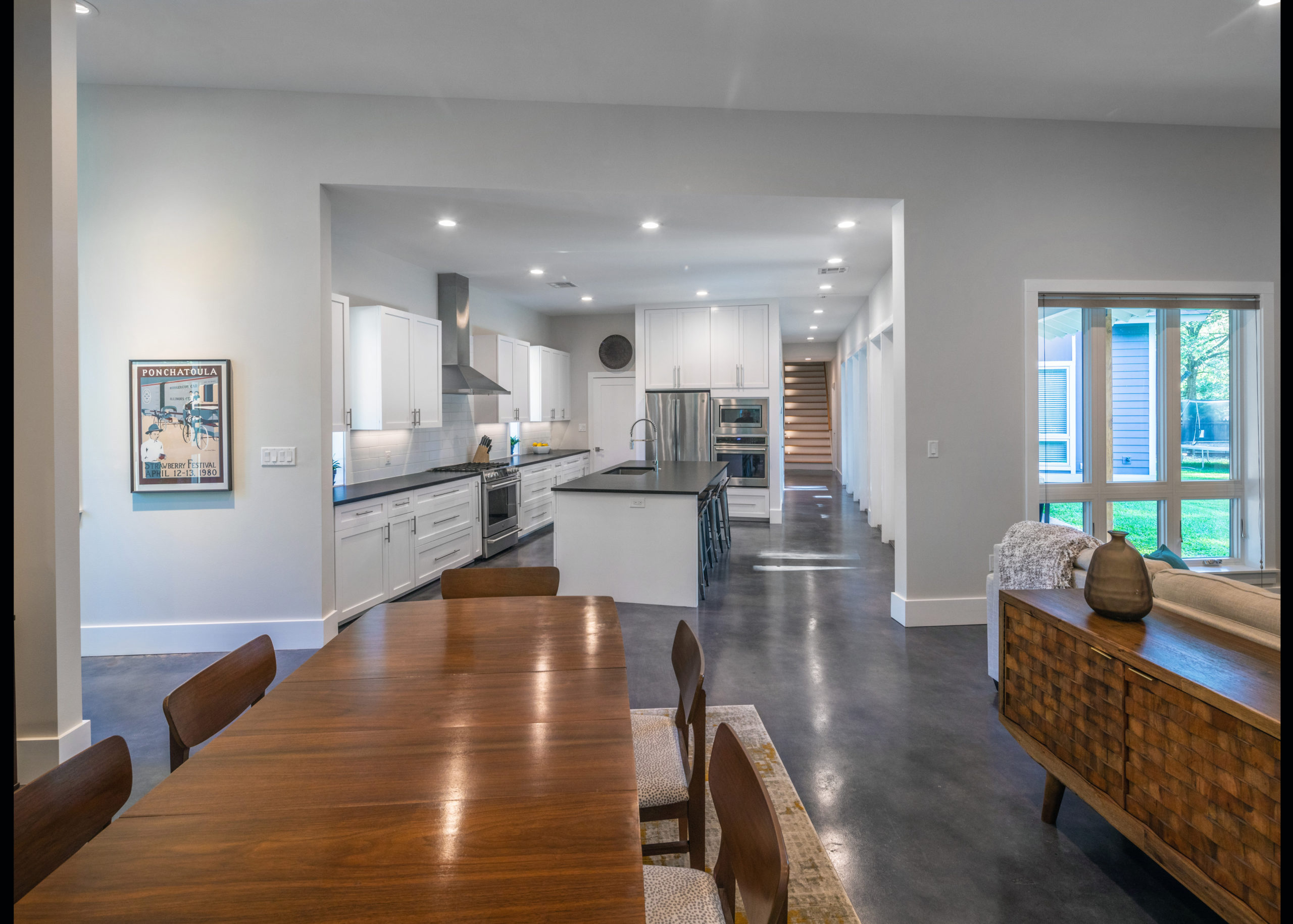 The Faulk Residence is situated on an approximately 1/3 acre wedge-shaped site in one of Hammond, Louisiana’s more contemporary neighborhoods. The design responds to the vernacular architecture of south Louisiana, integrating modern approaches with traditional forms. The residence is divided into two main pods incorporating the private and public areas, connected by a central spine that provides the home’s primary circulation and work areas. Because of its central role as the hub of family life, the kitchen was positioned along the home’s spine and opened to the dining and living areas that compose the public areas of the home. The kitchen is bordered by a wall of windows overlooking a linear porch that both shades this area of the house from direct sunlight and maximizes views to the rear yard.