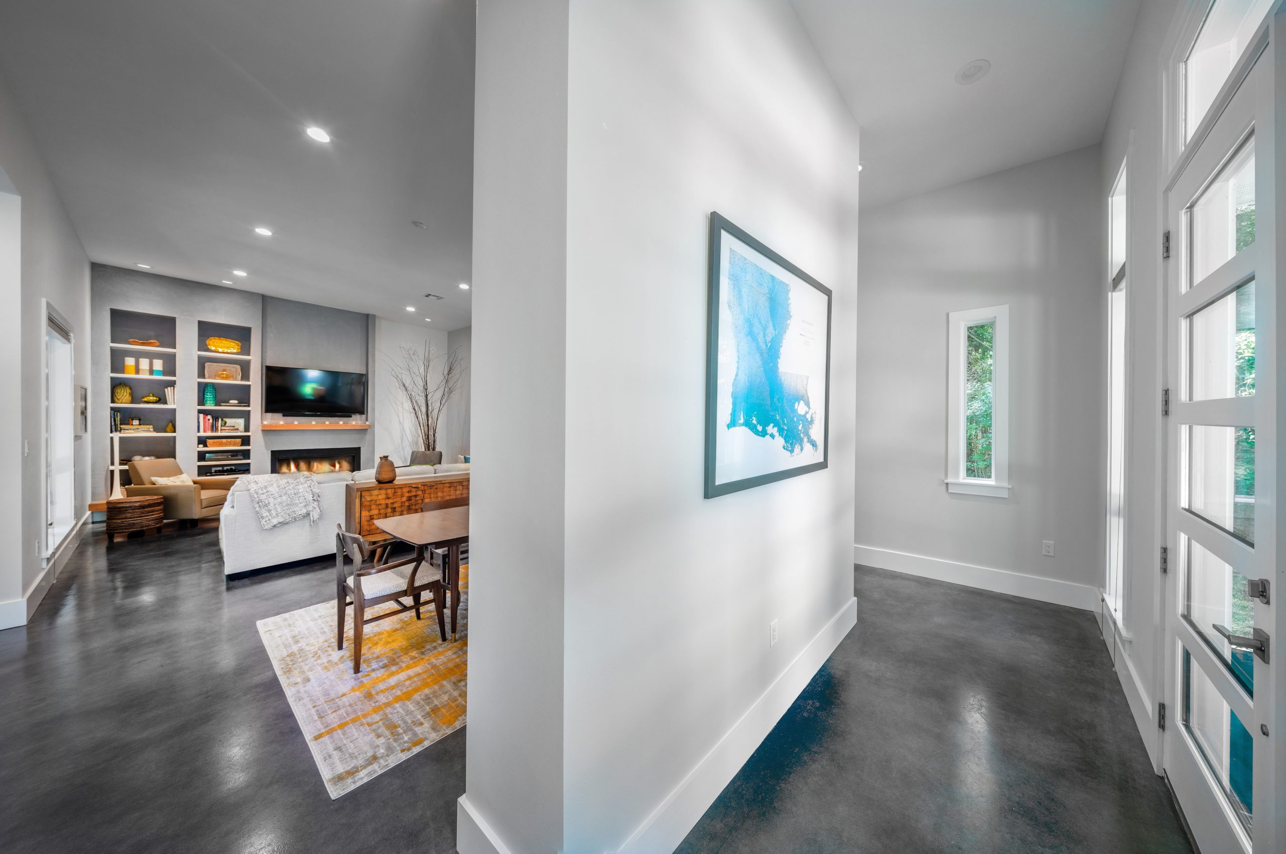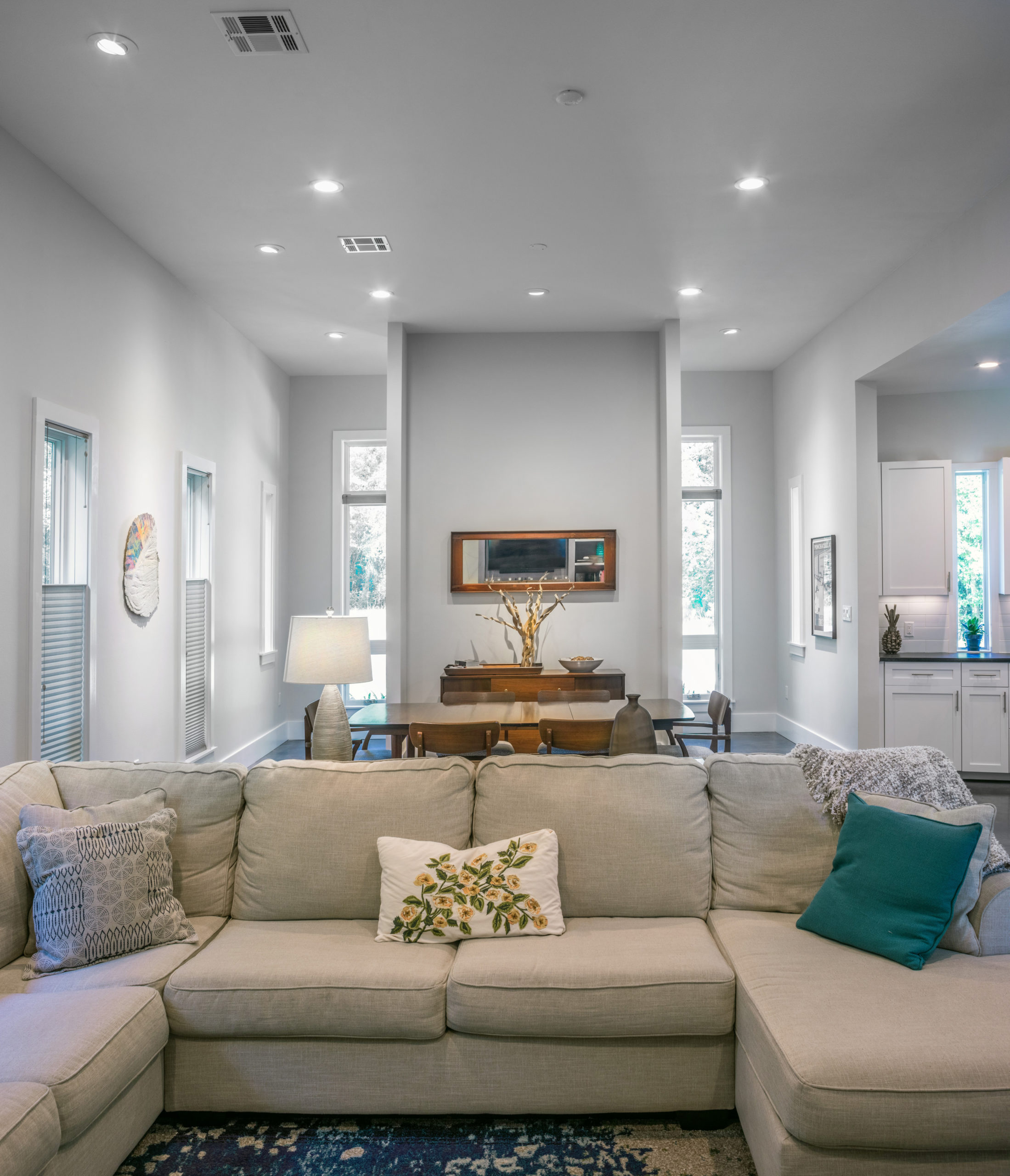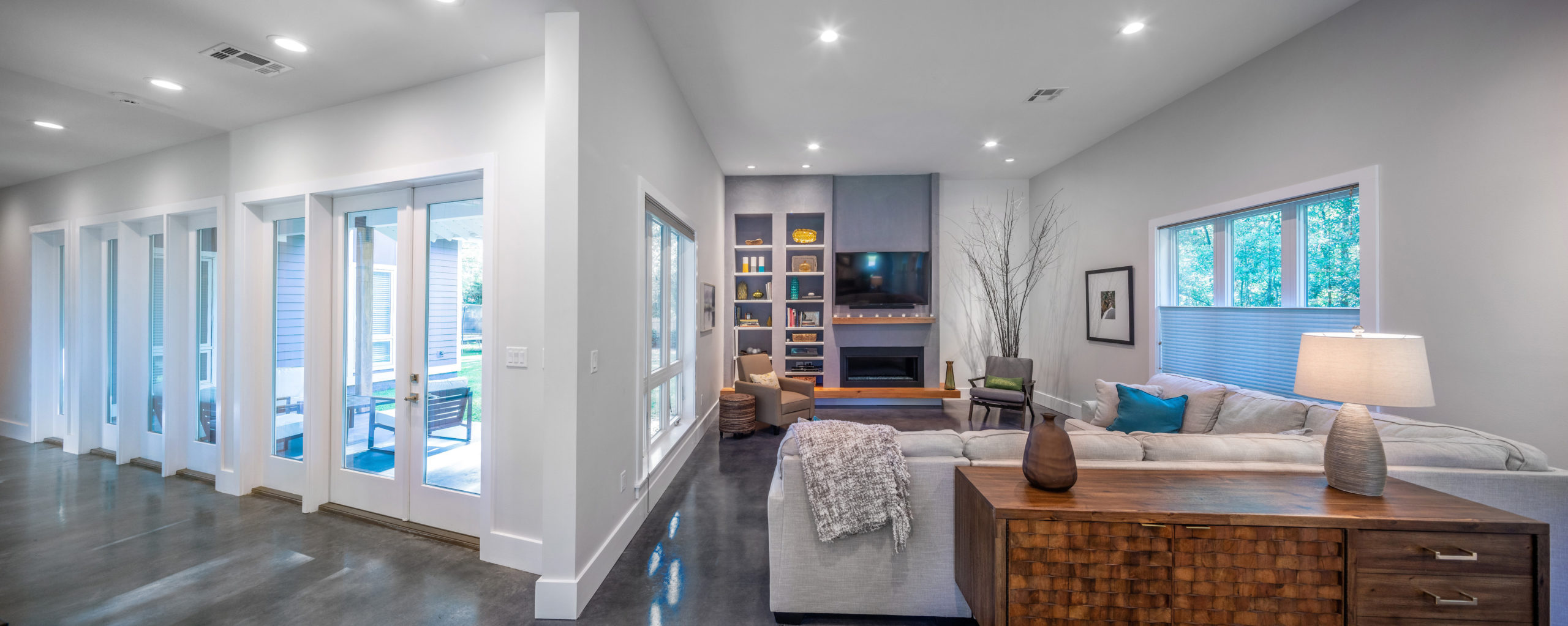 Large windows and a minimal color pallet maximize natural daylight throughout the residence, which reduces the dependence on artificial light sources.