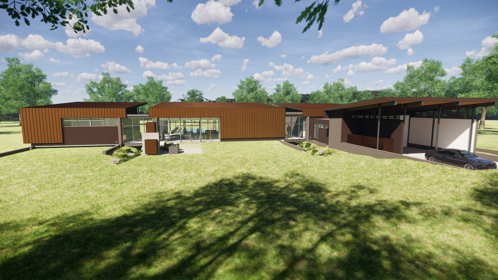 The design parti of the house is organized along a backbone of bridges connecting 4 separate, single-story programmatic pods. These are an open-air carport, a two-bedroom guest suite, a living, kitchen & dining space, and a master bedroom suite. The three pods are oriented to the south, and all enjoy beautiful views through the expansive glass toward the heavily wooded river floodplain. Each of the pods is sheltered by a single sloping standing seam roof that rises toward the south creating deep overhangs for exterior porches. The main central living pod, with the deepest porch, is centered on an outdoor living, kitchen, and lap pool area. The porches are braced at each column with a diagonal steel member. The primary structural skeleton of the house is that of steel with some secondary wood framing. The three livable pods, each separated and connected by bridges, allow for bio-swale drainage to occur at each separation, which is then led out toward the river floodplain. The exterior material pallet is simple. 10′ high brick veneer fin walls bracket the sides of each pod. Above the brick datum line, the remainder of the house is clad with painted cement board siding. The site provided the house’s namesake, a grove of stately Iron Oak trees (also known as Post oaks) loom over the contoured site. The slow-growing oak thrives in dry, poor soil and is resistant to rot, fire, and drought. The house incorporates several active and passive sustainable strategies that increase the house’s energy efficiency, including a solar panel array, tankless water heater, Energy Star appliances, spray foam insulation, optimal solar orientation, south-facing shading strategies to minimize solar heat gain and geothermal HVAC systems.