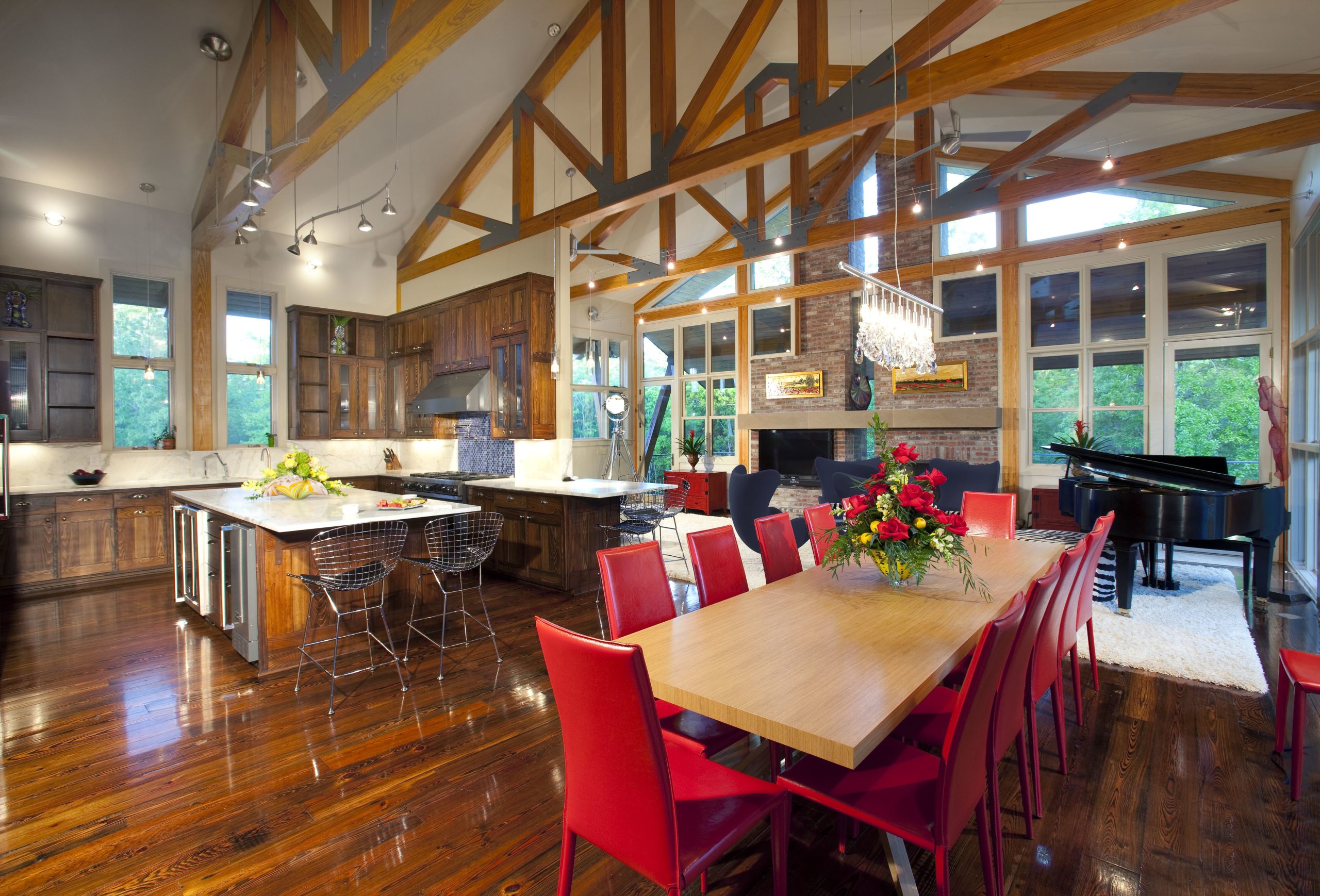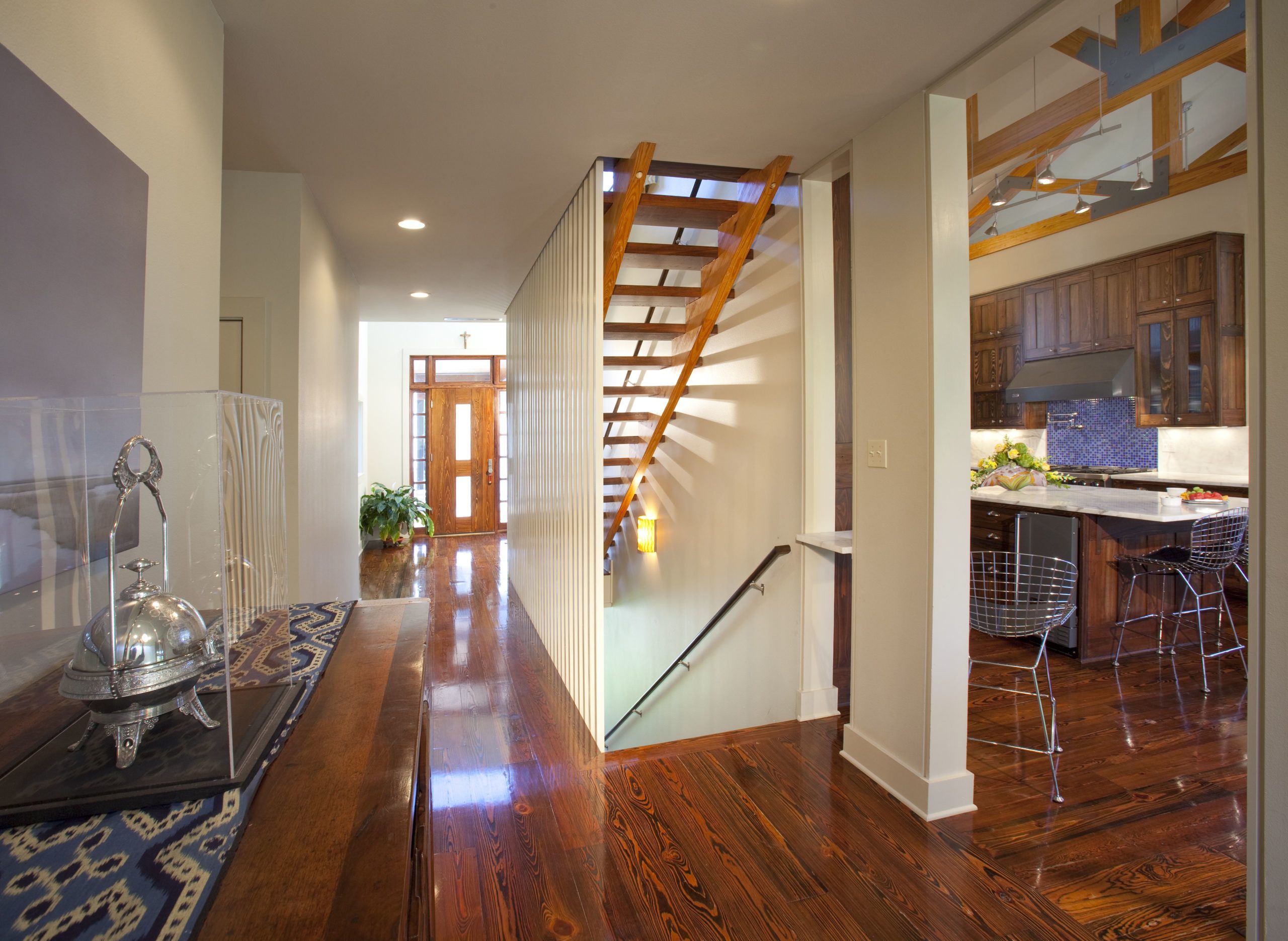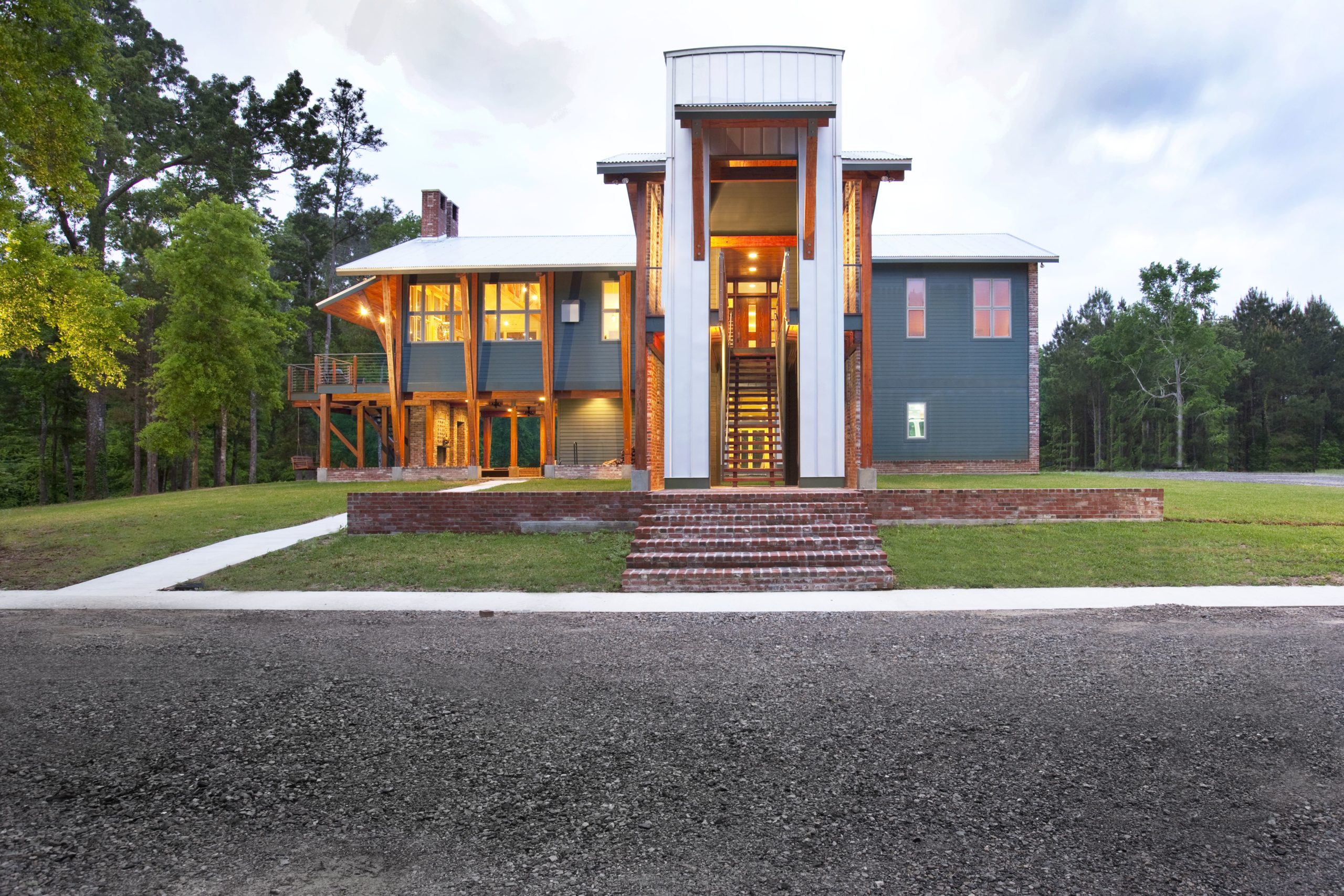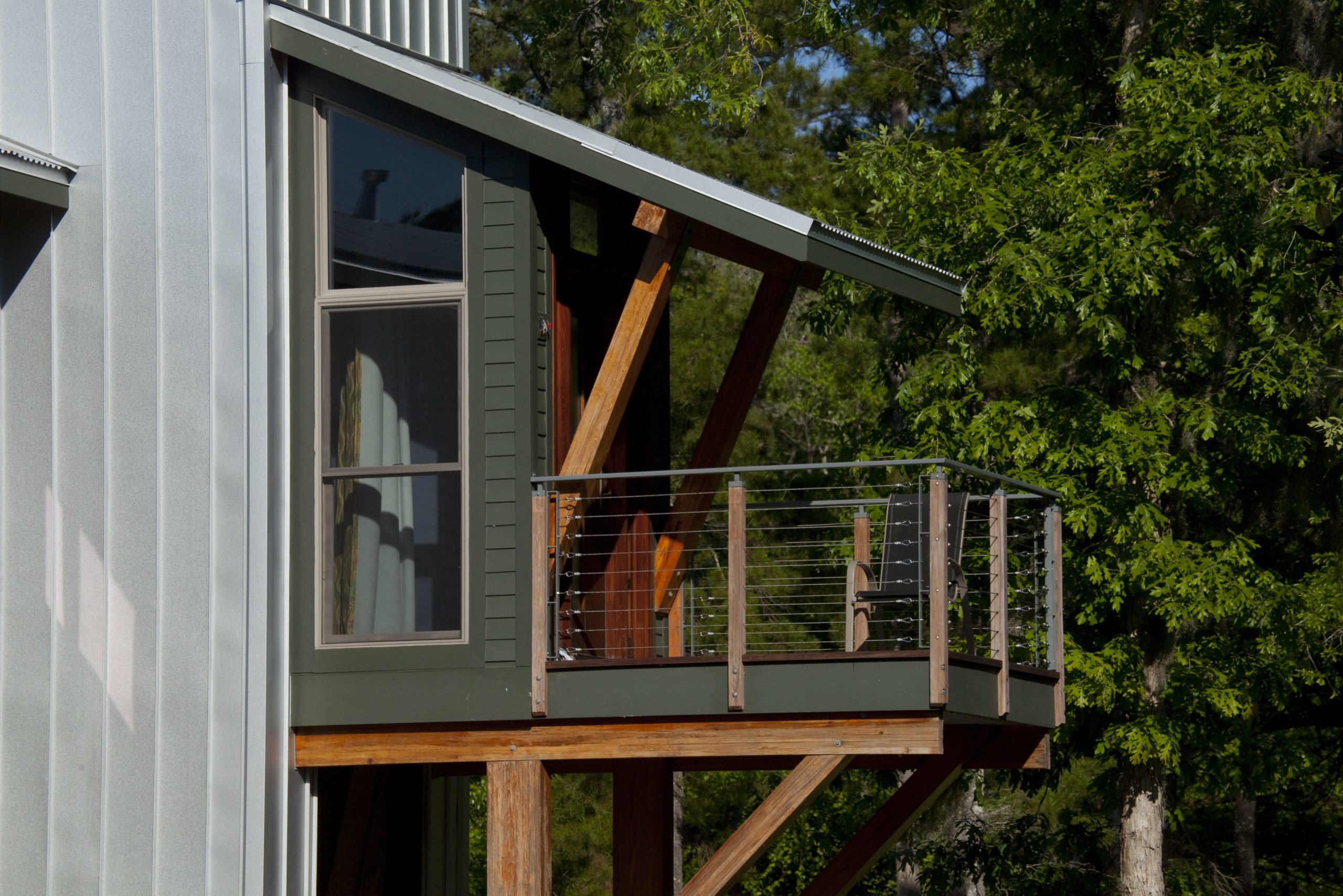 In 2004, Holly and Smith Architects assisted Dr. Will Kopfler with the design of their Cardiology Clinic in Hammond, La. In 2007, H/S was asked again to assist, but this time with their house in southern Ponchatoula, La. The Kopflers obtained a large wooded piece of property along Selzers Creek. The site contained an existing pond which was being fed by a flow well which was installed by the previous property owners. The house is sited to take advantage of the views to the creek and pond. Because the area is prone to flooding, the entire structure is raised approximately 10’ off the ground and positioned atop the highest point available on the site. The plan parti utilizes a successful strategy, first used by H/S with the Chauvin house, of separate pod structures.