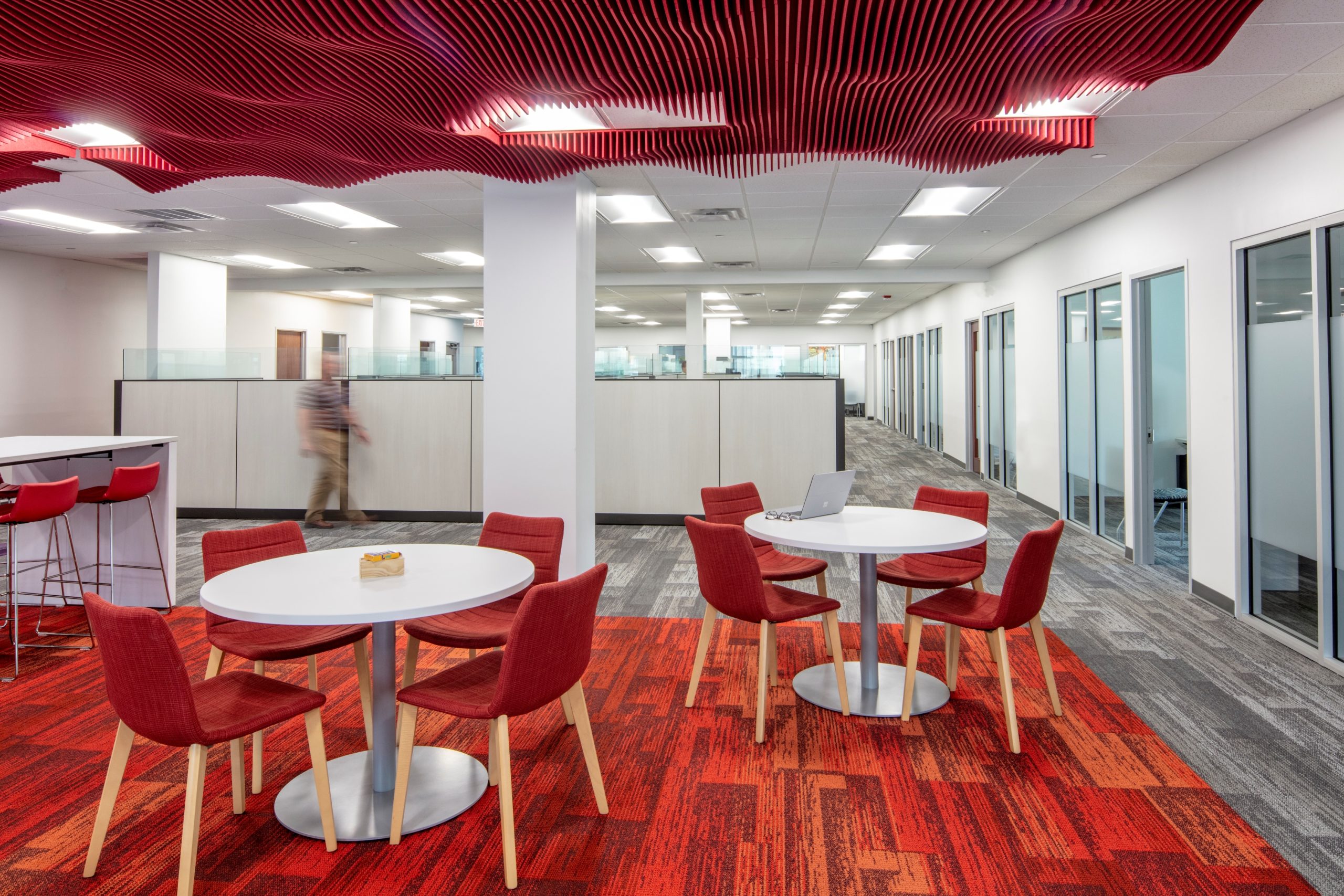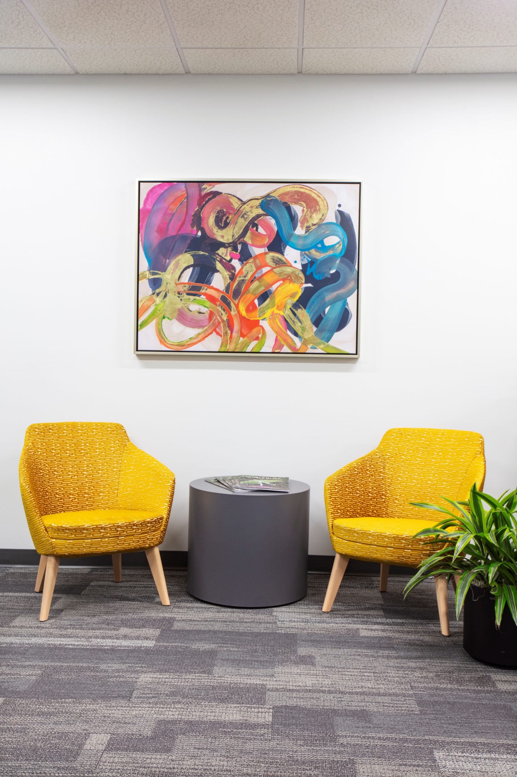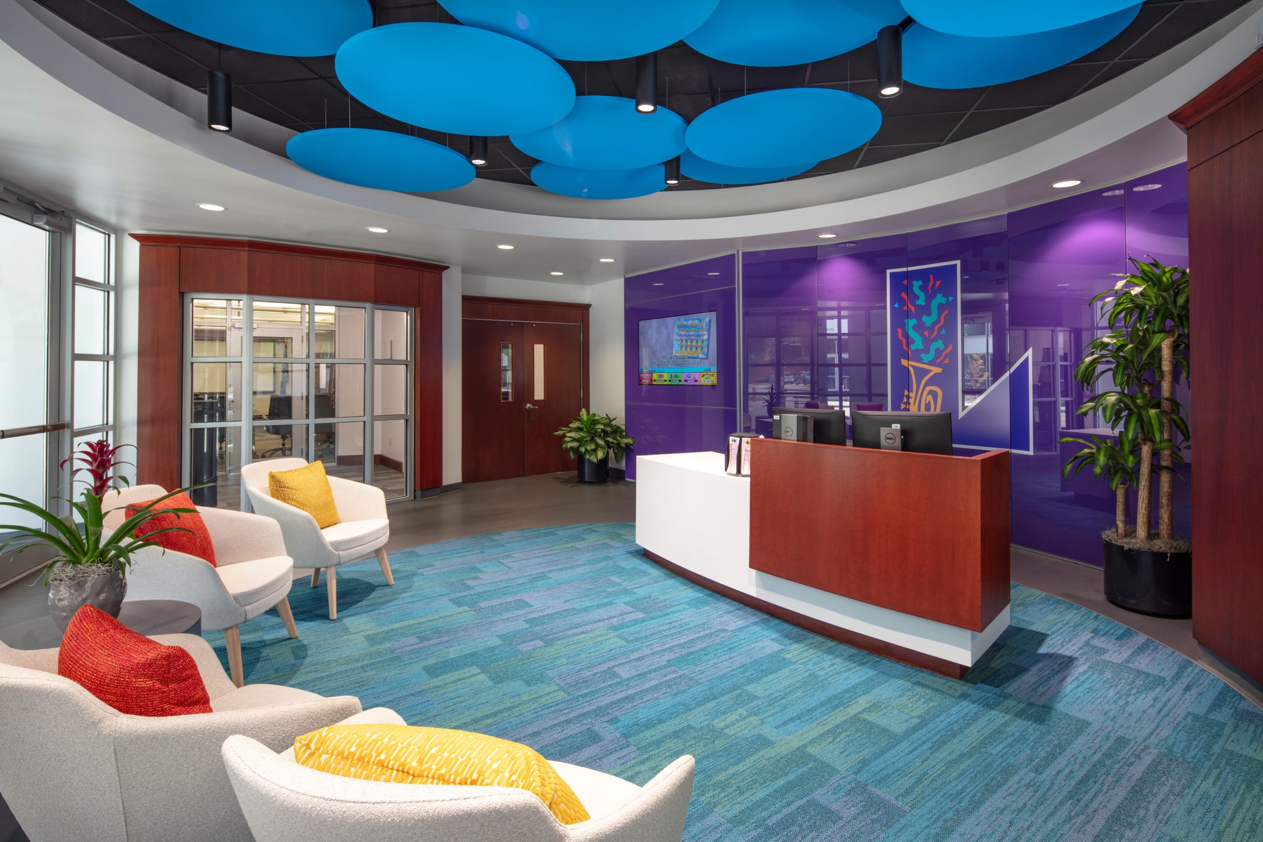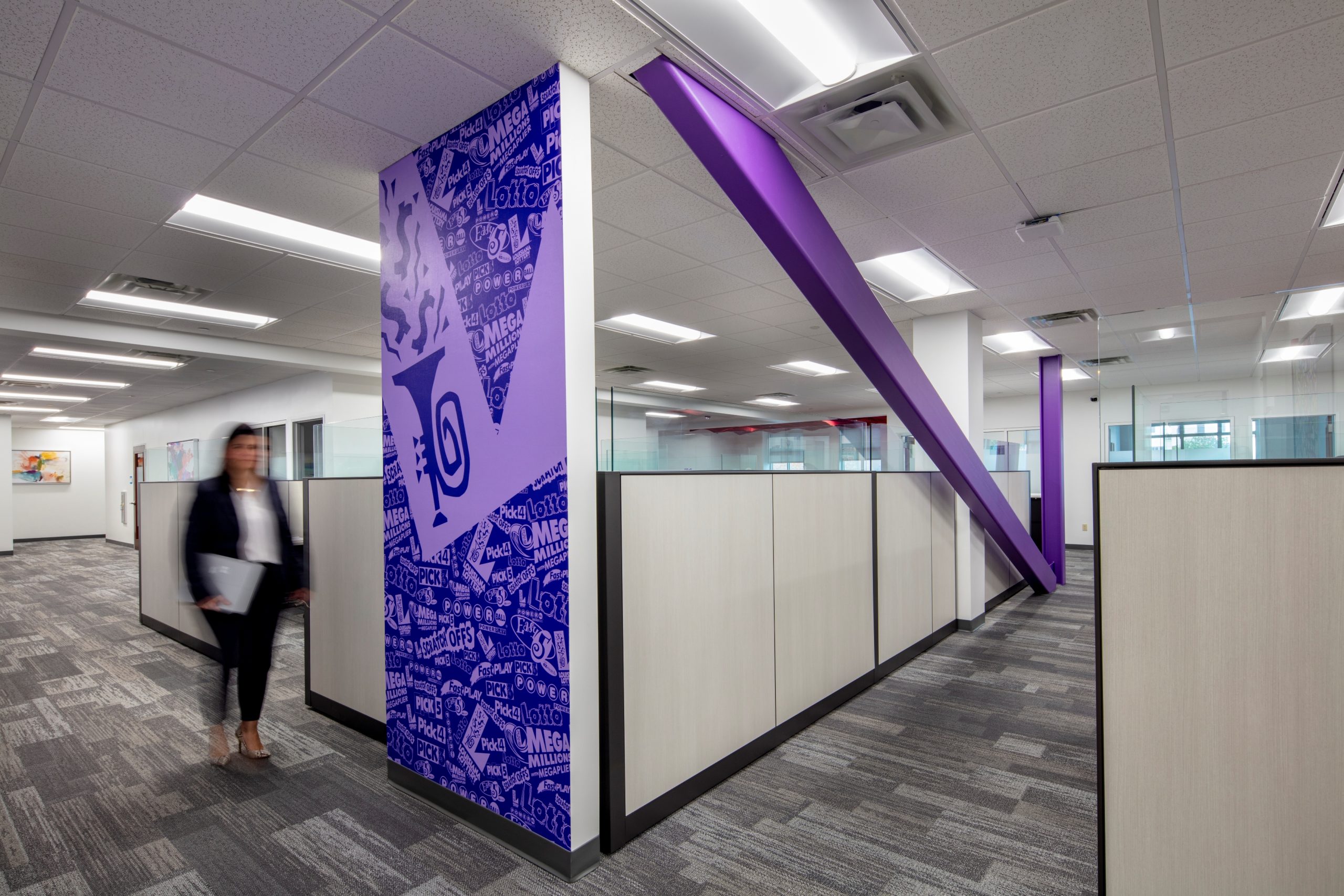 Strategic interior walls were demolished to create a more open office area, allowing for the addition of collaboration zones that encourage a more interactive work environment. Storefront glass was added to all perimeter offices to allow natural light to filter through the entire space for the benefit of all employees in the building. Core spaces such as the lobby, elevator lobbies, restrooms, breakroom, and corridors received new finishes, lighting, and artwork to align with the updated aesthetic. All furniture was updated to include adjustable height work surfaces for employee ergonomic wellness, lower panels for greater visibility, and collaborative furniture to encourage impromptu meetings. The color scheme was based on the company’s logo and aimed to create a more festive atmosphere that was in line with the company’s public-facing work. Custom graphic wallcoverings and accent carpet tiles were used to designate different zones within the office.