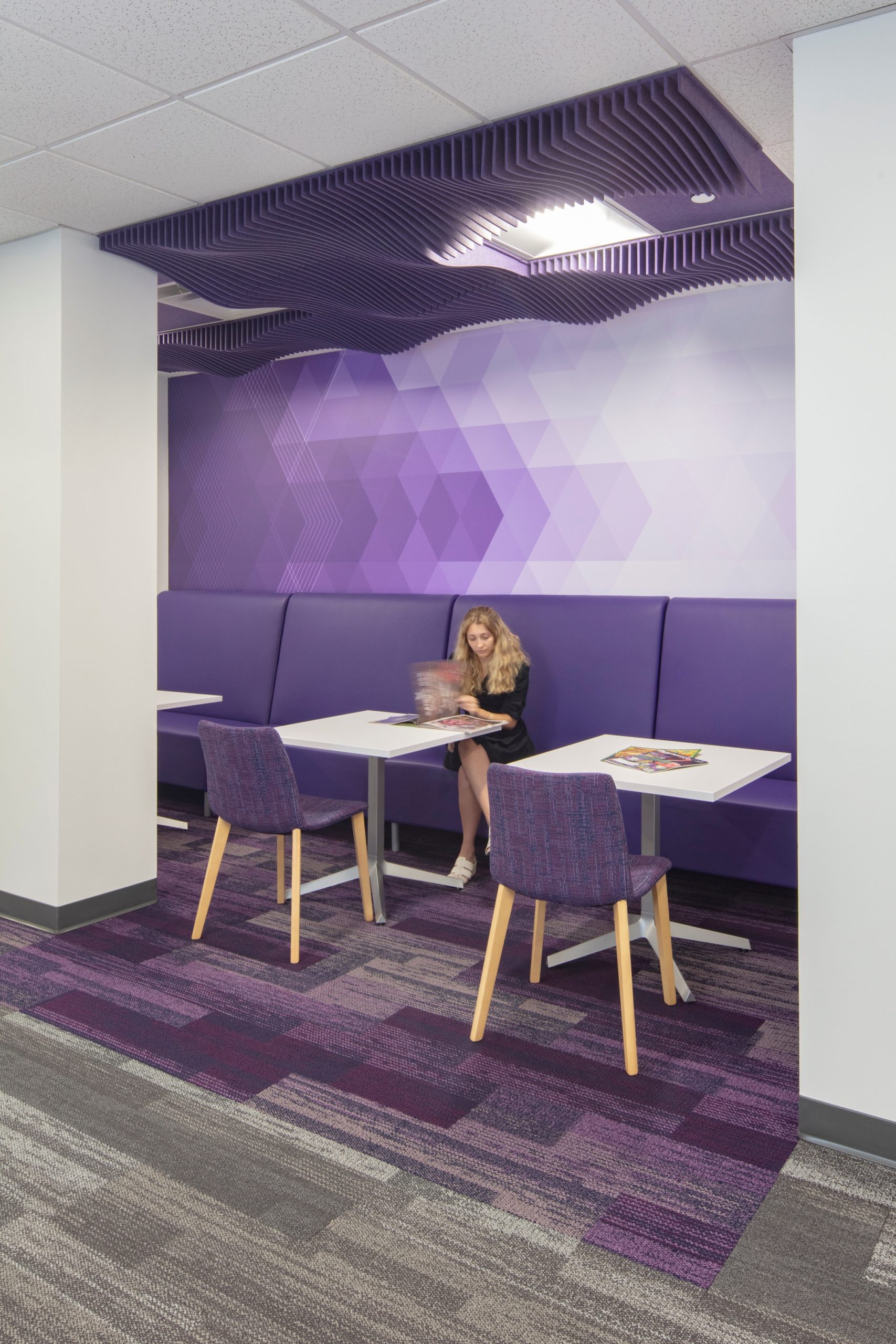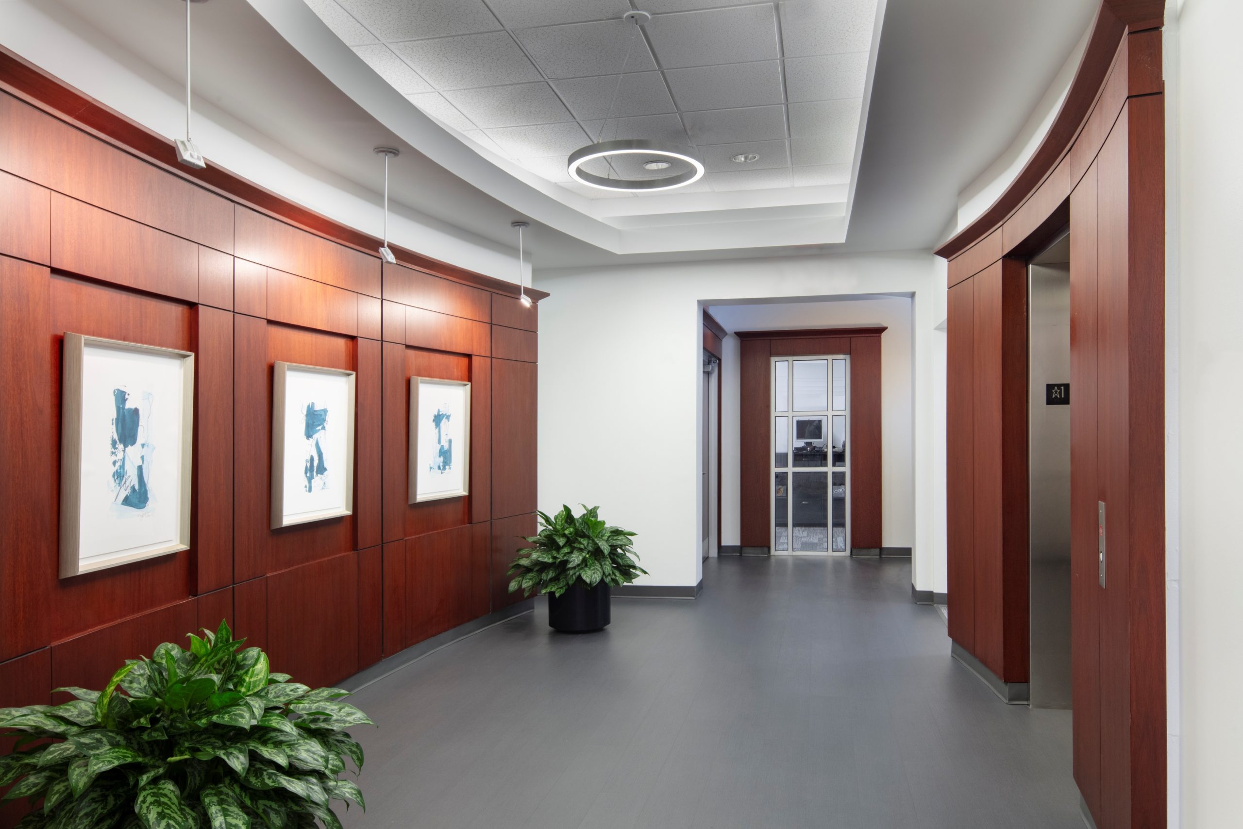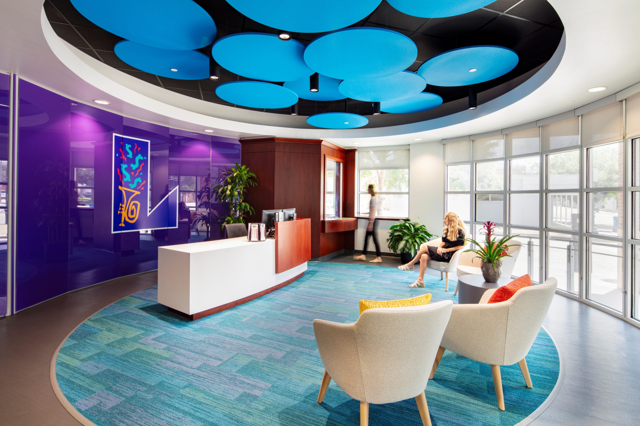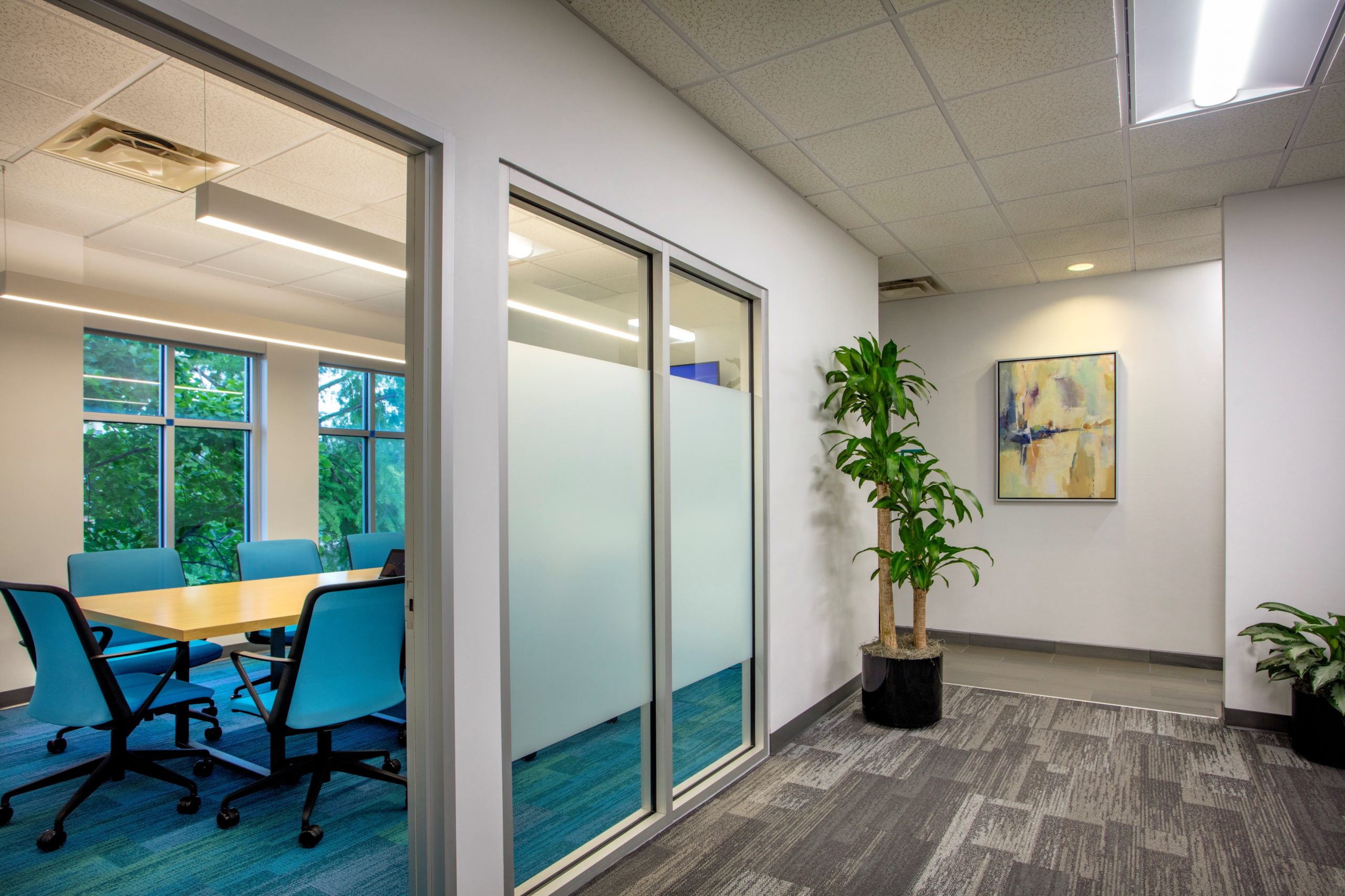 Strategic interior walls were demolished to create a more open office area, allowing for the addition of collaboration zones that encourage a more interactive work environment. Storefront glass was added to all perimeter offices to allow natural light to filter through the entire space for the benefit of all employees in the building. Core spaces such as the lobby, elevator lobbies, restrooms, breakroom, and corridors received new finishes, lighting, and artwork to align with the updated aesthetic. All furniture was updated to include adjustable height work surfaces for employee ergonomic wellness, lower panels for greater visibility, and collaborative furniture to encourage impromptu meetings. The color scheme was based on the company’s logo and aimed to create a more festive atmosphere that was in line with the company’s public-facing work. Custom graphic wallcoverings and accent carpet tiles were used to designate different zones within the office.