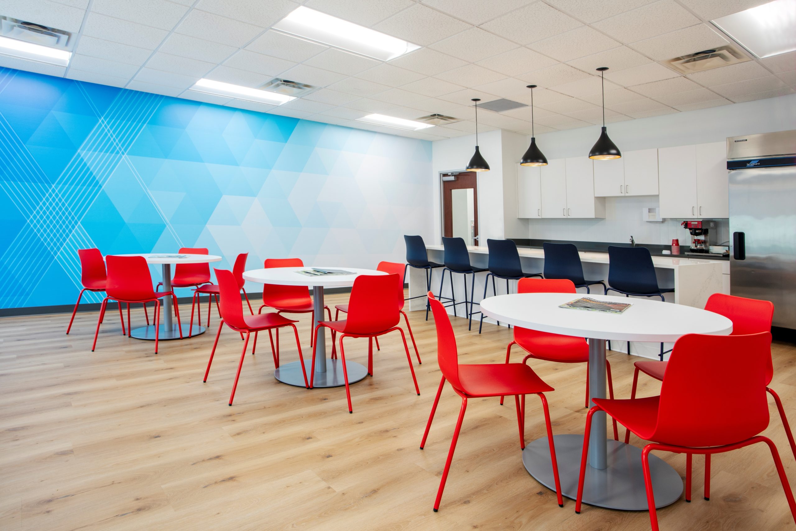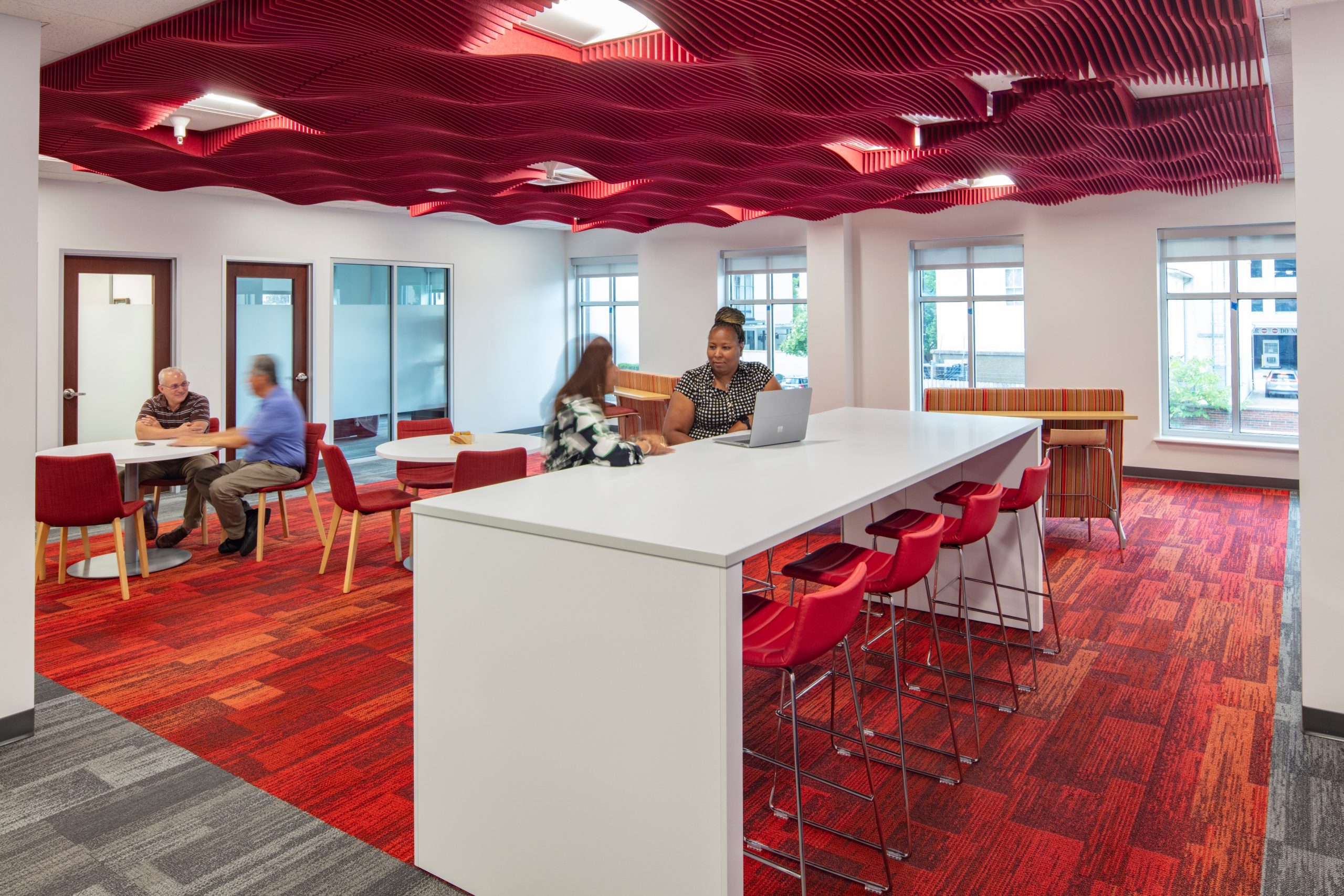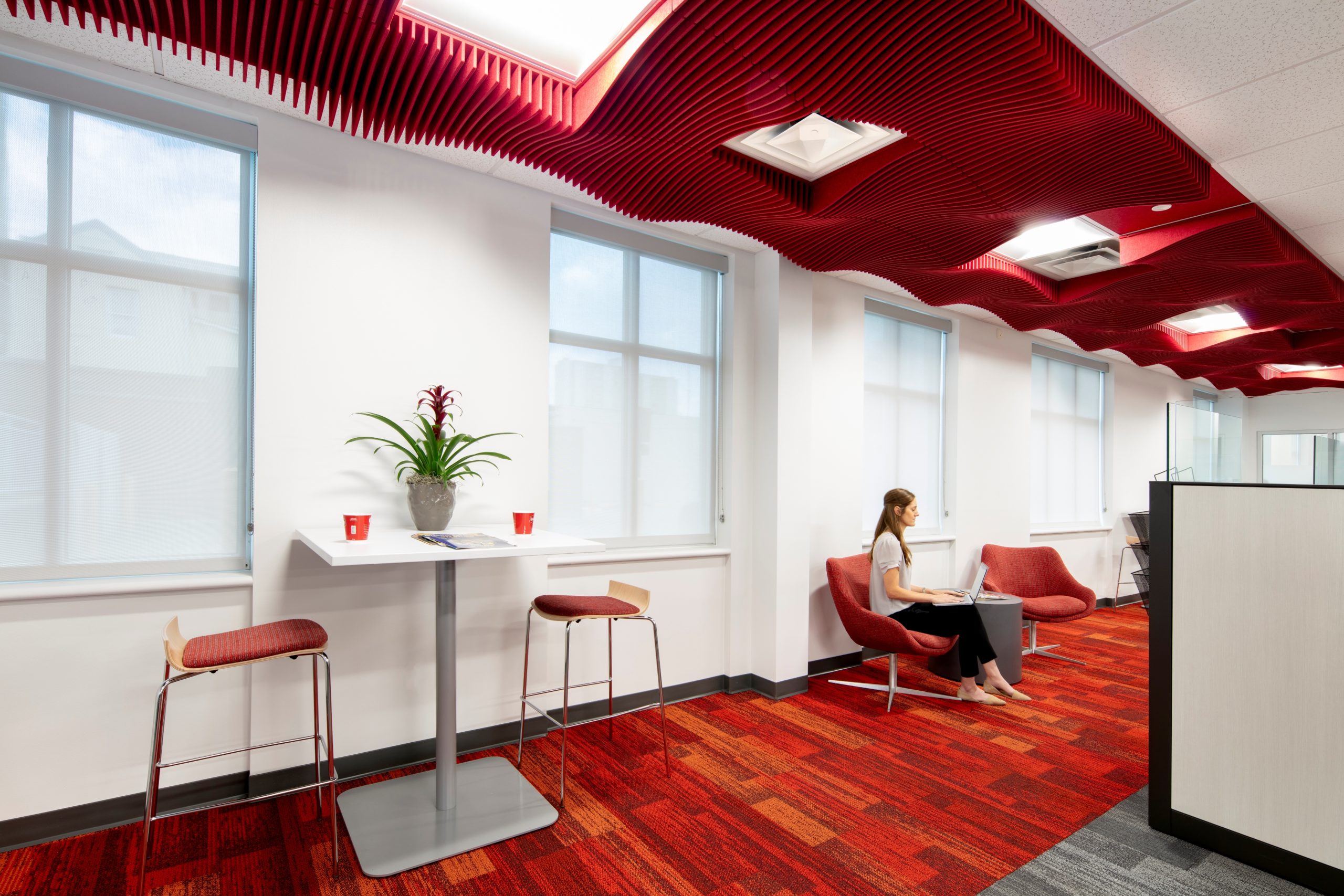This renovation successfully transformed the office building into a vibrant, modern workspace that fosters collaboration, transparency, wellbeing, and a welcoming atmosphere.