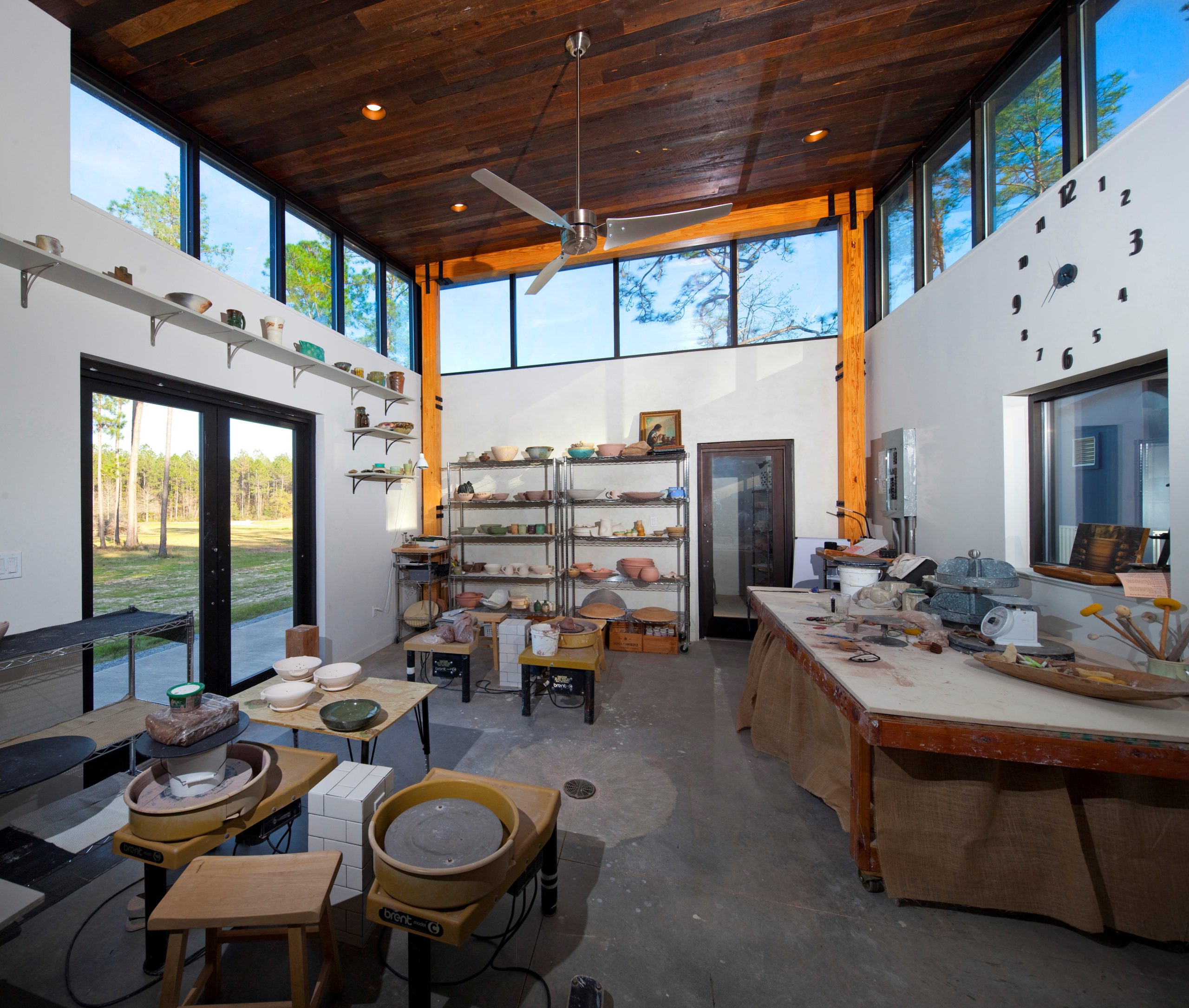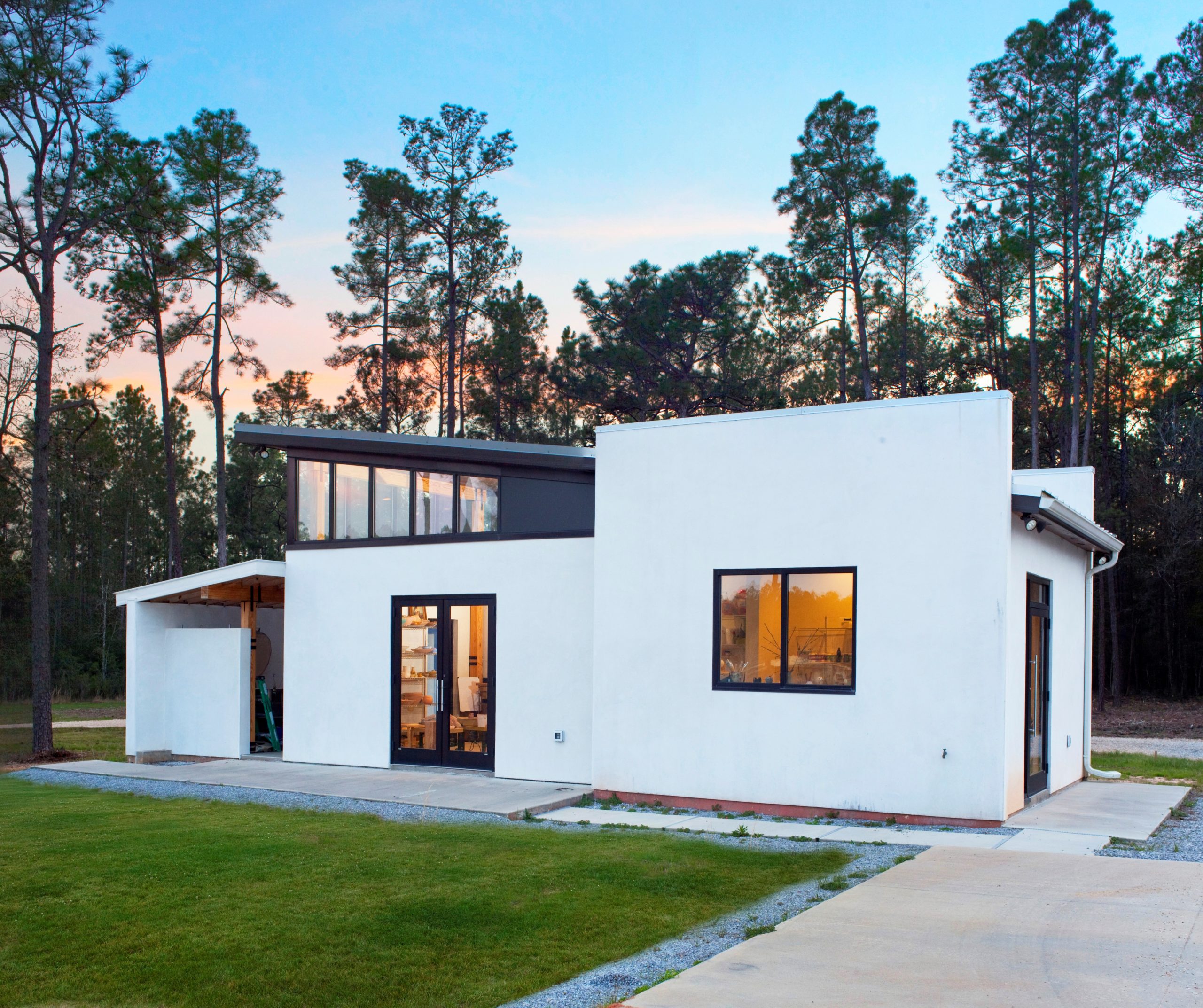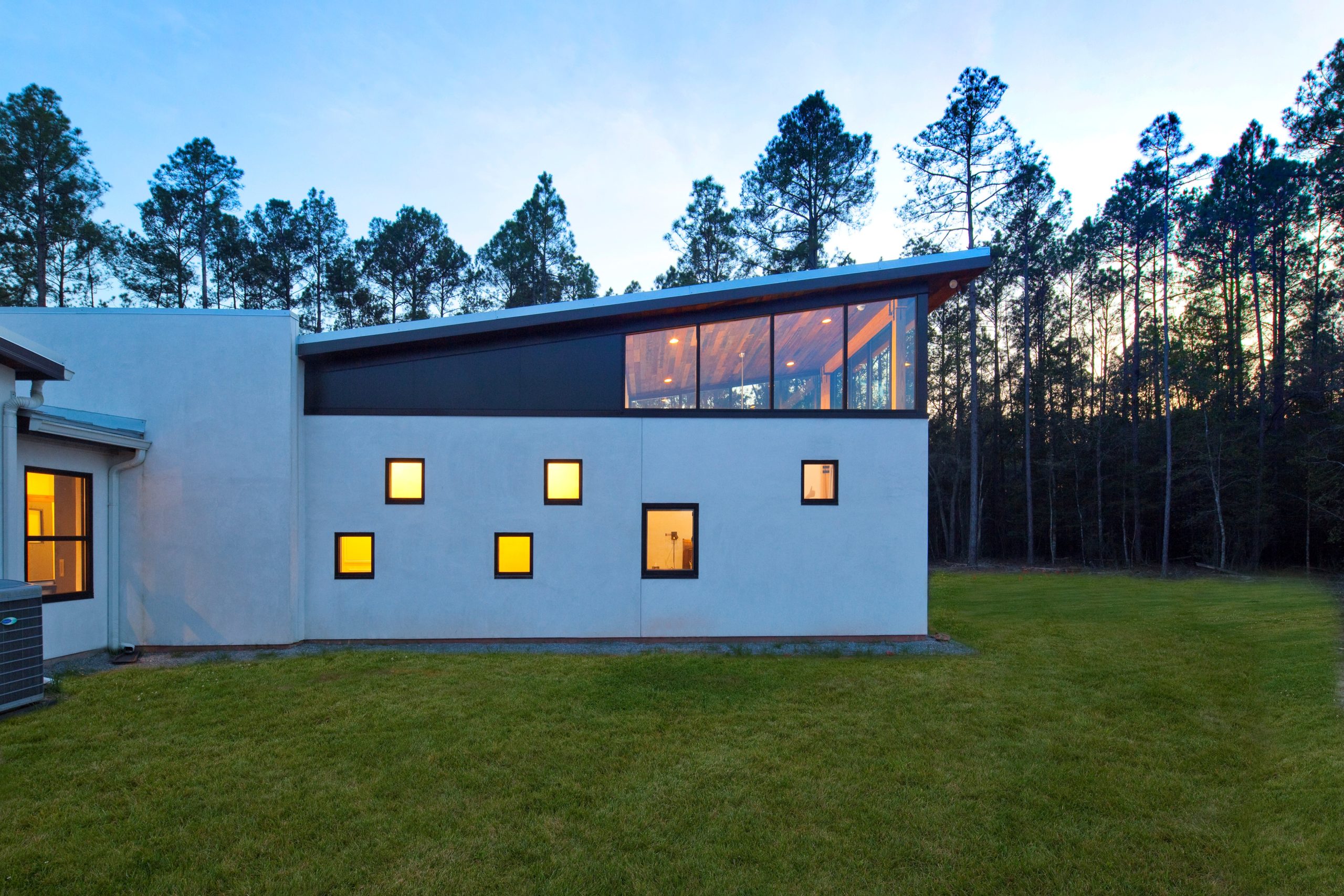 Sited within the owner’s self-pick Blueberry Farm, the Pinto House is located on the outskirts of Covington, La. On a high point of the site, it overlooks an existing pond and the blueberry fields. The house is compartmentalized into a series of programmatic pods. The pods are arranged along the axis of a water management system. Each of the pod roof forms, single slope/low slung metal roofs, stand opposing one another to direct the rainwater run-off into the management system and then out to the pond. The house utilizes a system of AAC (autoclaved aerated concrete) blocks and glue-laminated timbers as its primary structural support. The AAC serves as the insulation as well as the structure. The owners collaborated on designing and building the house by designing and fabricating the sliding barn doors, dining room table, and kitchen island. The ceilings and soffit are clad with salvaged heart pine from New Orleans.