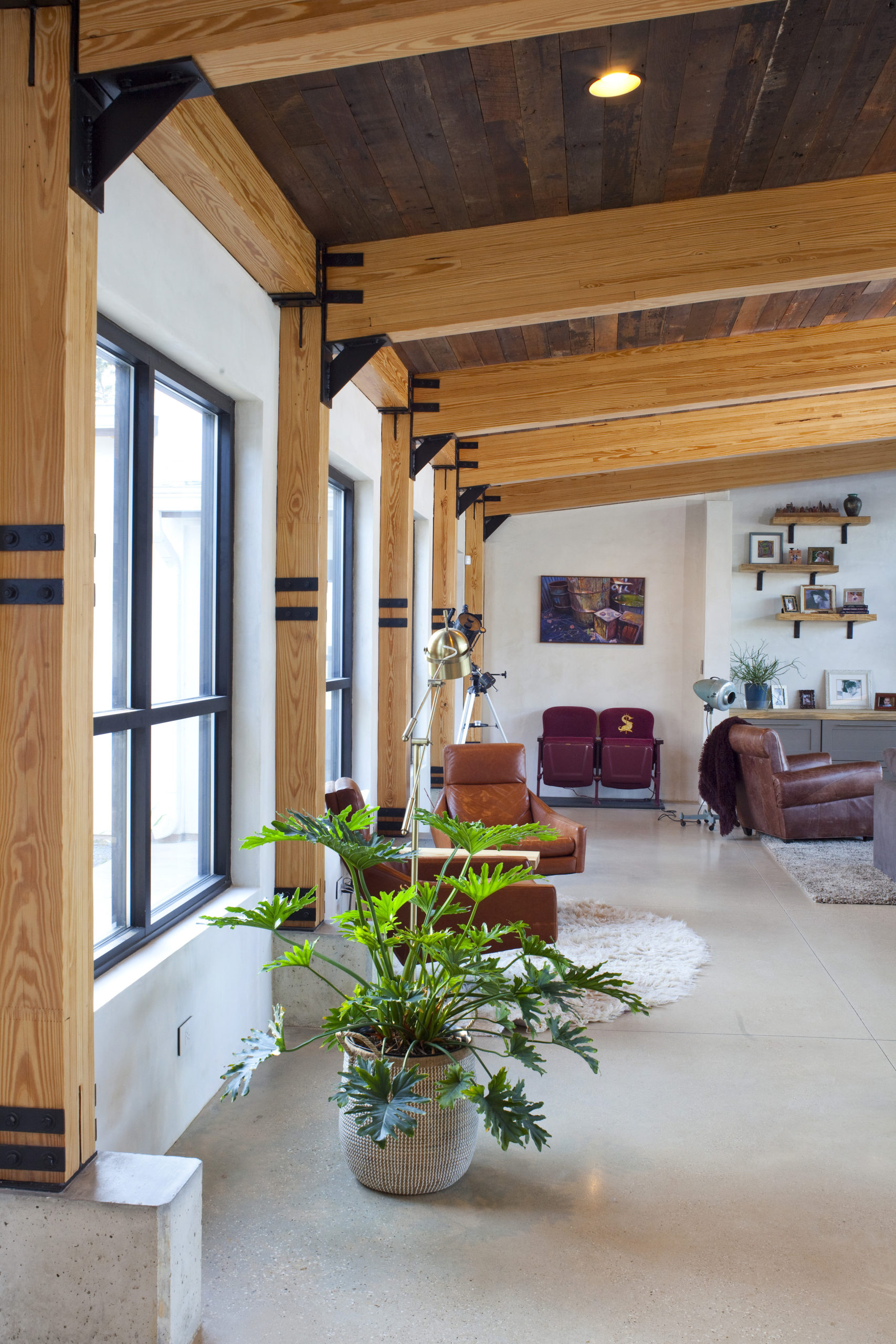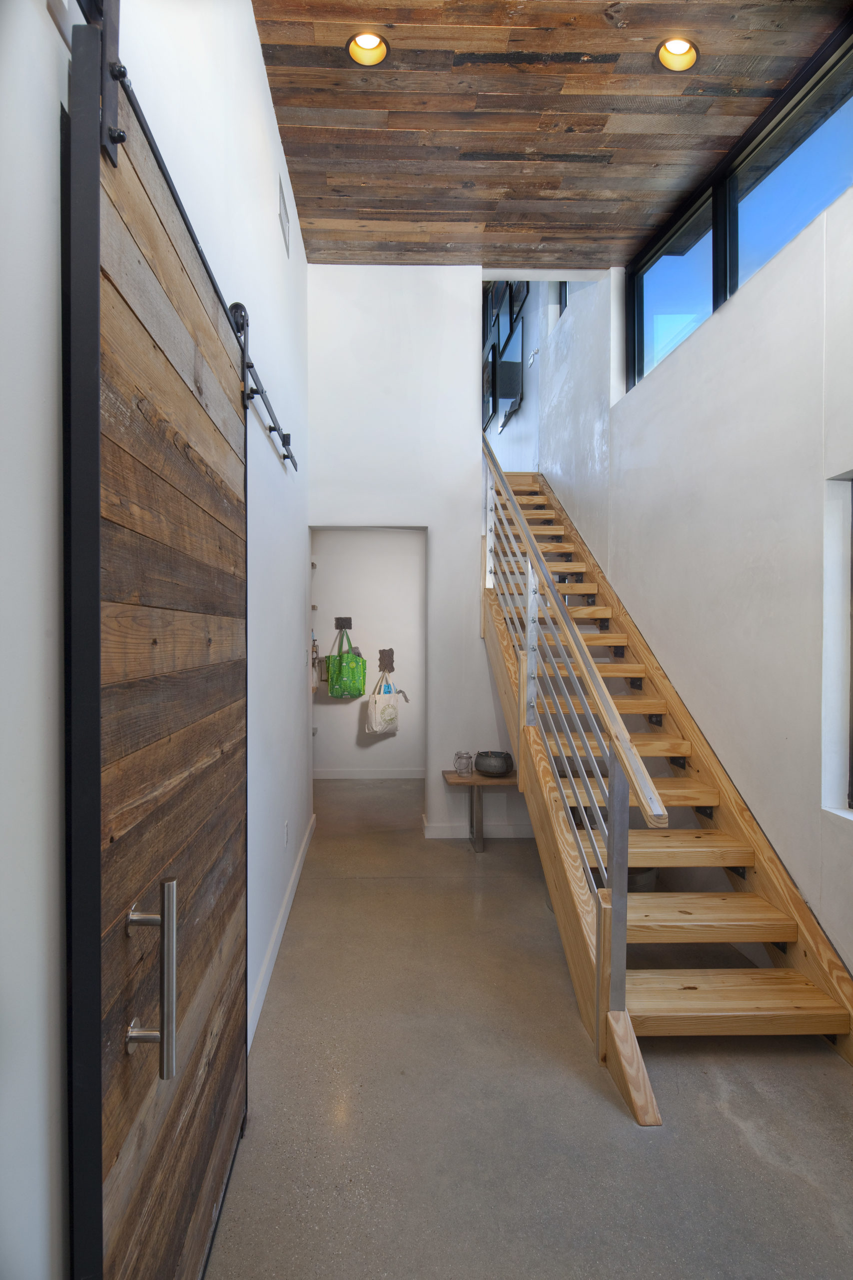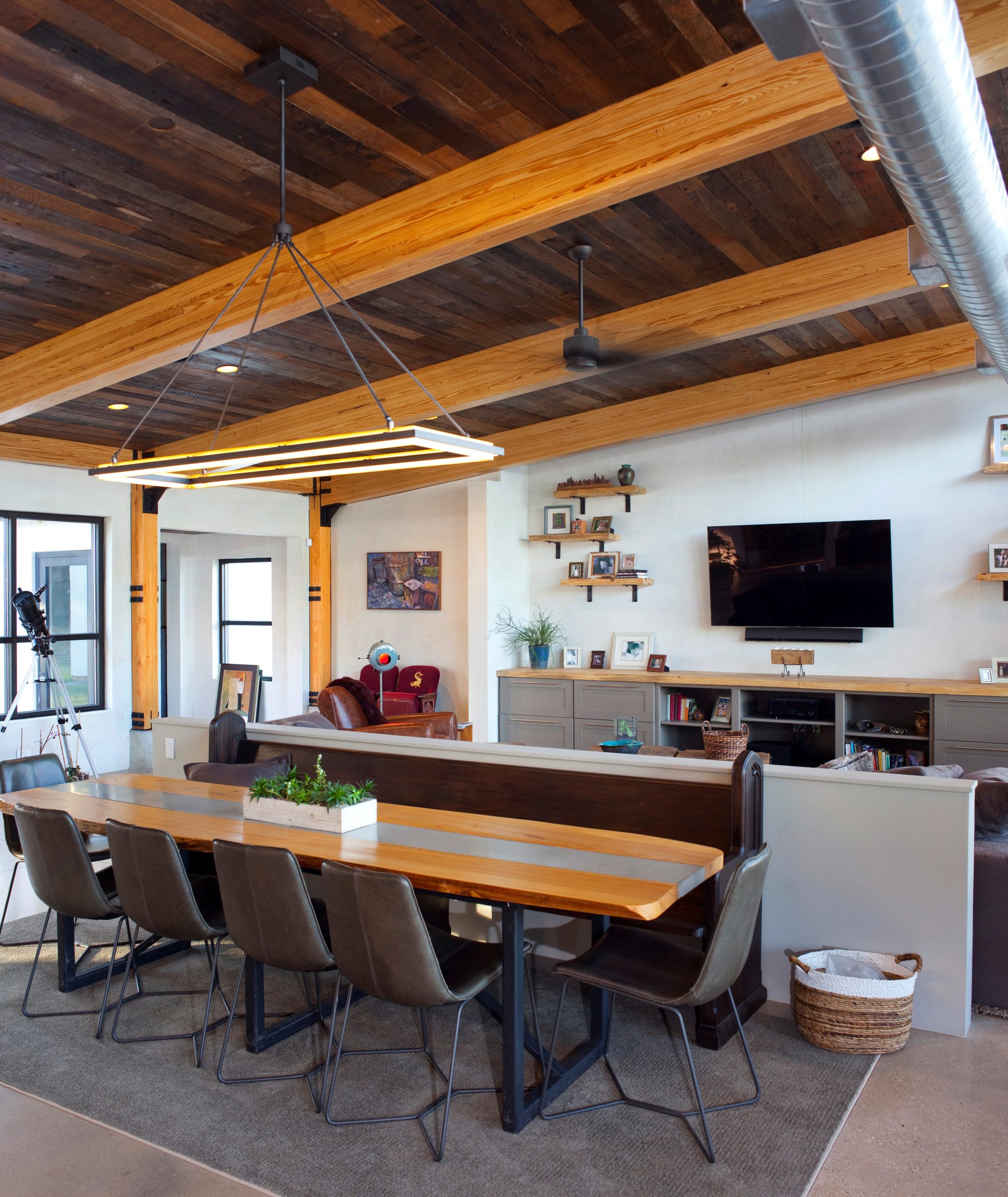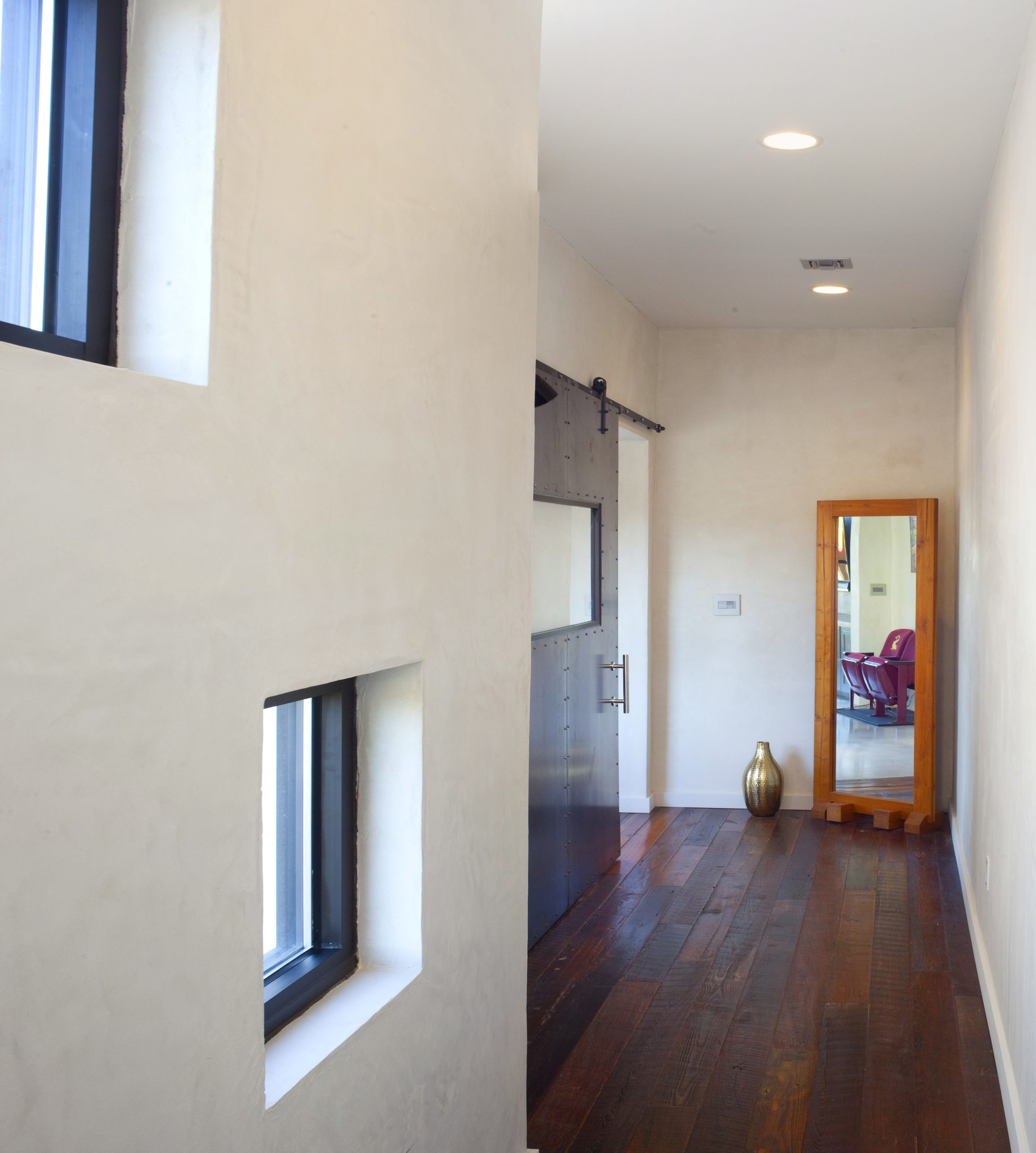 Sited within the owner’s self-pick Blueberry Farm, the Pinto House is located on the outskirts of Covington, La. On a high point of the site, it overlooks an existing pond and the blueberry fields. The house is compartmentalized into a series of programmatic pods. The pods are arranged along the axis of a water management system. Each of the pod roof forms, single slope/low slung metal roofs, stand opposing one another to direct the rainwater run-off into the management system and then out to the pond. The house utilizes a system of AAC (autoclaved aerated concrete) blocks and glue-laminated timbers as its primary structural support. The AAC serves as the insulation as well as the structure. The owners collaborated on designing and building the house by designing and fabricating the sliding barn doors, dining room table, and kitchen island. The ceilings and soffit are clad with salvaged heart pine from New Orleans.