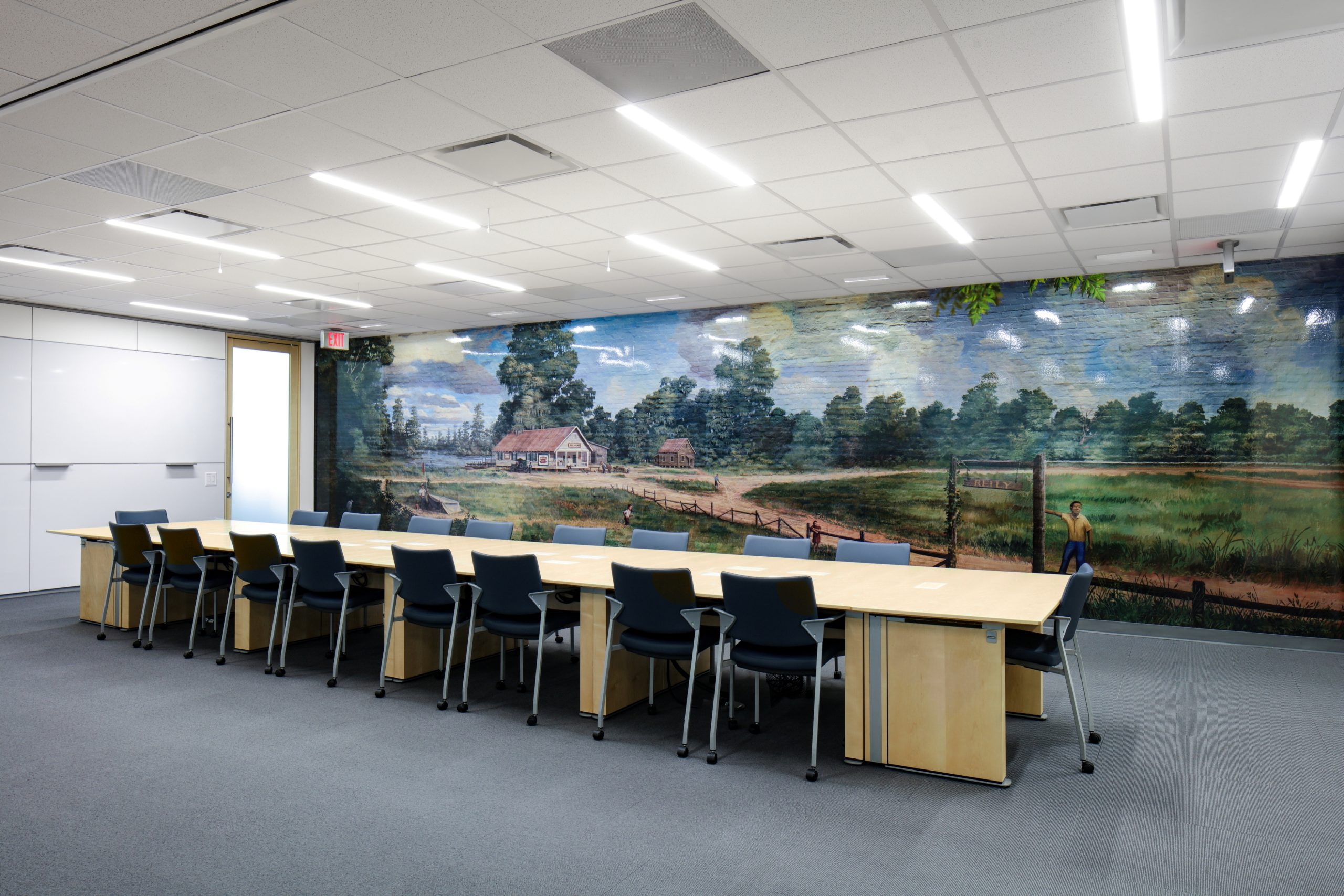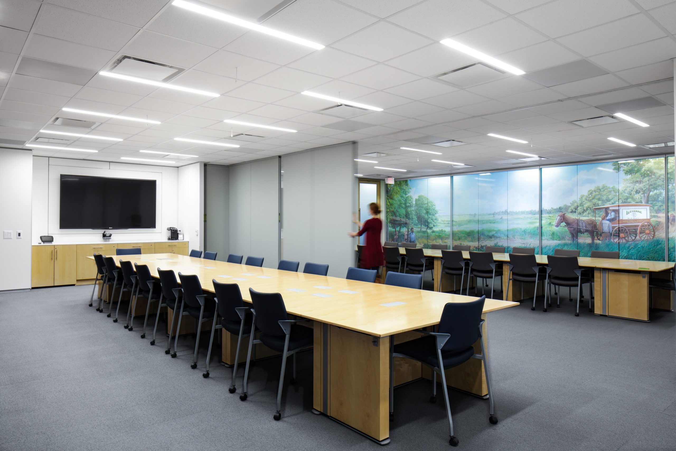 Additional spaces include a large conference room that can be separated by an operable partition, smaller conference rooms, a large print room, a large break room, and a reception/lounge area. Large panelized graphics of the company’s brands are incorporated throughout the space and delineate the separation between the corridor and the open workstations. The large conference room features two murals recreated from a painting that was set to be demolished from the company’s original office building.