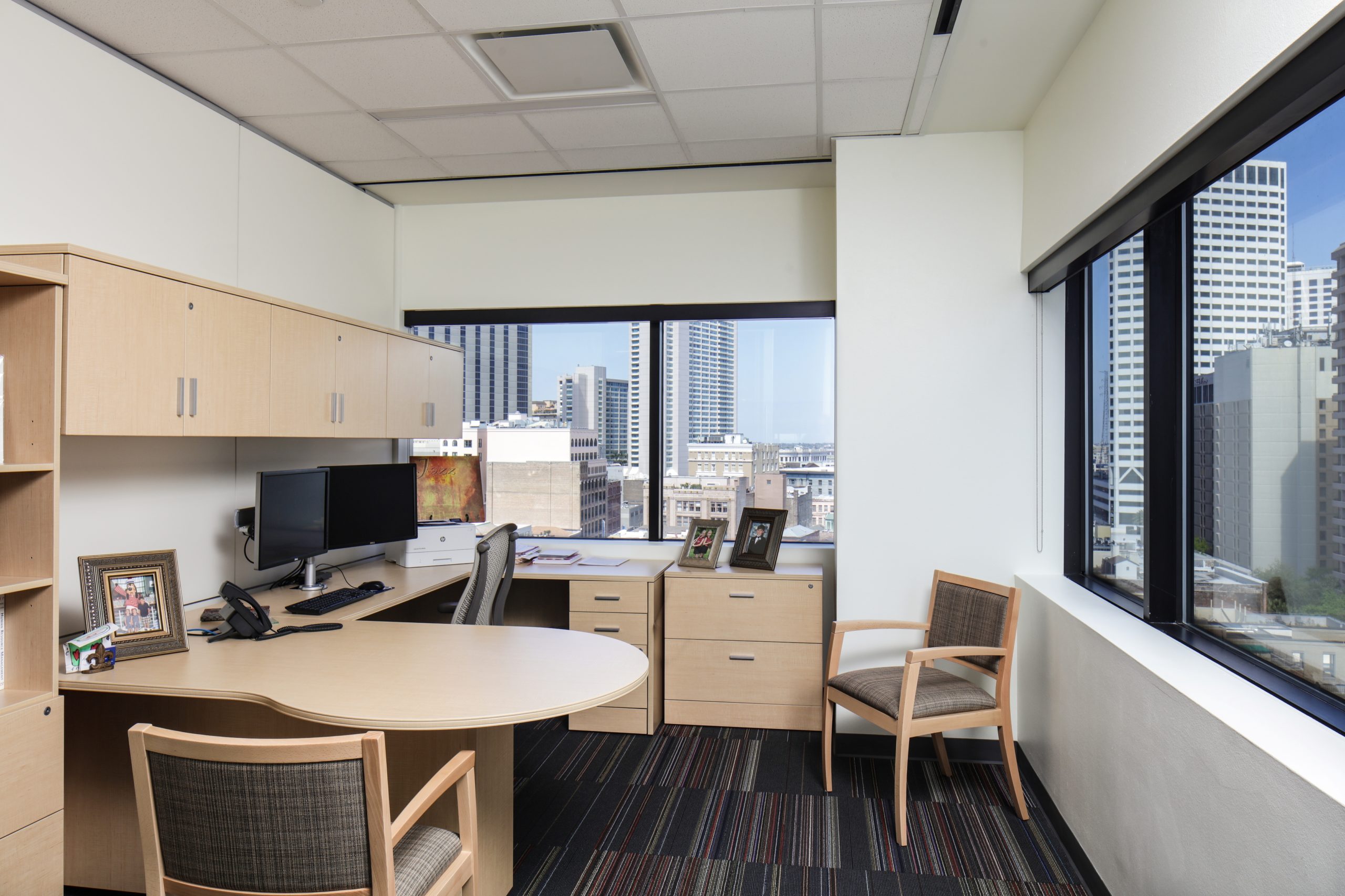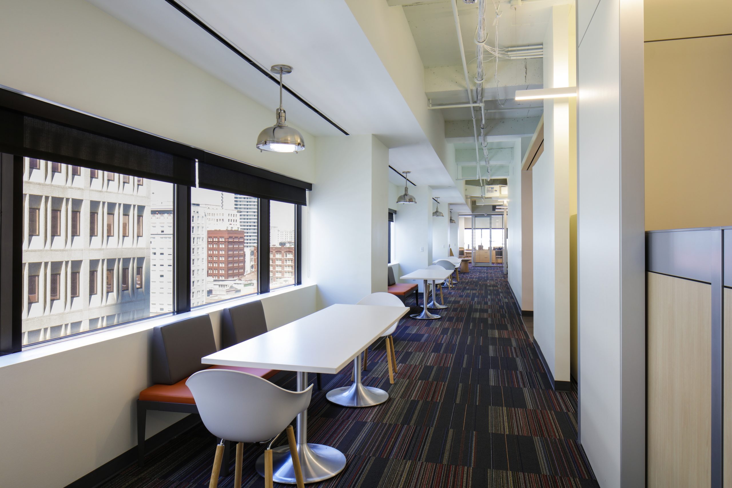 The space’s layout features continuous offices along the north and south perimeter walls with continuous glazing, which allows natural daylight and city views into the main office space. The open office environment is separated by departments with workstations with lower-height partitions and a glass panel above to provide a sense of privacy. The open workstations are pulled away from the perimeter of the high-rise office building to allow for collaboration space along the east and west walls. The collaboration areas have ample seating and writable surfaces to encourage interaction between the different departments while providing natural light and views to the city skyline.