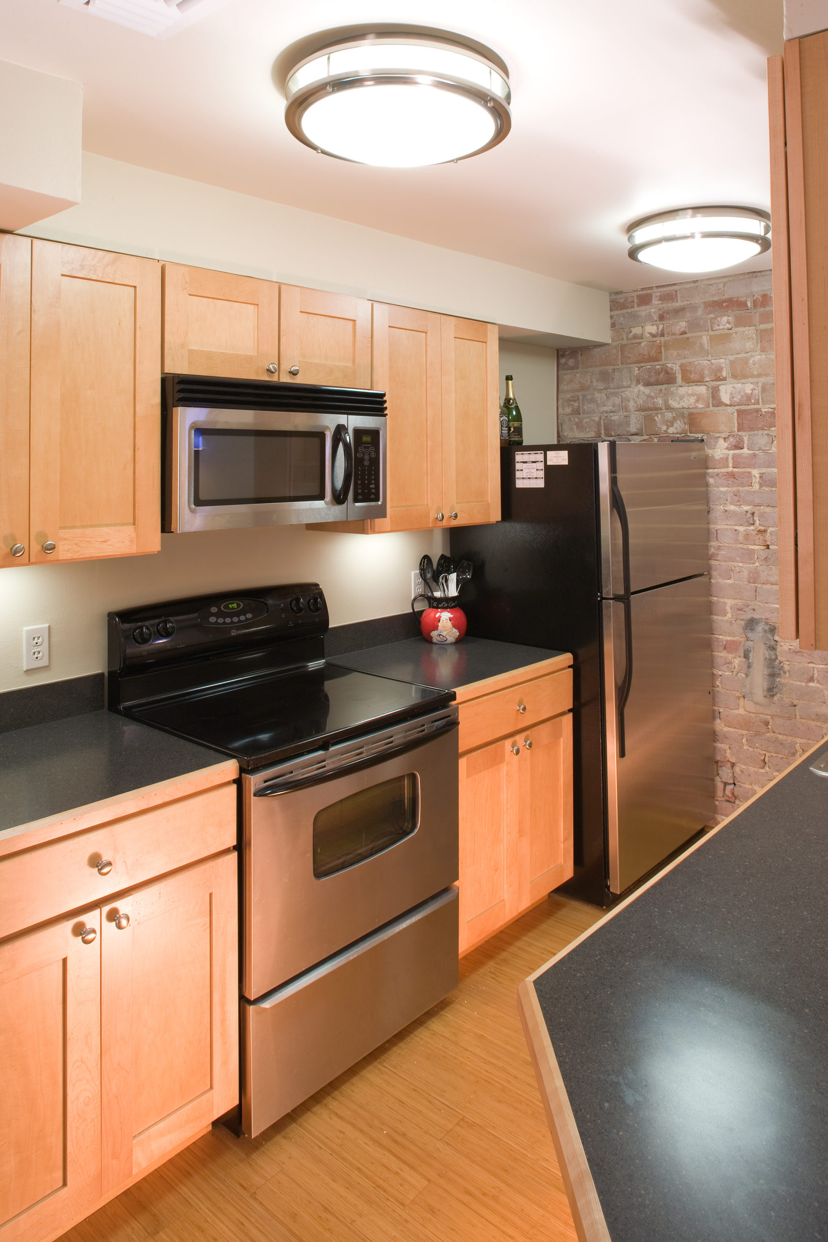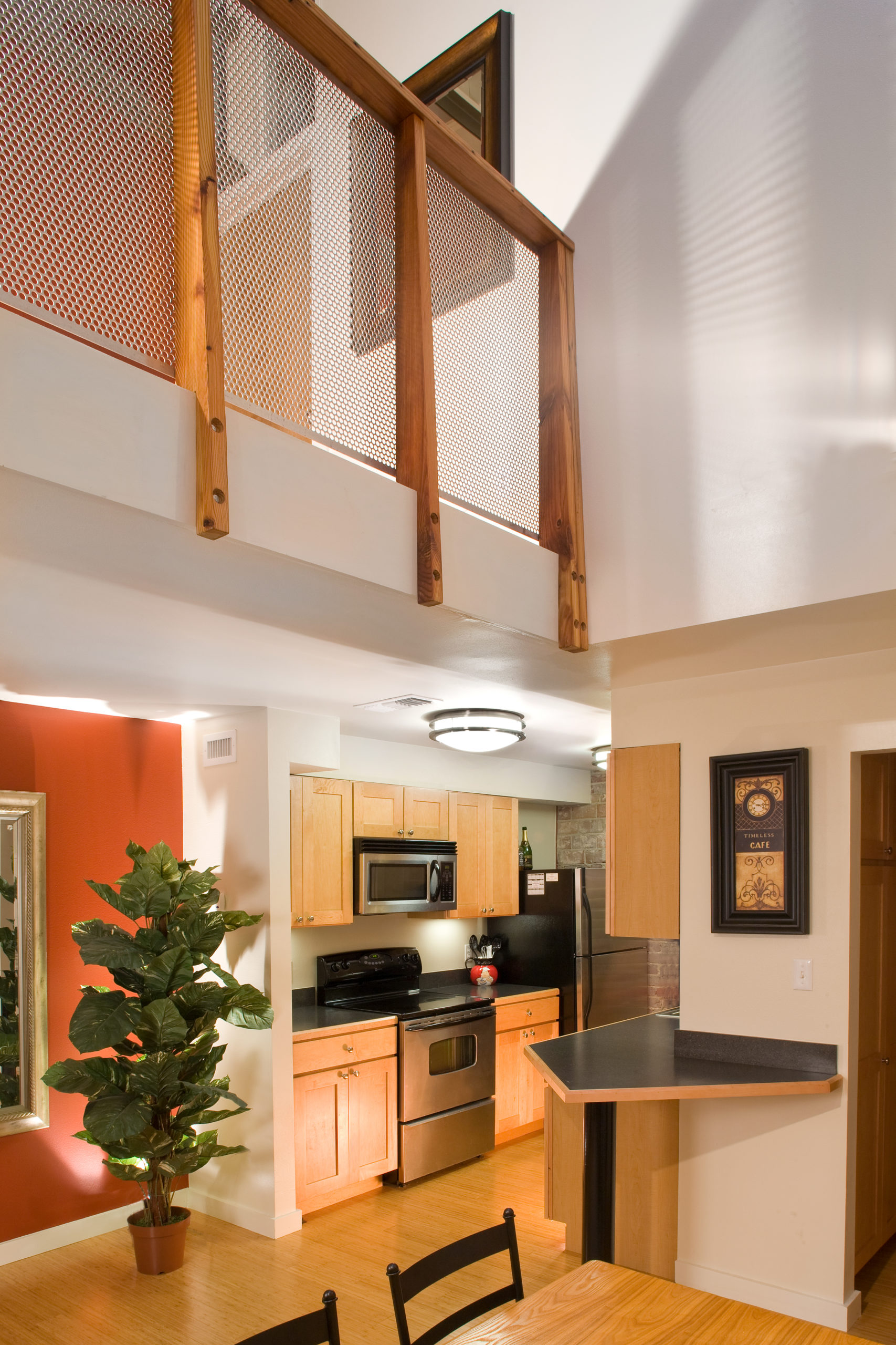 This adaptive reuse of a historic 1905 theatre that was abandoned and in extreme disrepair, involved a total reworking of the interior space. Years of decay and water damage allowed for only the exterior shell to be salvaged. A garage inserted at the ground level provides parking for the seven townhouse units above. The garage door was specifically designed to mimic the storefront entrance to the theatre. Above this entrance, the original marquee and neon sign was restored with historic accuracy. A heavily landscaped alley to the north of the building allows for entrance into the units front doors. Every tenant has their own private entry from the courtyard or the garage directly into their apartment. The alley allows north light to illuminate the apartments living rooms and bedroom. A vertical connection between the upper and lower floors makes for a voluminous space. The buildings original bow-shaped steel trusses support an exposed painted wood ceiling while the walls juxtapose them creating dynamic and engaging spaces.