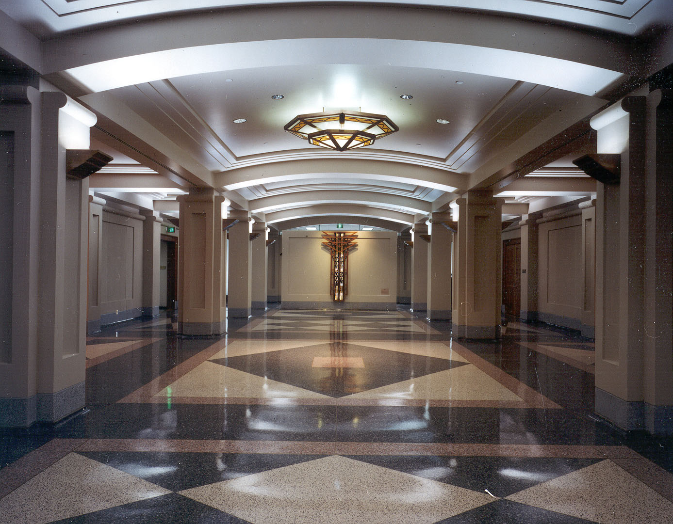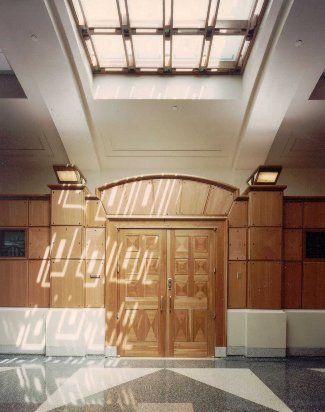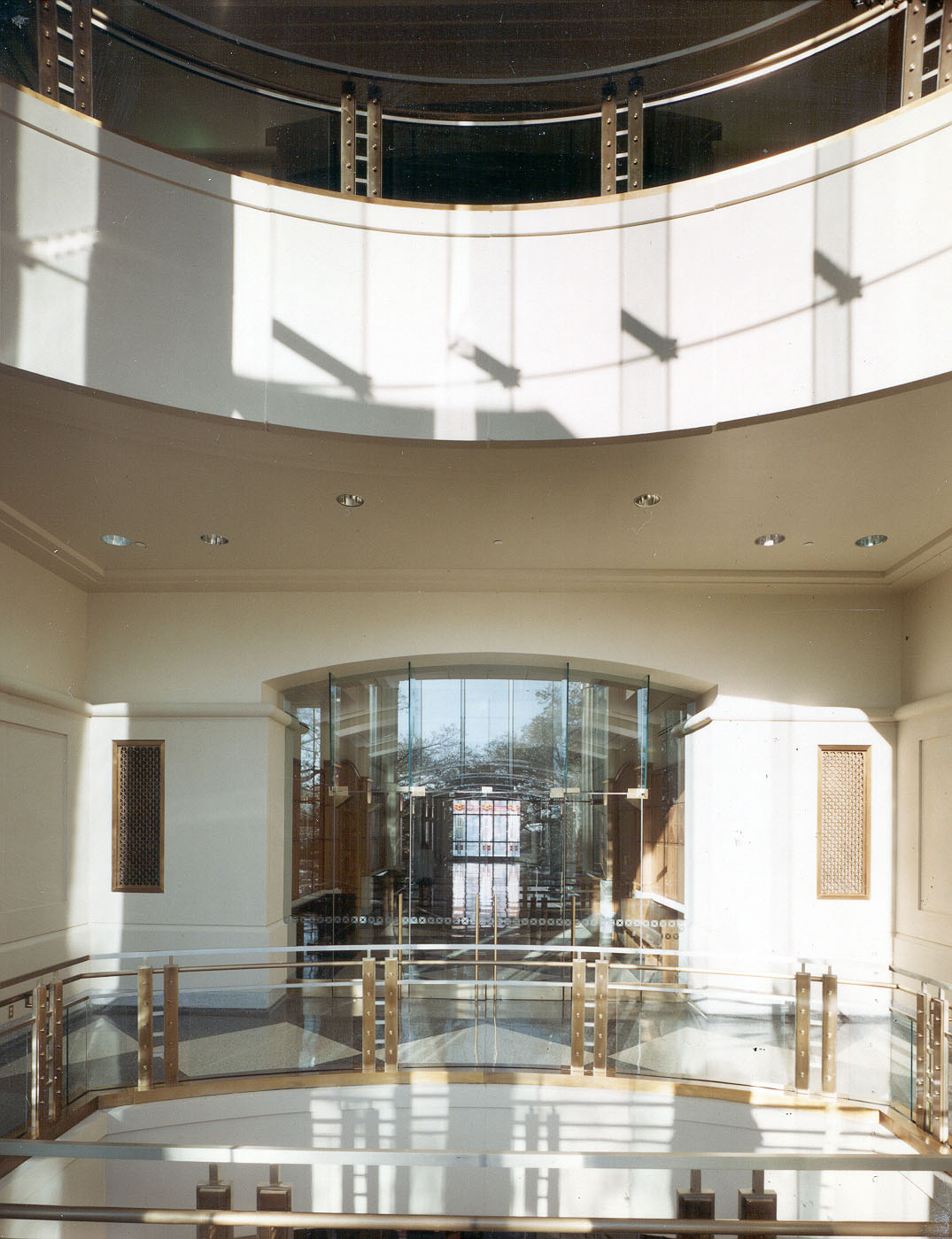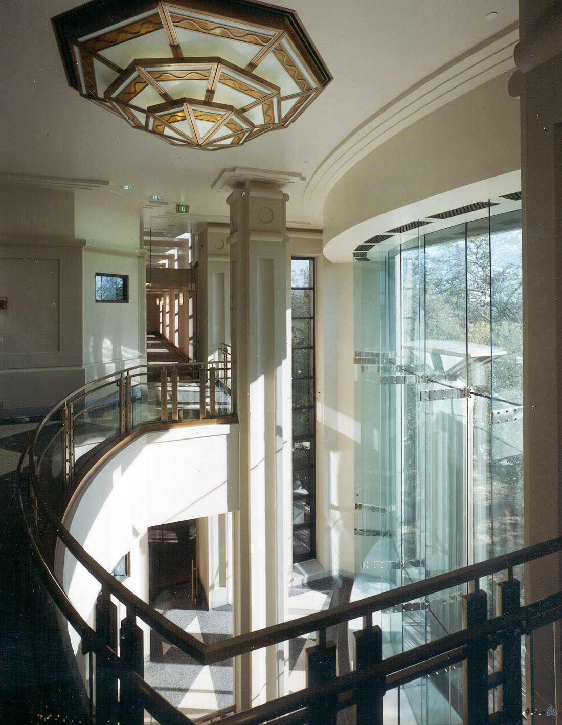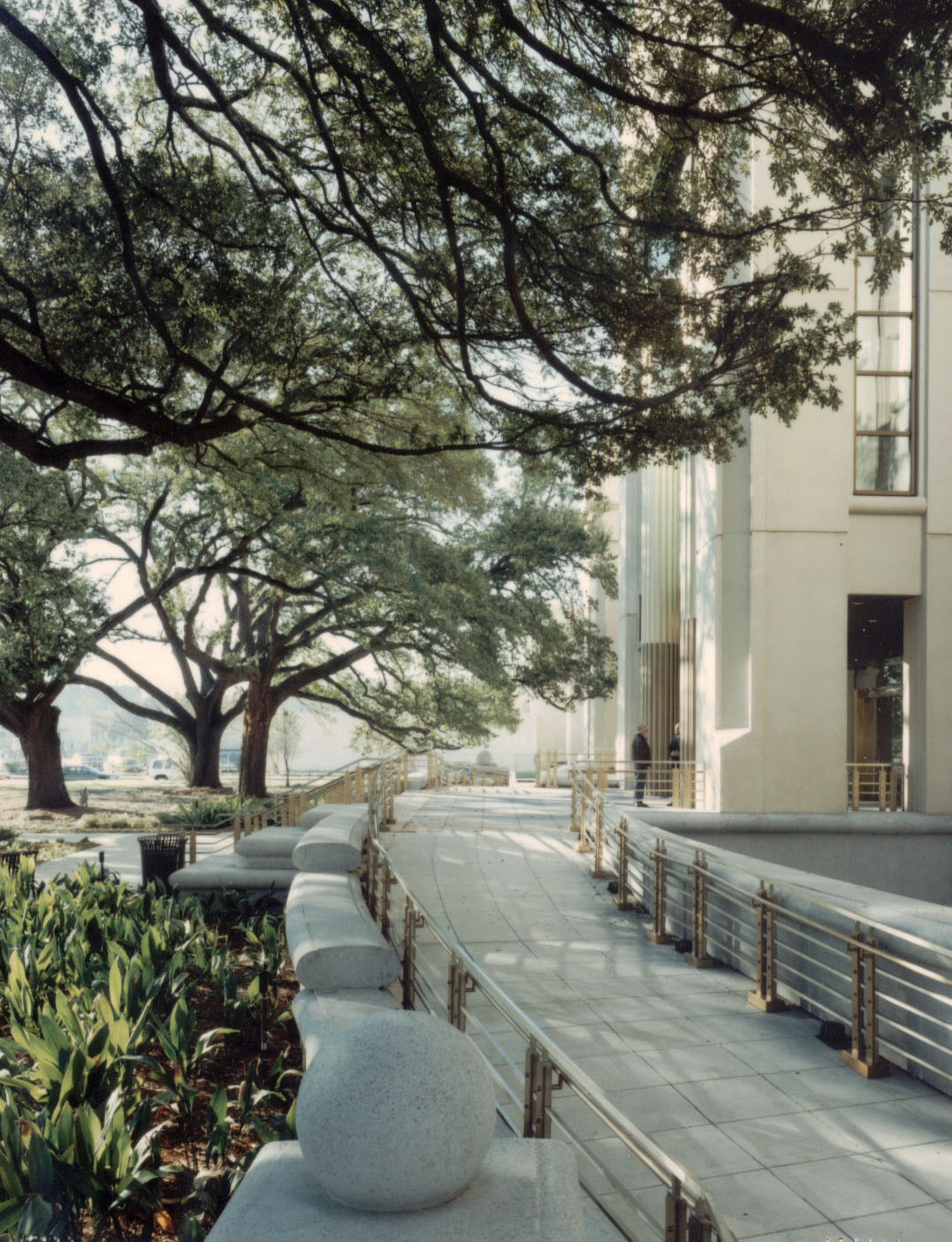 The structure is a significant addition to the city and the gateway to the historic downtown district of Baton Rouge. The site is adjacent to the existing 1932 Art Moderne Federal Courthouse. A large grove of mature oak trees gives character to the site. The new building is designed to respond to the specific goals of the owner; (1) save and incorporate the live oak trees into the design; (2) make reference to the 1932 Courthouse with color, architectural treatment and scale; and (3) provide modern, effective facilities for the United States District Courthouse and Federal Government. Compatibility between the new and old courthouse is achieved by the use of simulated limestone architectural concrete panels with intricate detailing sensitive to the 1932’s limestone detailing. Also, the massing was reduced to relate the existing courthouse by use of the basement areas with below grade gardens.