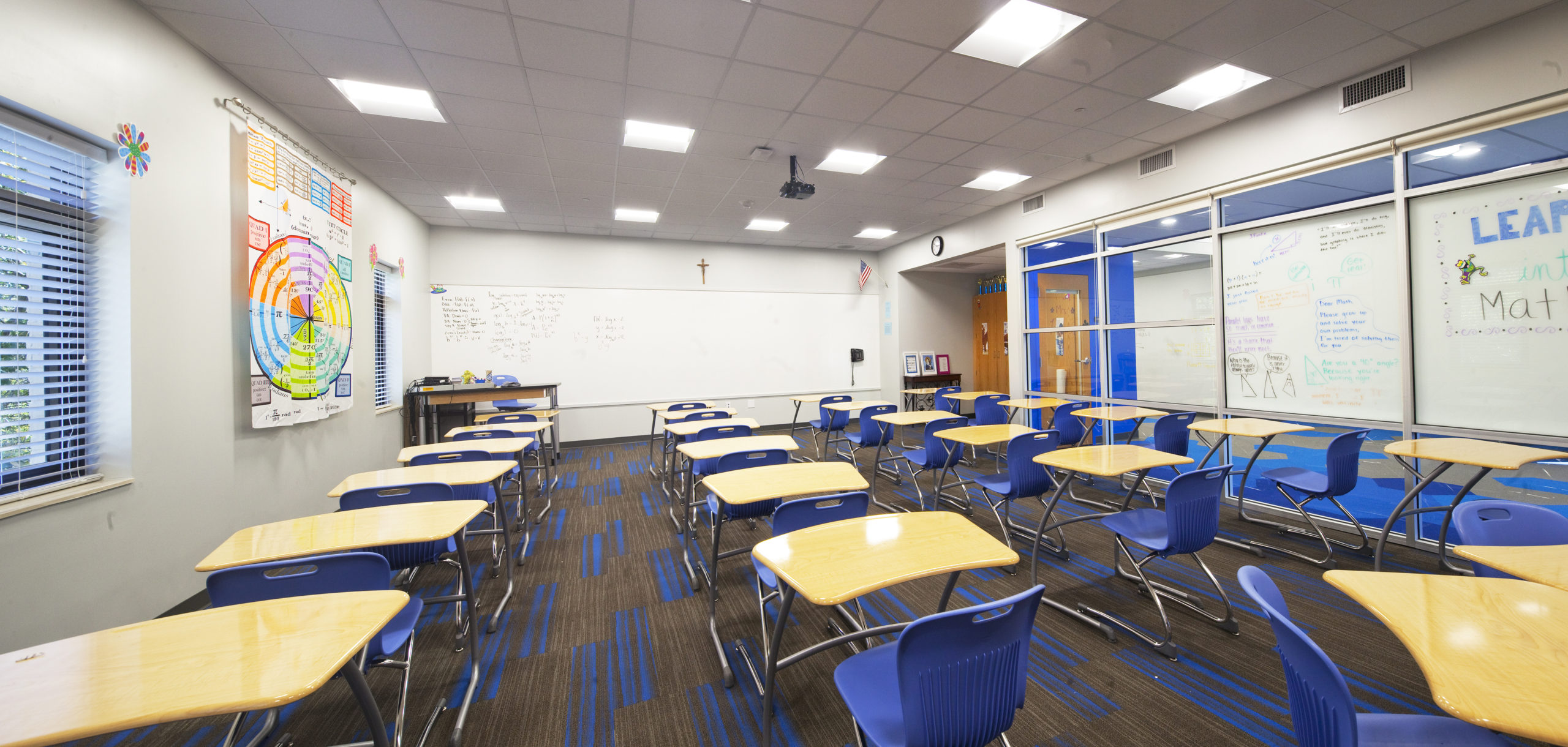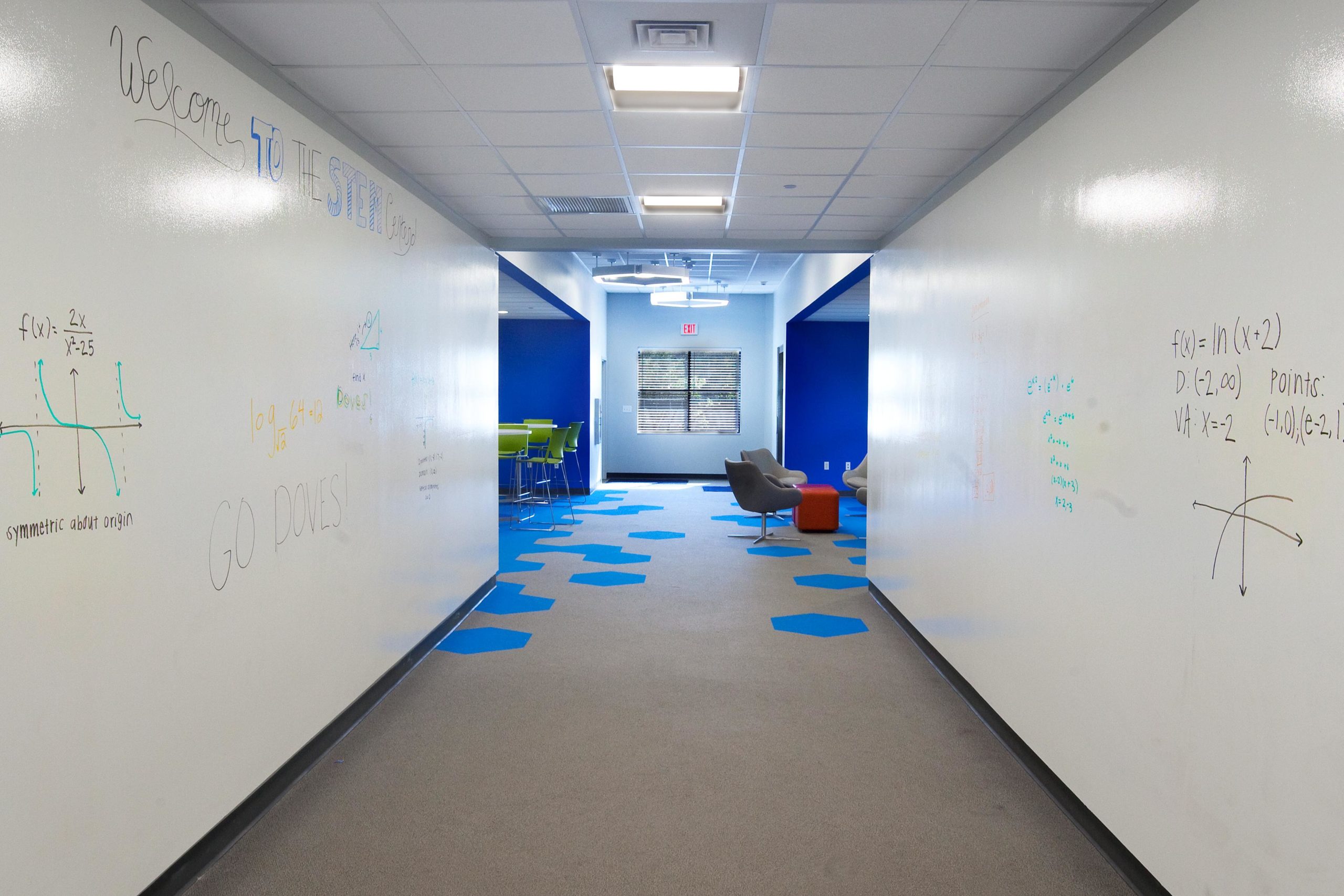 The Benedictine Hall STEM Center at St. Scholastica Academy in Covington, Louisiana, is a renovation at the all-girls Catholic high school that provides a cutting edge collaborative learning environment focused on STEM (Science Technology Engineering & Math). All spaces are considered opportunities for learning. This includes the corridor space, which has been re-envisioned to become the epicenter for collaboration. The space is equipped with widened areas containing comfortable seating and floor-to-ceiling writable wall surfaces. There is also a “maker-space,” which is a flexible workshop learning space that provides hands-on experience through collaborative work, creativity, and problem-solving.