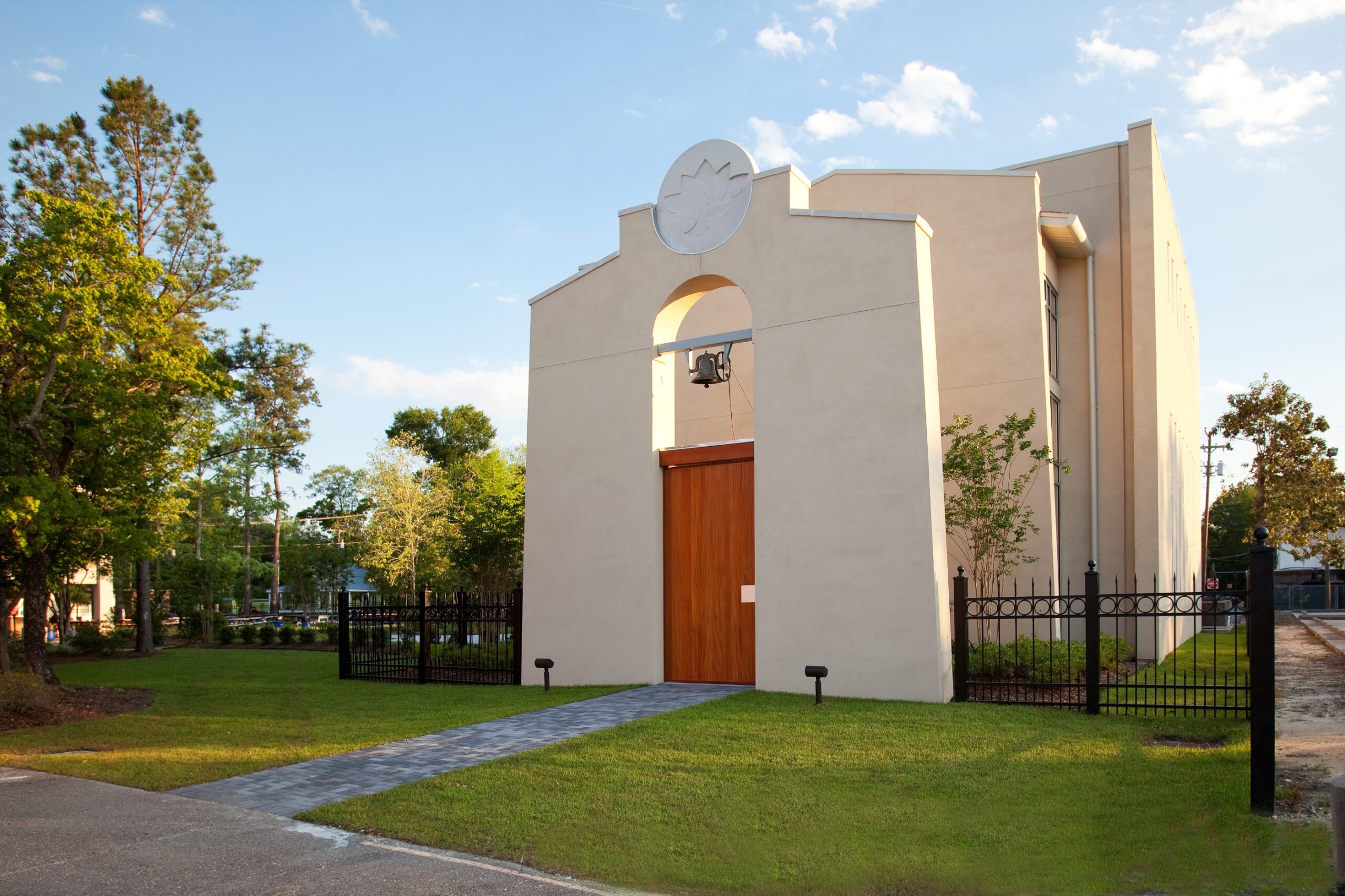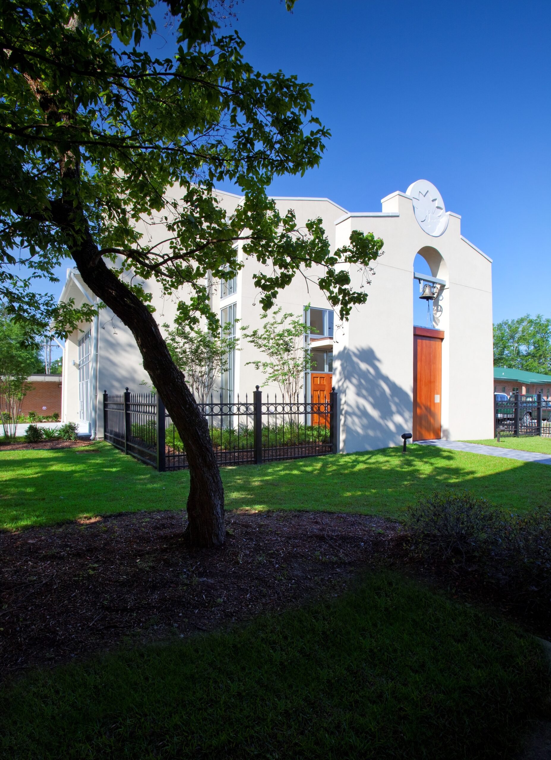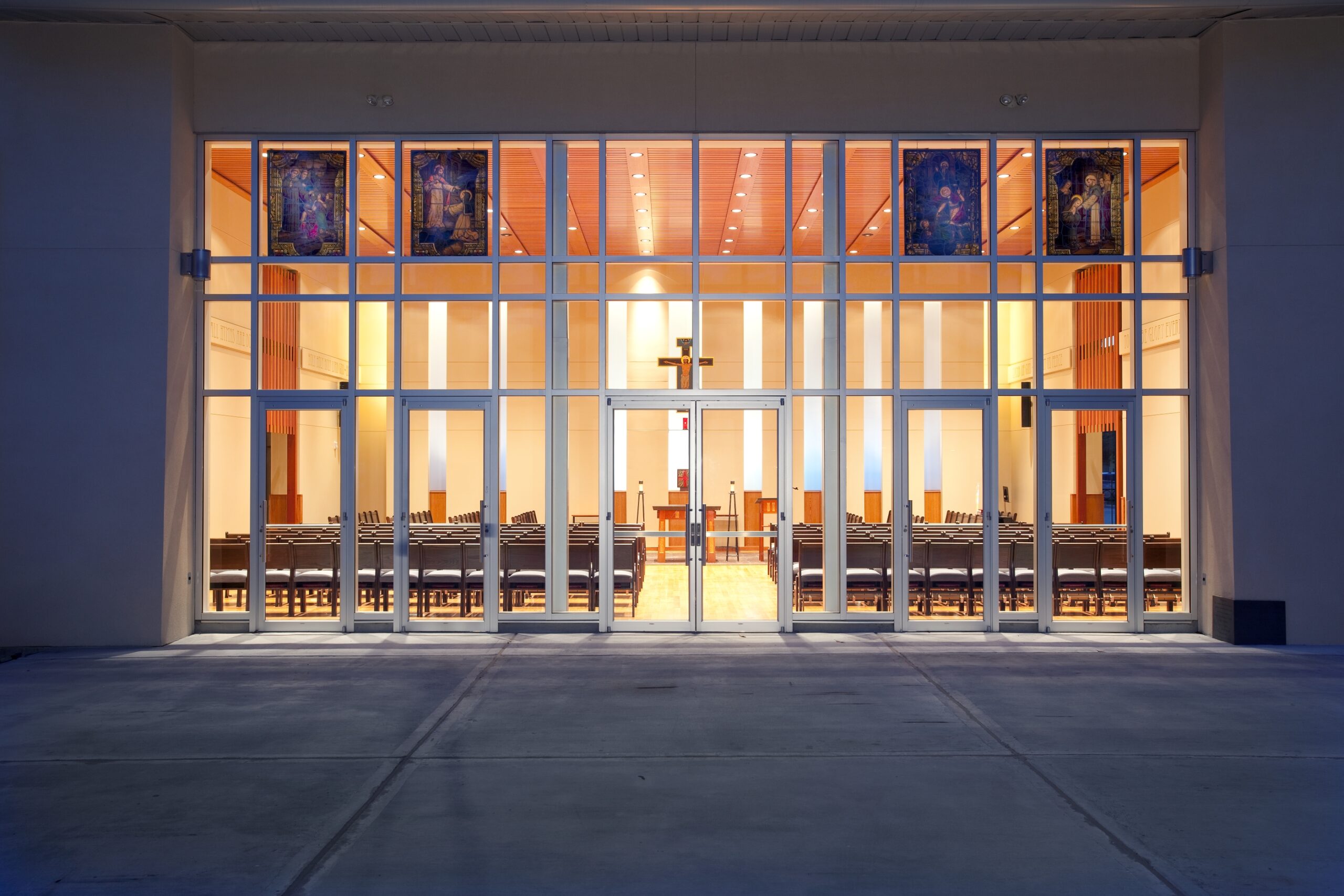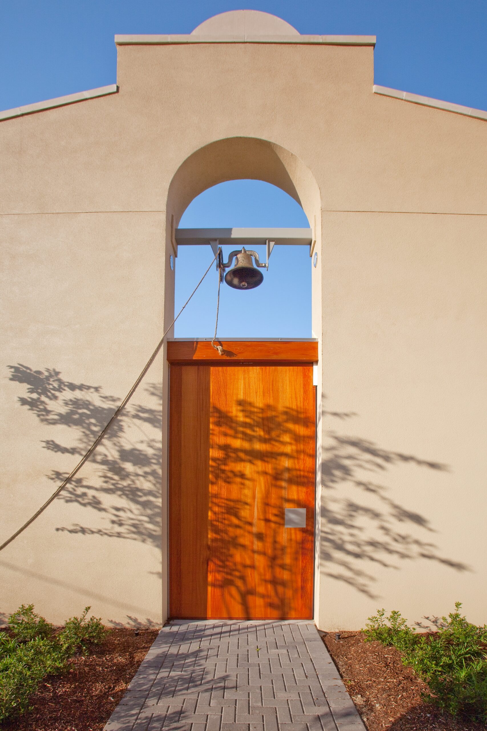 The Chapel is located at the intersection of two main axes on the S.S.A. campus and is a key element to be completed from the recent campus-wide master plan. The chapel entry is aligned with the formal campus entry and developing promenade. Transversely, the orientation of the altar and seating is aligned with the campus green. An expansive glazed wall provides transparent visual access to this green space and plaza. A free-standing wall at the main entry provides a historical reference to the original campus buildings’ architectural language, detailed in the Mission style. Within the wall is a large solid mahogany wood door six feet wide and eleven feet tall. The door operates on a central pivot hinge. This large door provides a significant point of threshold into a small prayer garden surrounding the entry. This prayer garden serves as preparation for the sacred space to come.