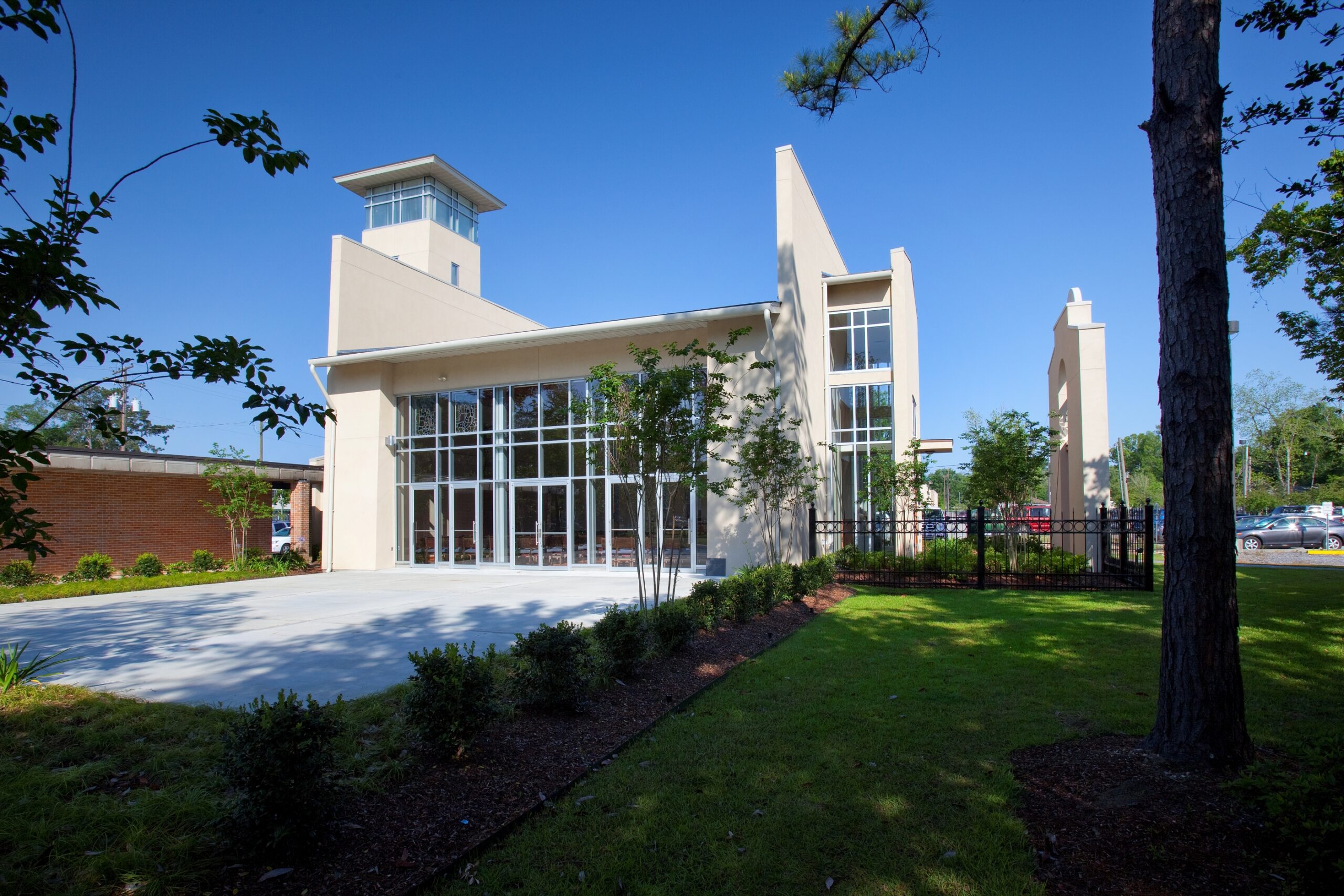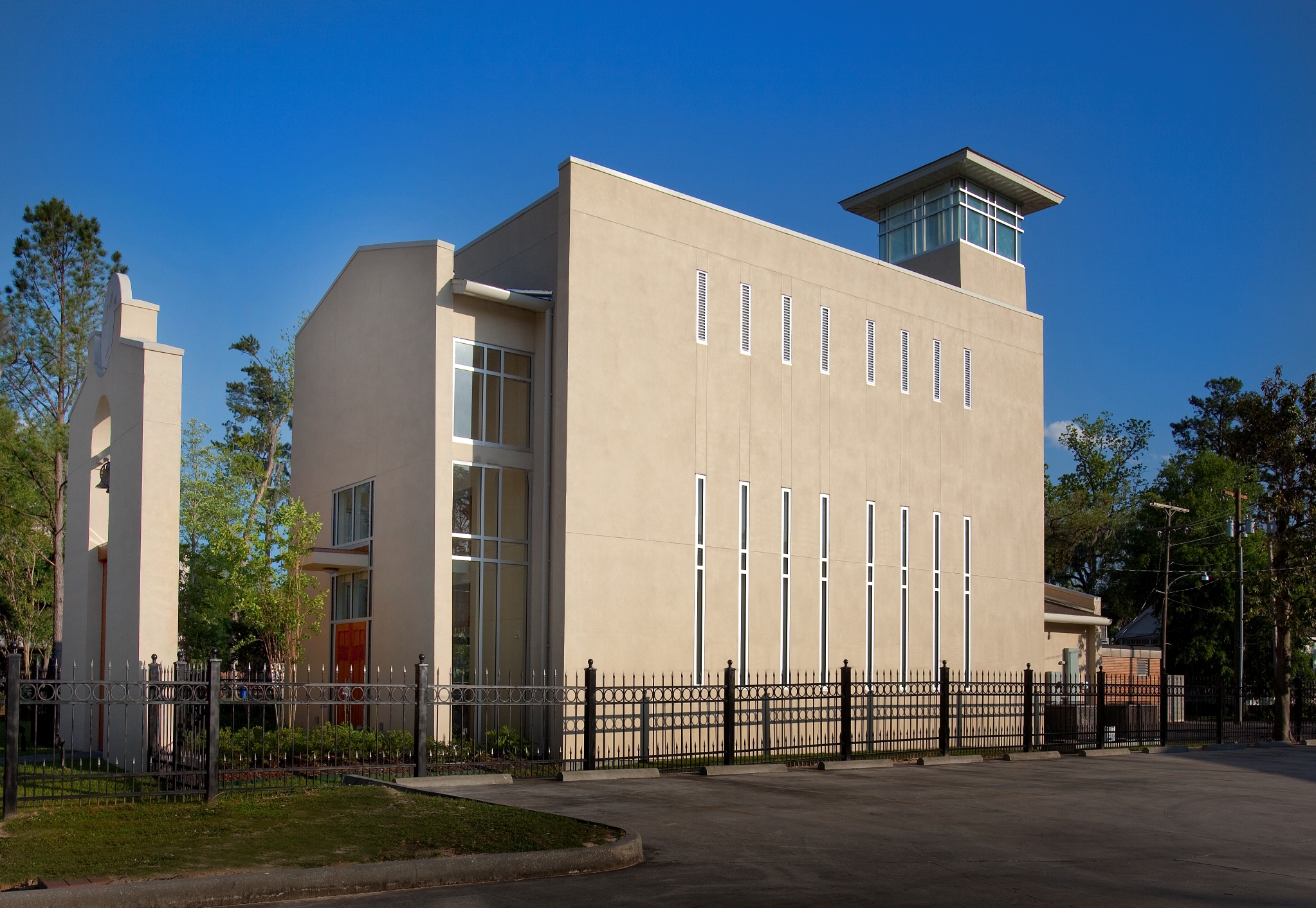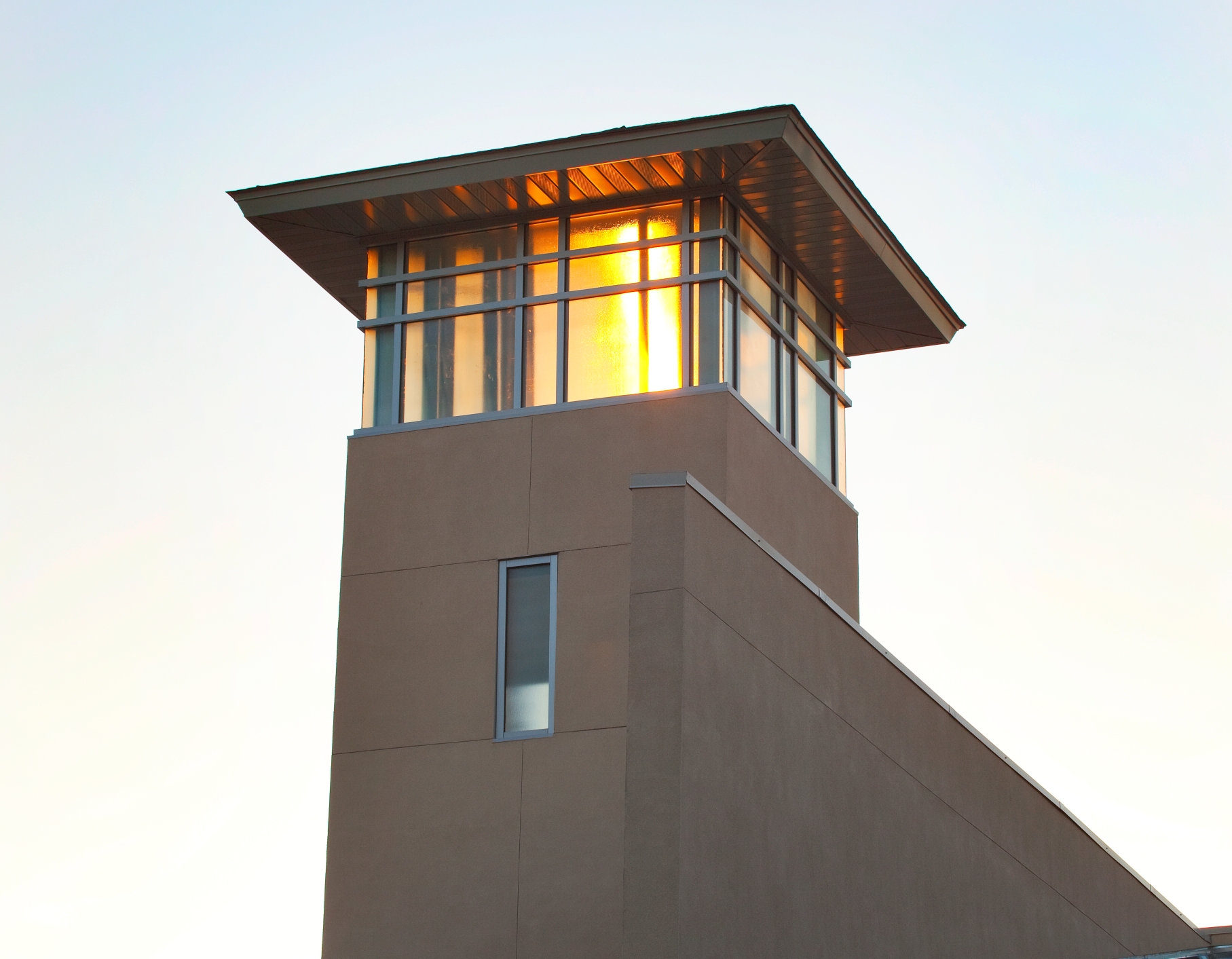Finishes within the Chapel are simple yet refined. The monolithic plastered interior walls are sculpted with a ribbon of scripture passages. The minimally detailed walls are balanced with a warmth of strip wood floors and ceilings. The west wall behind the altar is a catcher of indirect sunlight. Ten plaster monoliths are separated in series across the face of the wall and allow a blue hue to emanate from in between. The blue hue is created from a reflection of a blue painted surface behind each of the monoliths. A narrow slit of clear glass is positioned directly behind each of the monoliths. Neither the blue painted surface or the slit of glass can be seen directly from within the space. The effect is a subtle ghostly reflection offering a spiritual quality to the space.
