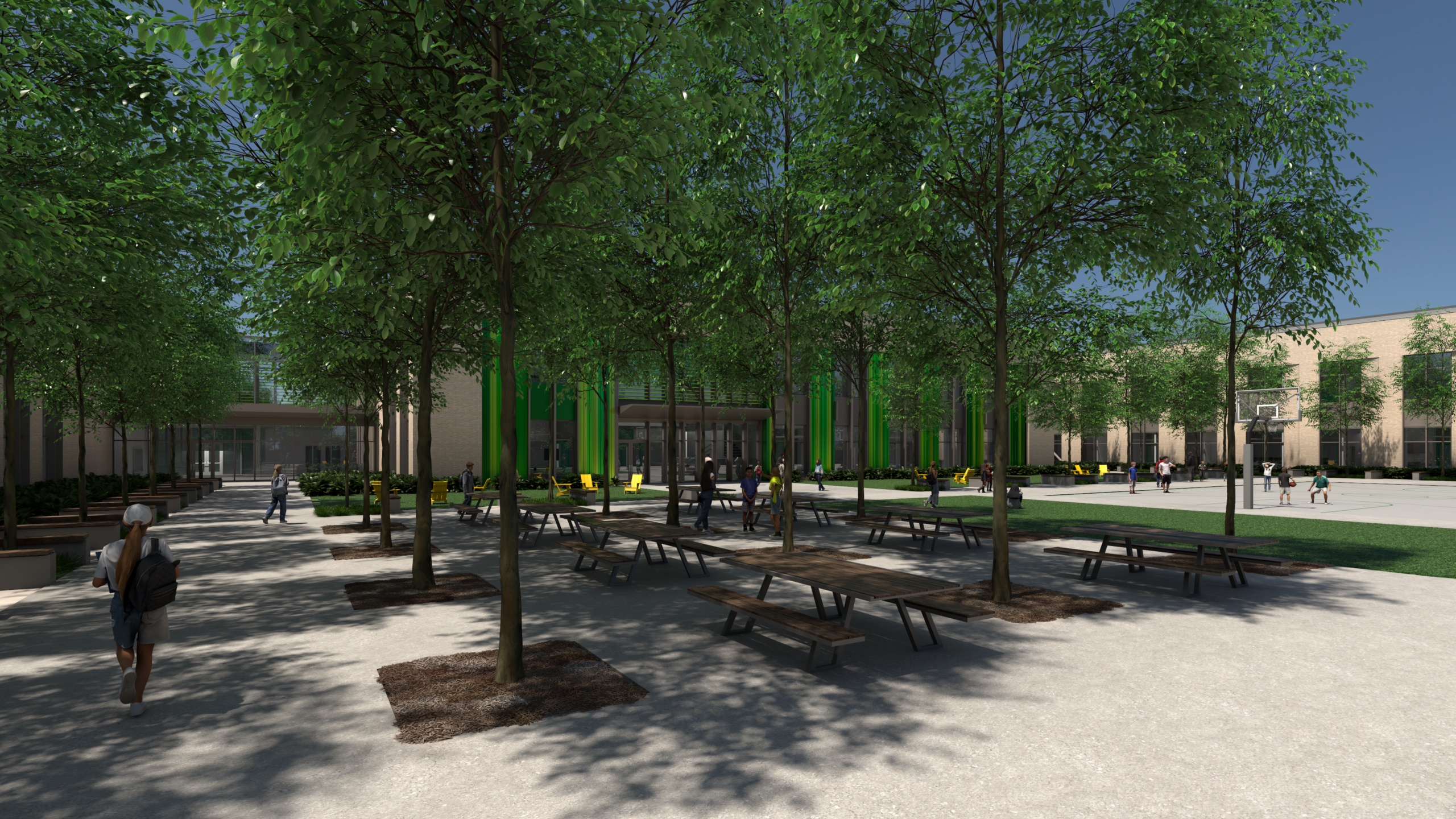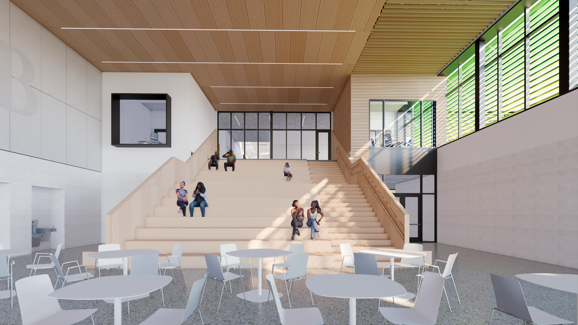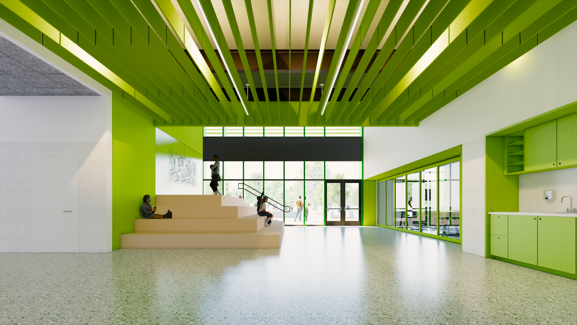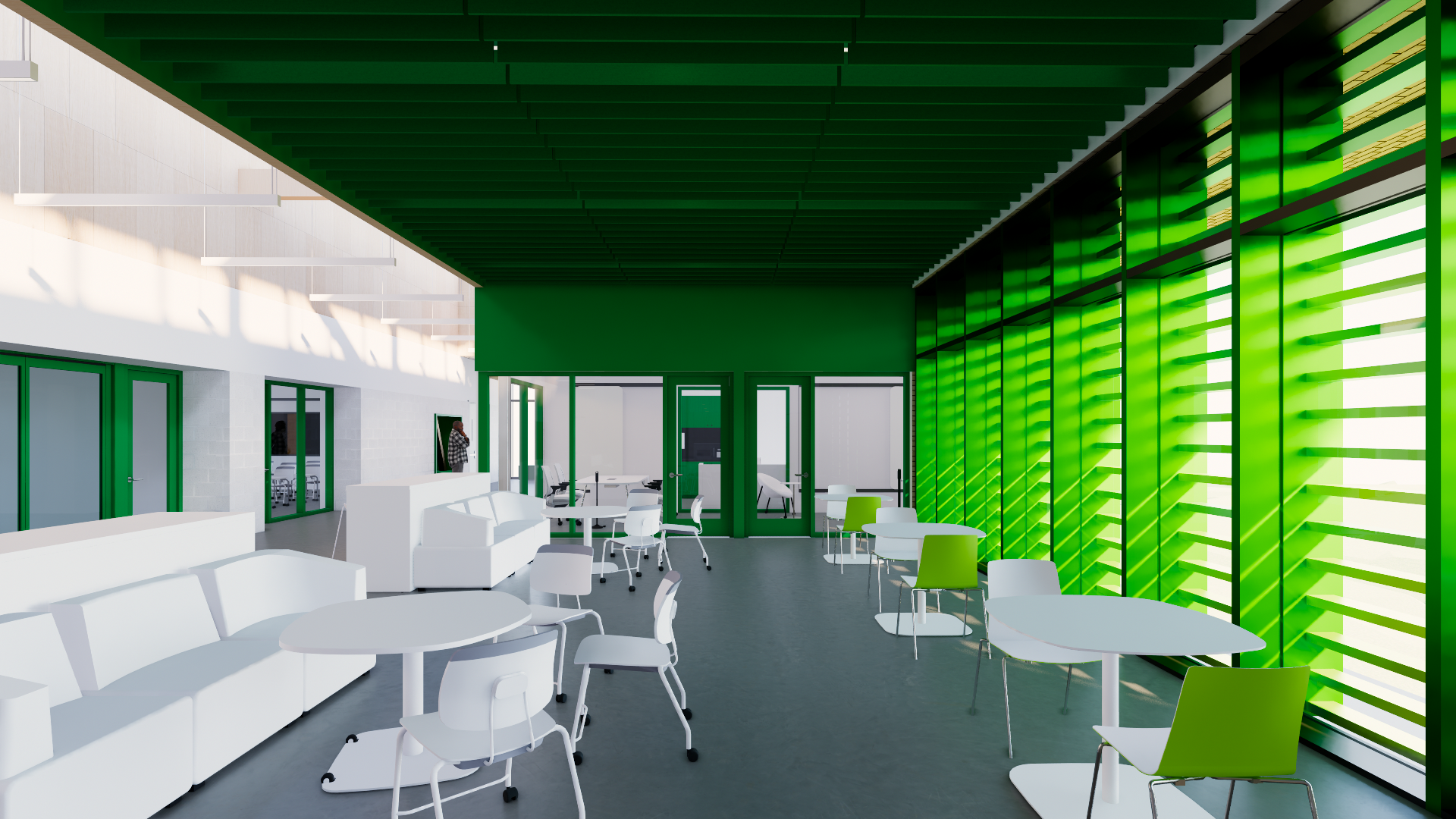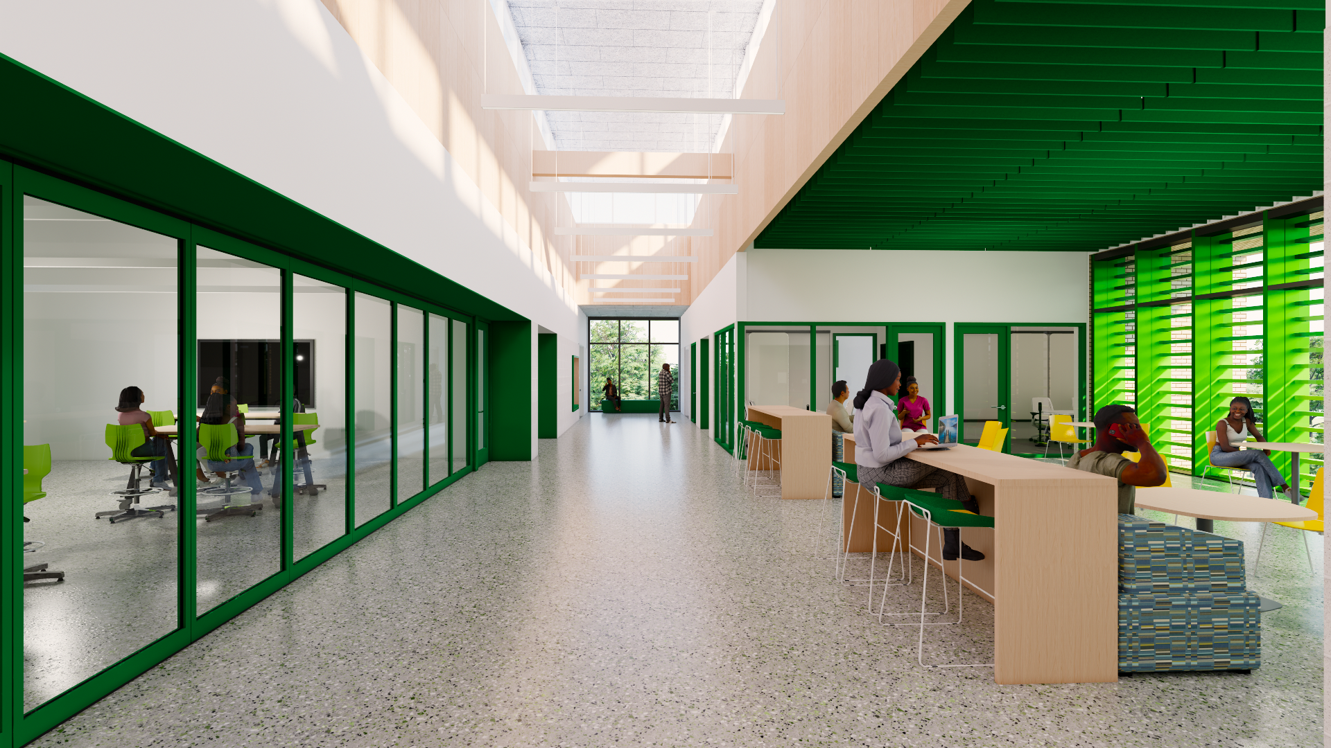 Sustainability is embedded throughout the project. The design leverages solar orientation for daylighting, employs durable and environmentally conscious materials, incorporates bioswales and native landscaping, and prioritizes indoor air quality. The building itself is envisioned as a teaching tool demonstrating best practices in wellness, stewardship, and environmental design.