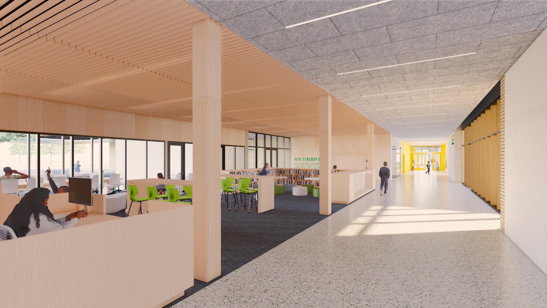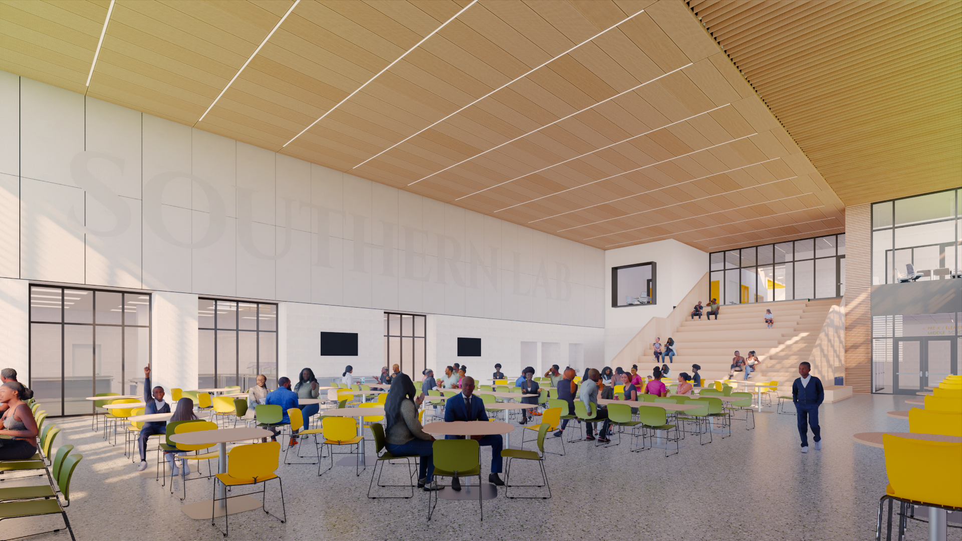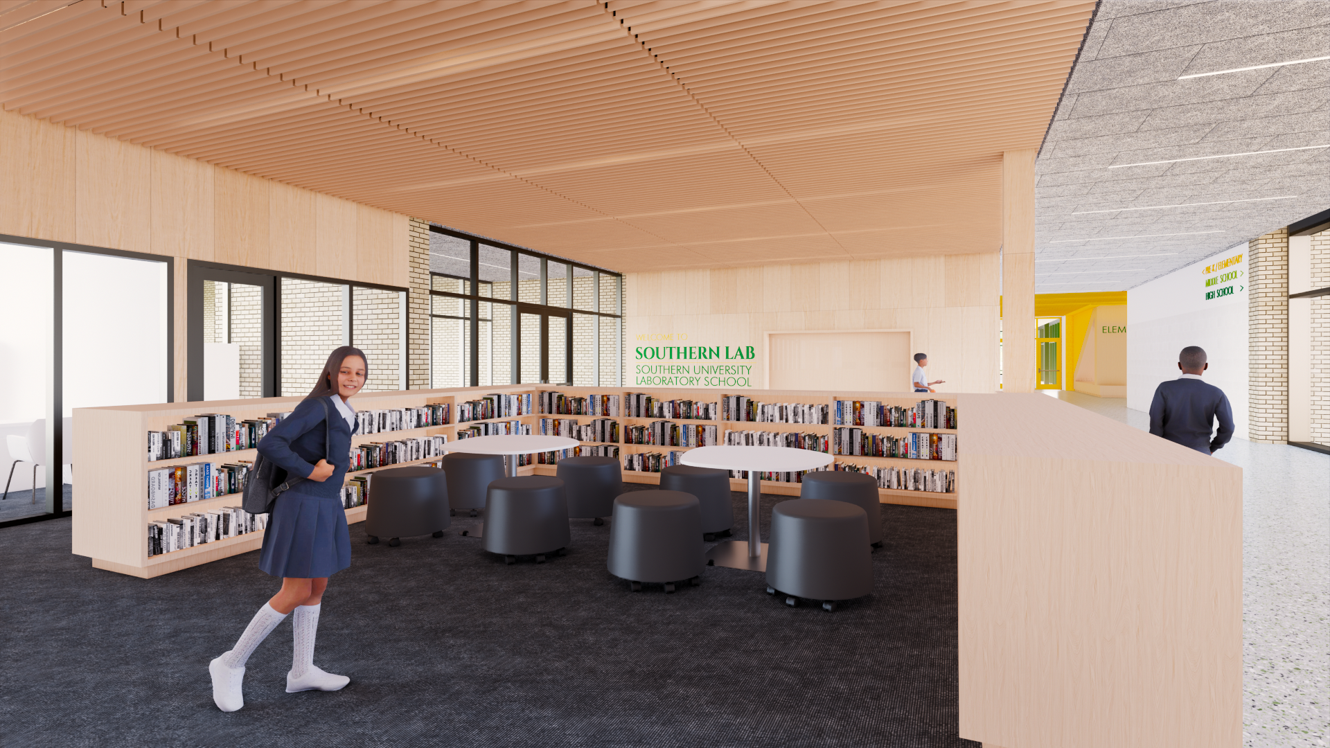 The new Southern University Laboratory School (Southern Lab) is a 120,000 sq. ft., next-generation K–12 academic facility located on the campus of Southern University in Baton Rouge. Developed through an intensive educational visioning process with school leadership, faculty, alumni, and students, the design is rooted in 21st-century learning principles placing collaboration, flexibility, and project-based learning at the center of every decision. Organized into three distinct two-story academic wings (elementary, middle, and high school) the campus integrates centralized collaboration areas, layered small group rooms, and a media library that activates the main corridor. Shared spaces such as a multipurpose cafeteria/black box theater, open administrative zones, and a large social stair create a dynamic, inclusive environment that supports both academic and community life.