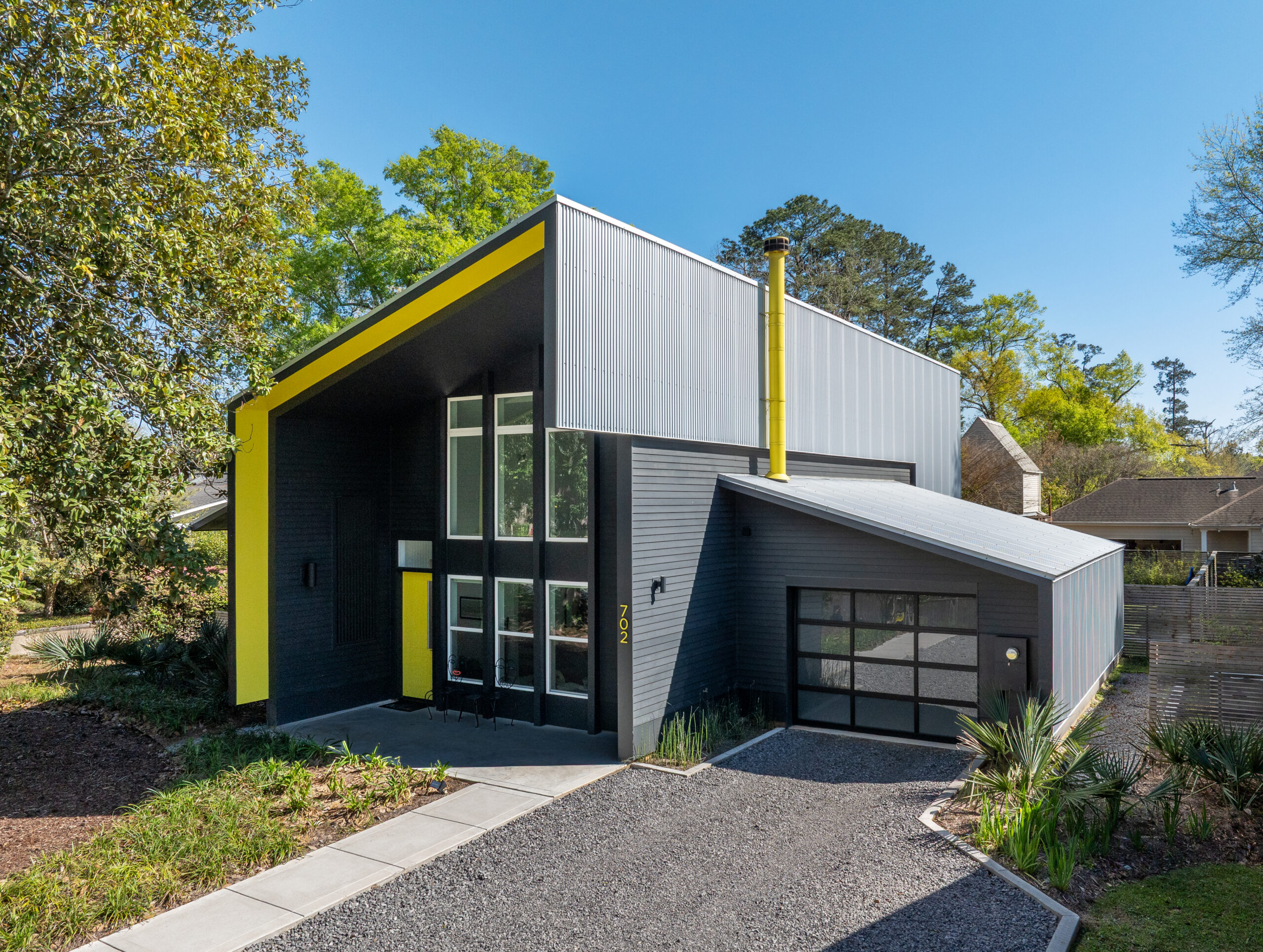 To preserve the magnolia, the bifurcated plan shifts toward the southwest, allowing the structure to settle around the tree. A continuous shed roof extends from the eastern sleeping wing upward to the west, creating volume for the loft and transitioning into a single-car carport along the west façade. The corrugated metal roof folds down along the east and west elevations, reinforcing the clarity of the form while supporting passive solar performance. Openings are oriented north and south, paired with generous overhangs that create shaded front and rear porches and protect interior spaces from direct sunlight.